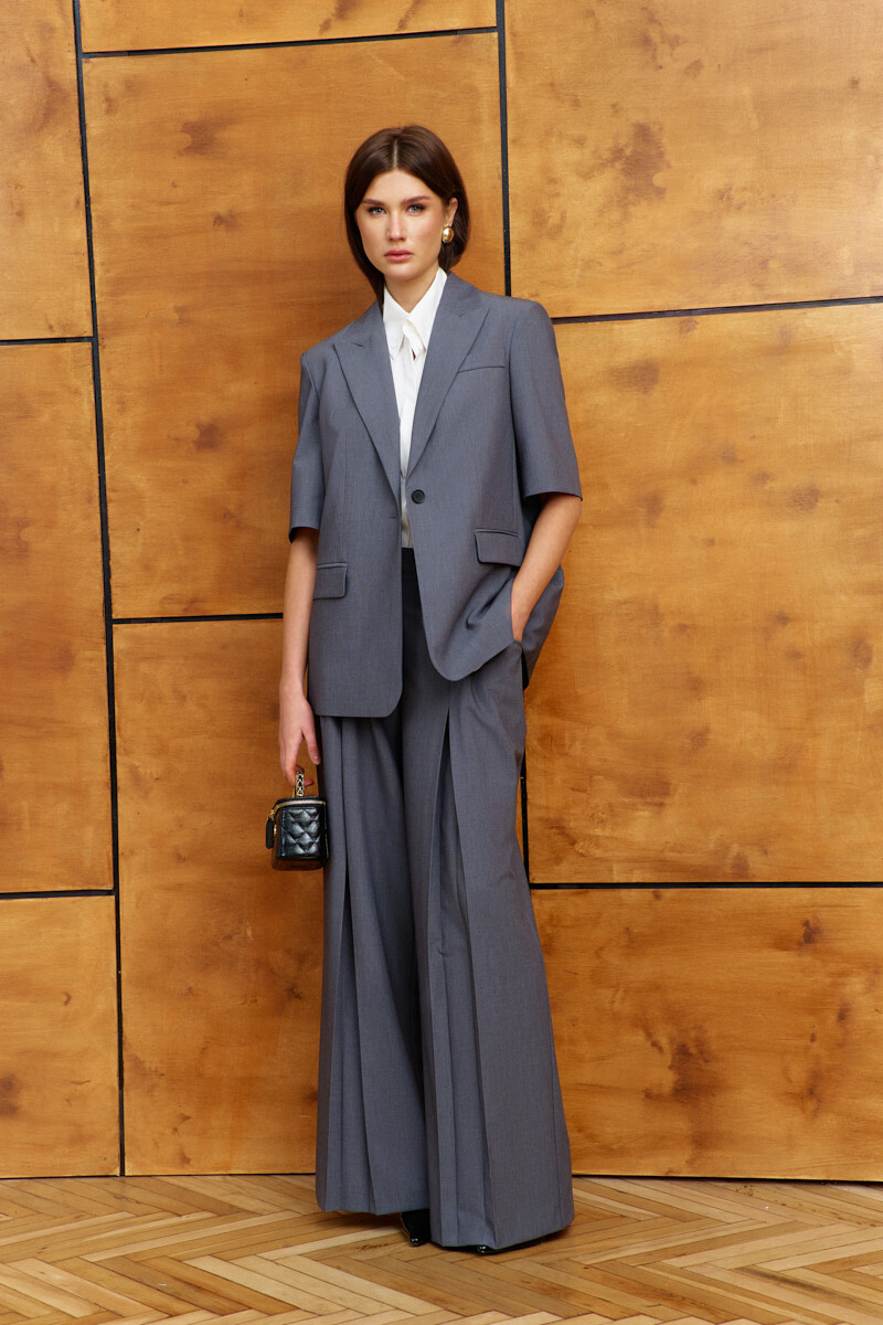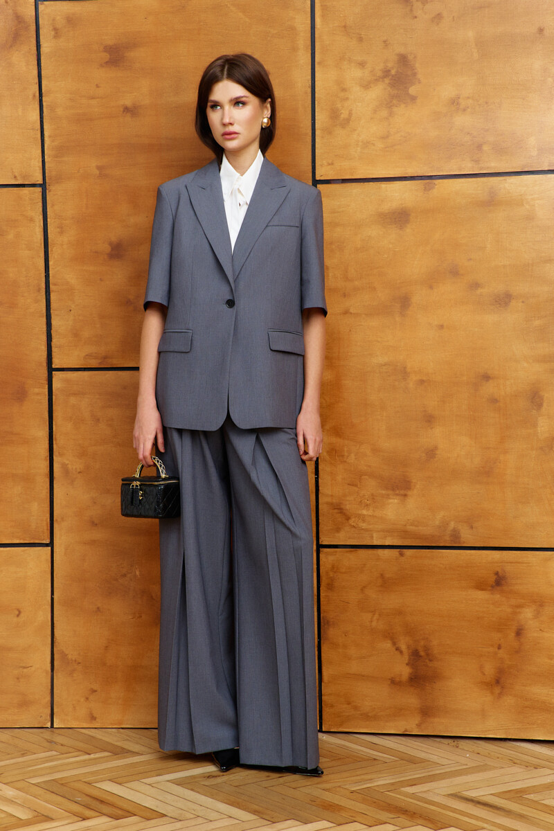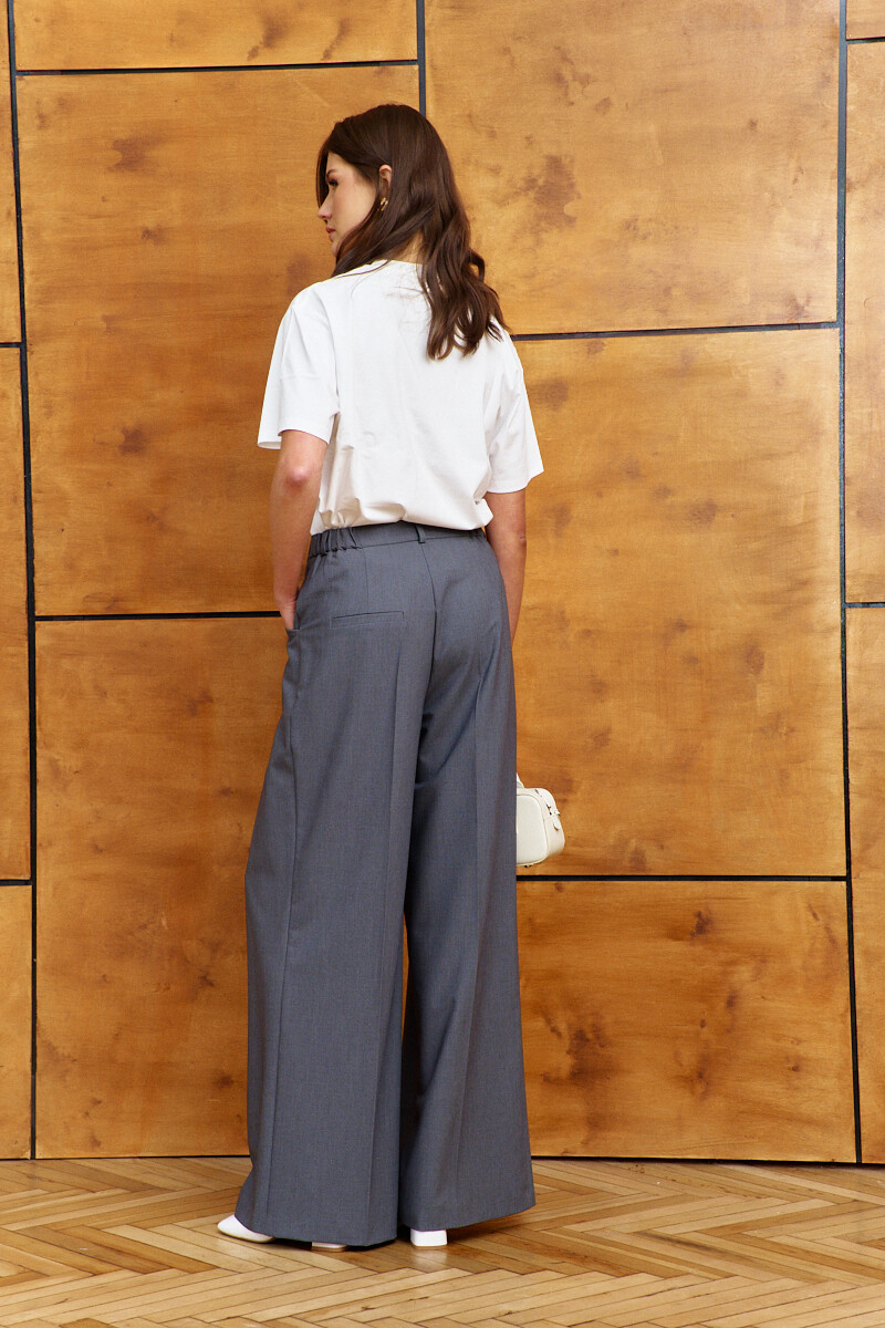 Элегантные брюки выполнены из костюмного полотна. Модель с комфортной высокой посадкой; на притачном поясе со шлёвками и эластичной лентой внутри по спинке; застежкой на тесьму "молнию" и потайной брючный крючок. Спереди предусмотрены косые боковые карманы, вход кармана сверху перекрывается складкой и по середине встречная складка. На задней части половин брюк выполнен декоративный прорезной карман «с листочкой». Длина изделия по боковому (с поясом) 113 см.