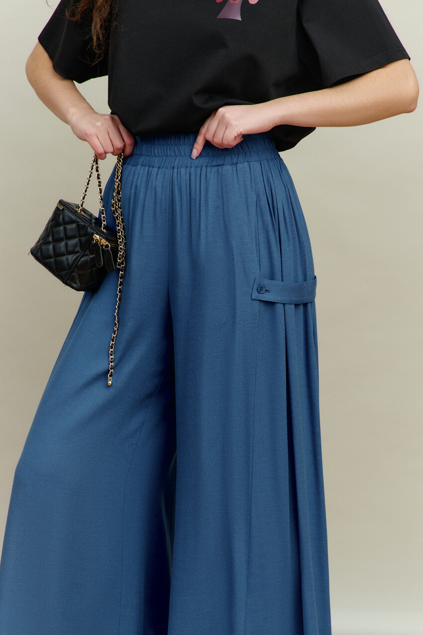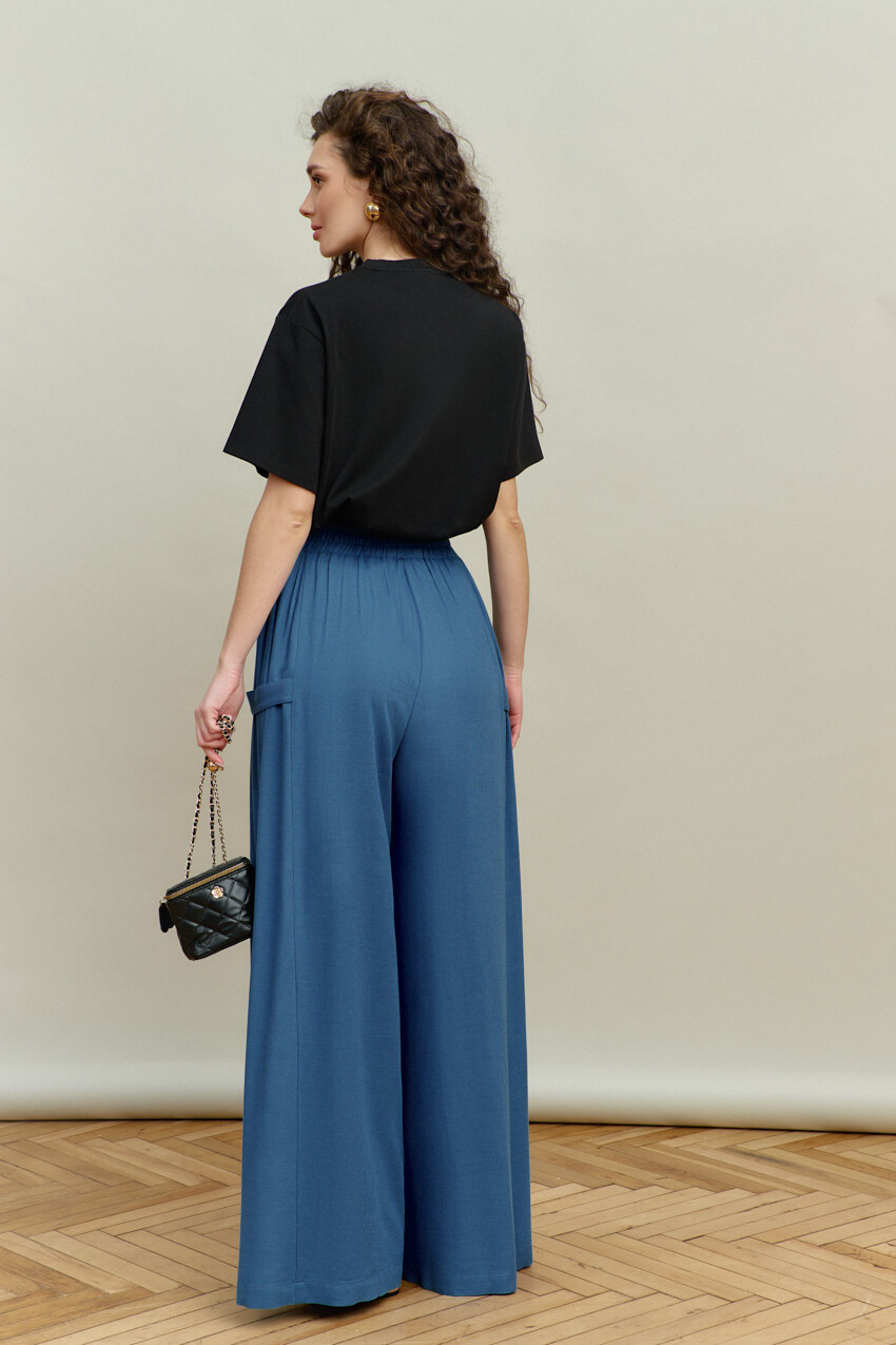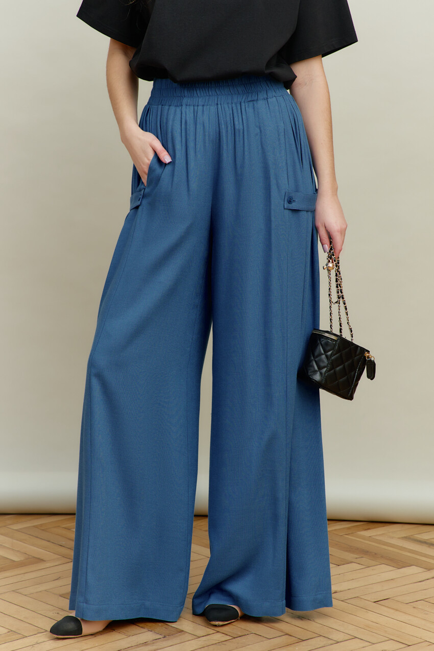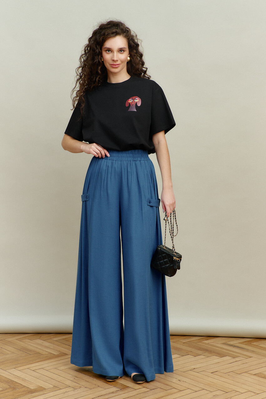Широкие брюки-палаццо выполнены из хлопкового полотна. Модель полуприлегающего силуэта с комфортной высокой посадкой, на притачном поясе с эластичной тесьмой между слоями. Особым декоративным элементом являются широкие вставки (присборенными по верхнему срезу) по боковым швам и с притачными застёгивающимися патами на петлю и декоративную пуговицу. Для удобства в носке предусмотрены спереди карманы в швах. Длина изделия (с поясом) 114 см.