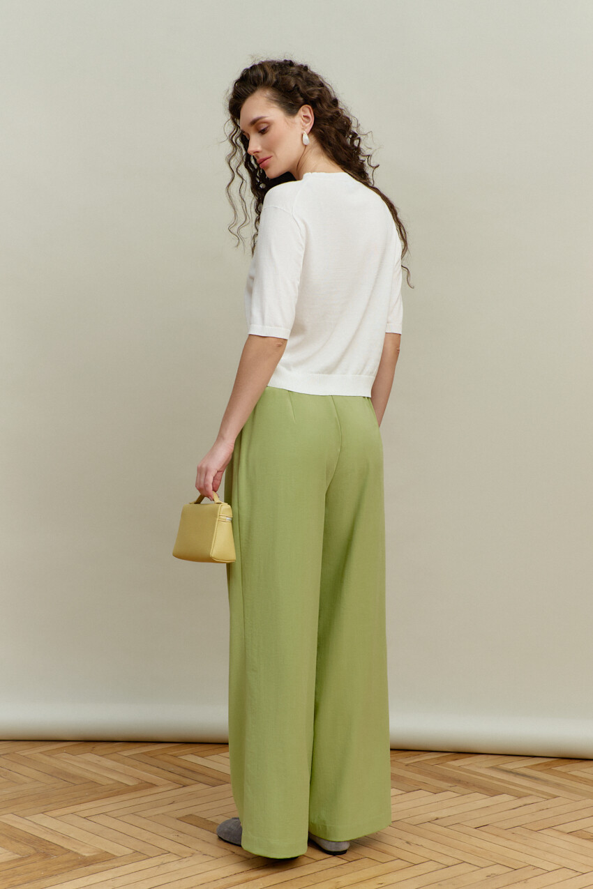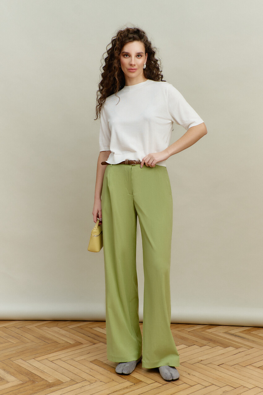 Классические свободные брюки выполнены из костюмного полотна. Модель полуприлегающего силуэта с комфортной высокой посадкой и цельнокроеным поясом со шлёвками и эластичной лентой внутри; застёгивающимся на потайной брючный крючок. Для удобства в носке спереди предусмотрены прорезные карманы «с листочкой» и застёжка на тесьму "молнию". Длина изделия по боковому шву 107 см.