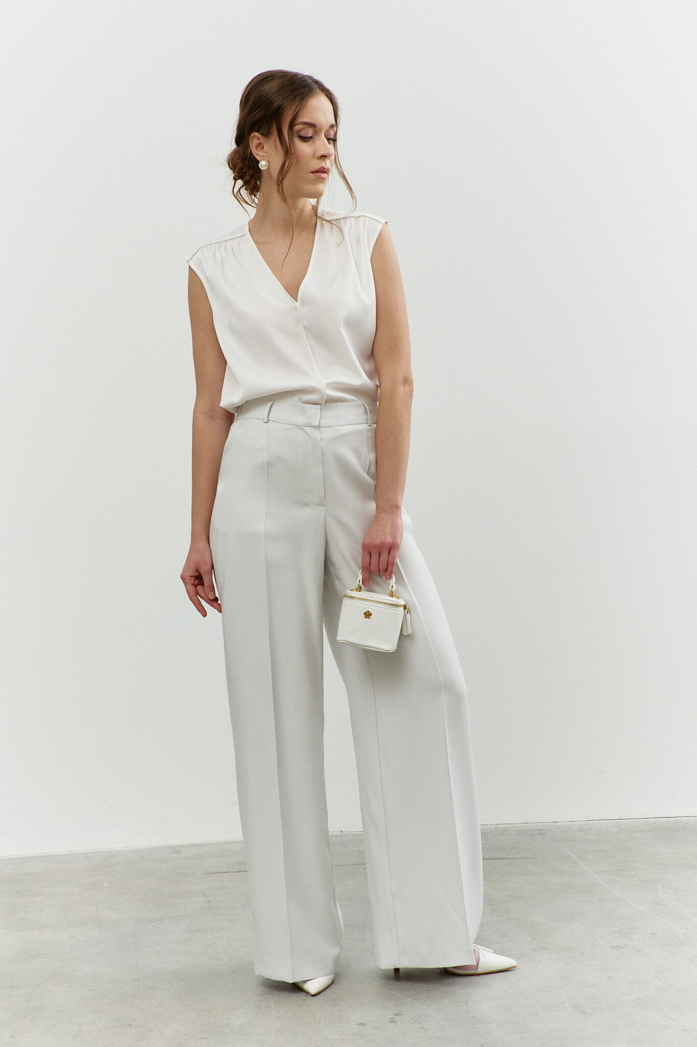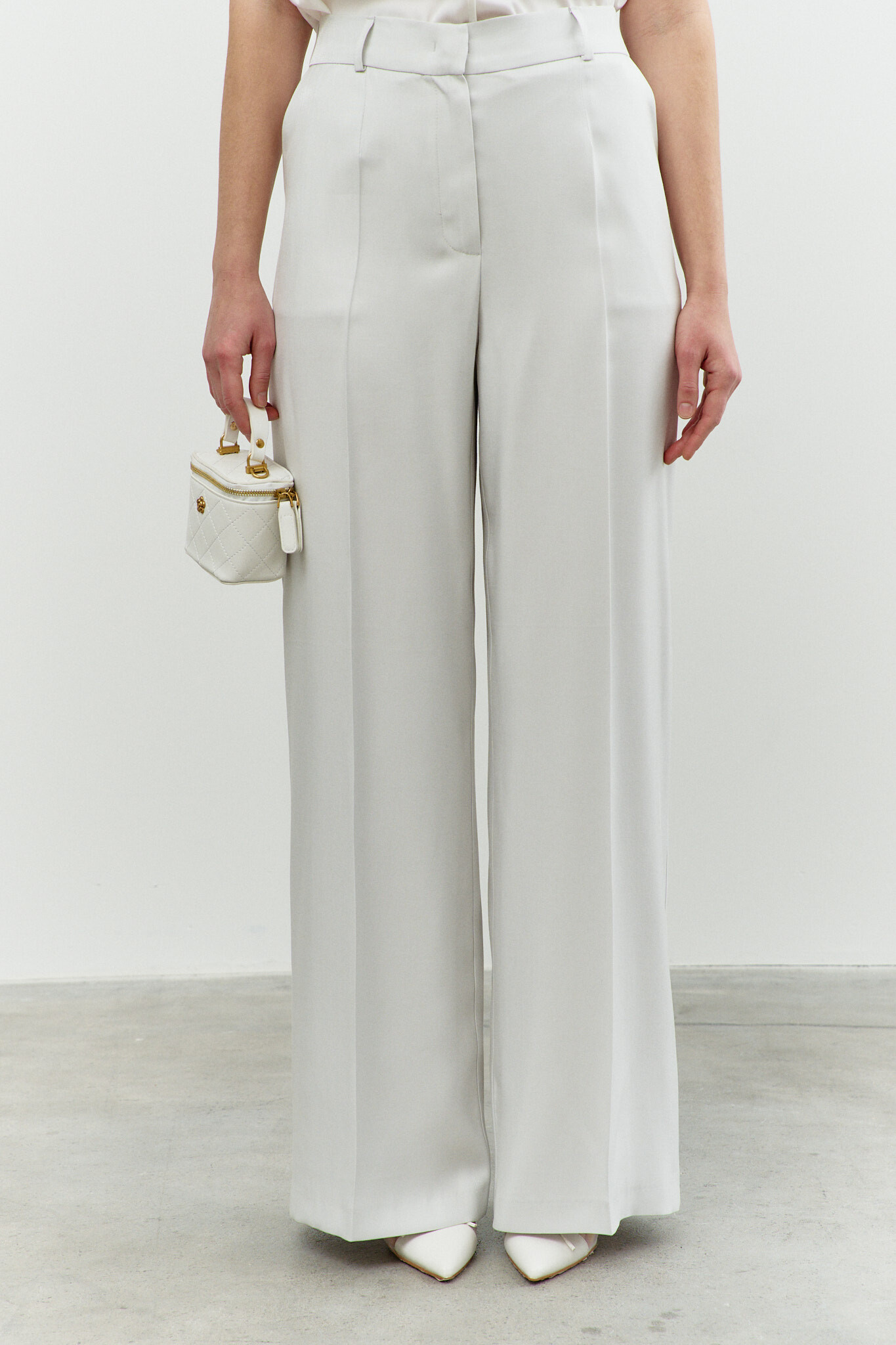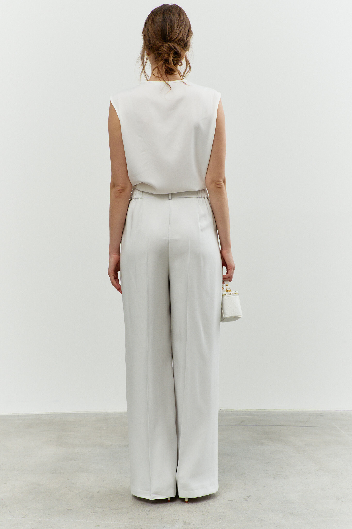 Классические свободные брюки в стиле city chic выполнены из костюмного полотна. Модель с комфортной высокой посадкой, на притачном поясе со шлевками и эластичной лентой внутри по спинке, застегивающимся на потайной брючный крючок. Спереди предусмотрены косые карманы и застёжка на тесьму «молнию». Длина изделия по боковому шву (с поясом) 115 см.