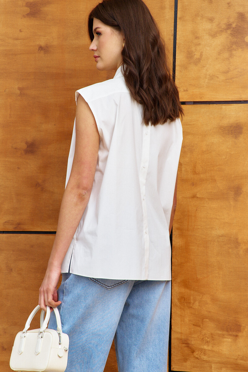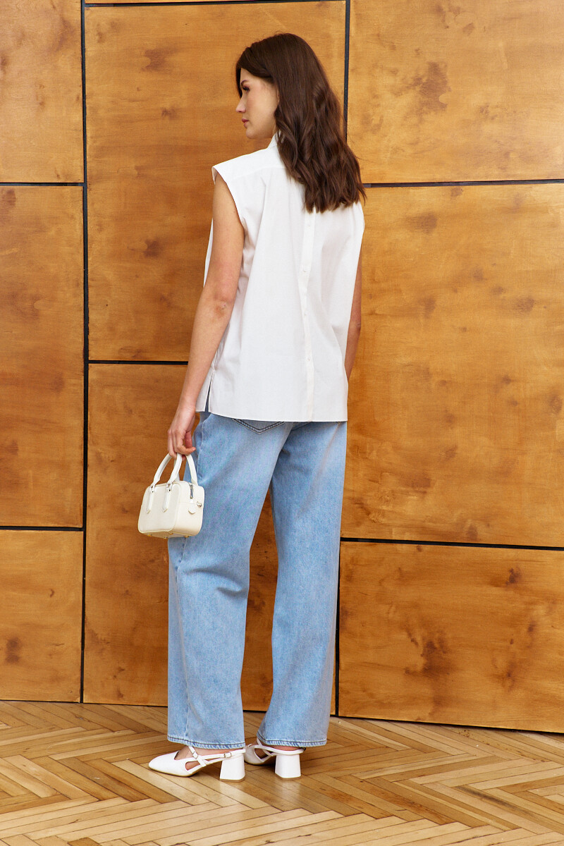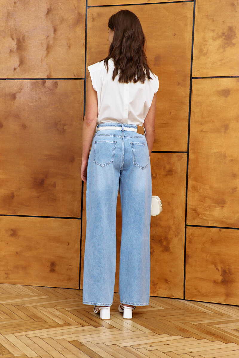 Брюки в стиле smart casual выполнены из хлопкового джинсового полотна. Модель с комфортной высокой посадкой на притачном поясе со шлёвками и застёгивающемся на декоративную пуговицу. Спереди предусмотрены карманы с отрезным бочком и застёжка на "молнию", сзади накладные карманы. Модель декорирована наличием отделочных строчек. Длина изделия по боковому шву (с поясом) 108 см.