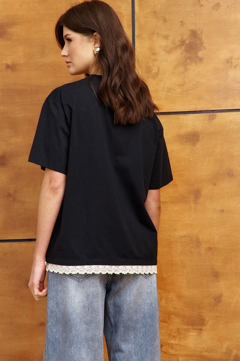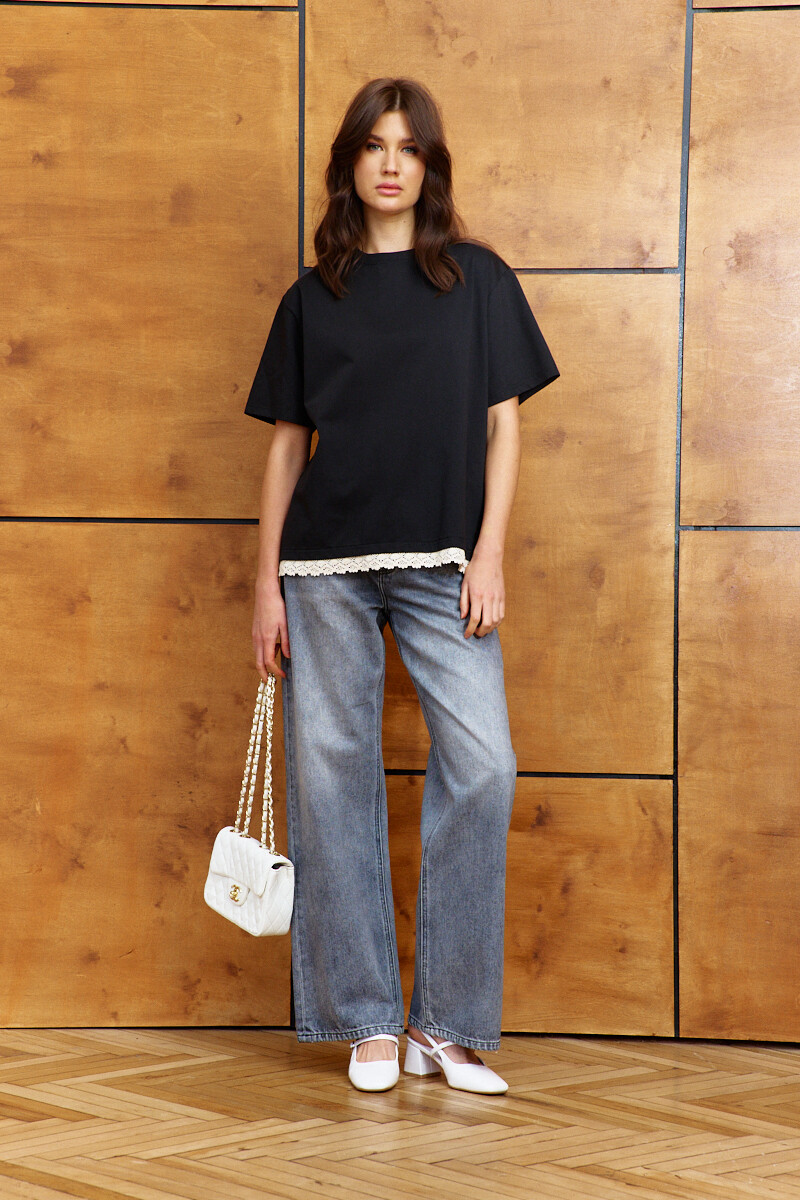 Джемпер выполнен из хлопкового трикотажного полотна высокого качества, обладающего рядом положительных свойств: мягкость, эластичность и устойчивость к деформации. Модель свободного кроя, со спущенной линией плеча и коротким рукавом. Горловина обработана узкой бейкой, а по спинке усилена тесьмой с целью предотвращения ее деформации. особый вид изделию придаеткружево по низу изделия. Длина по спинке 66 см; длина рукава (от горловины) 39,5 см.