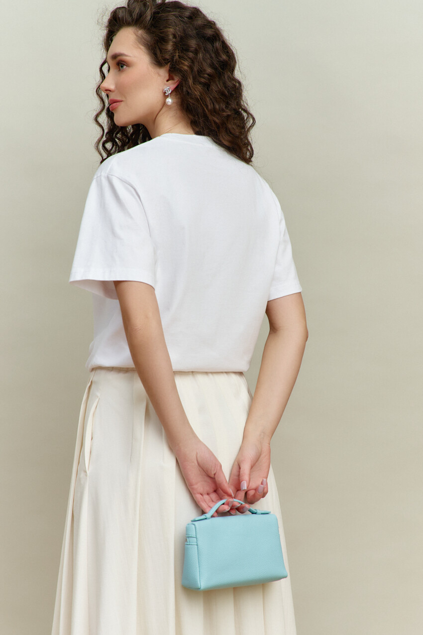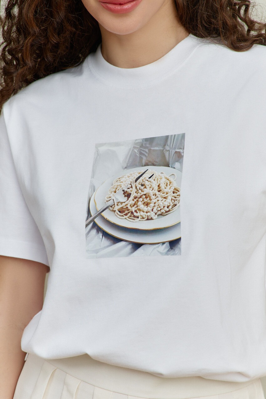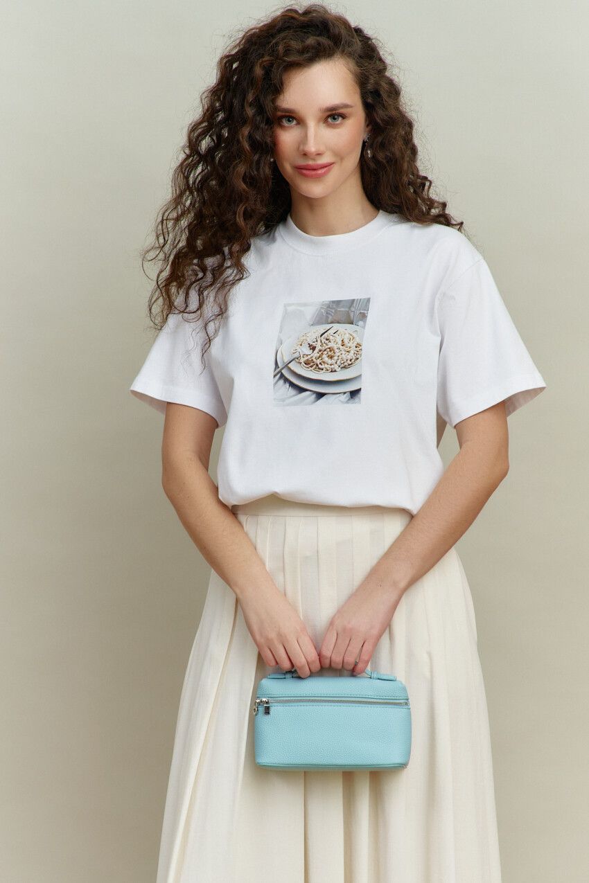 Джемпер выполнен из хлопкового трикотажного полотна высокого качества, обладающего рядом положительных свойств: мягкость, эластичность и устойчивость к деформации. Модель свободного кроя, со спущенной линией плеча и коротким рукавом. Горловина обработана узкой бейкой, а по спинке усилена тесьмой с целью предотвращения ее деформации. Особый вид изделию придает декоративная печать. Длина по спинке 66 см; длина рукава (от горловины) 39,5 см.