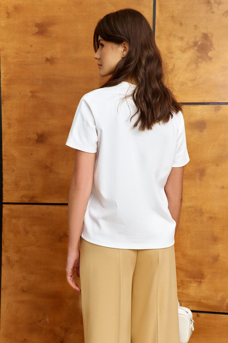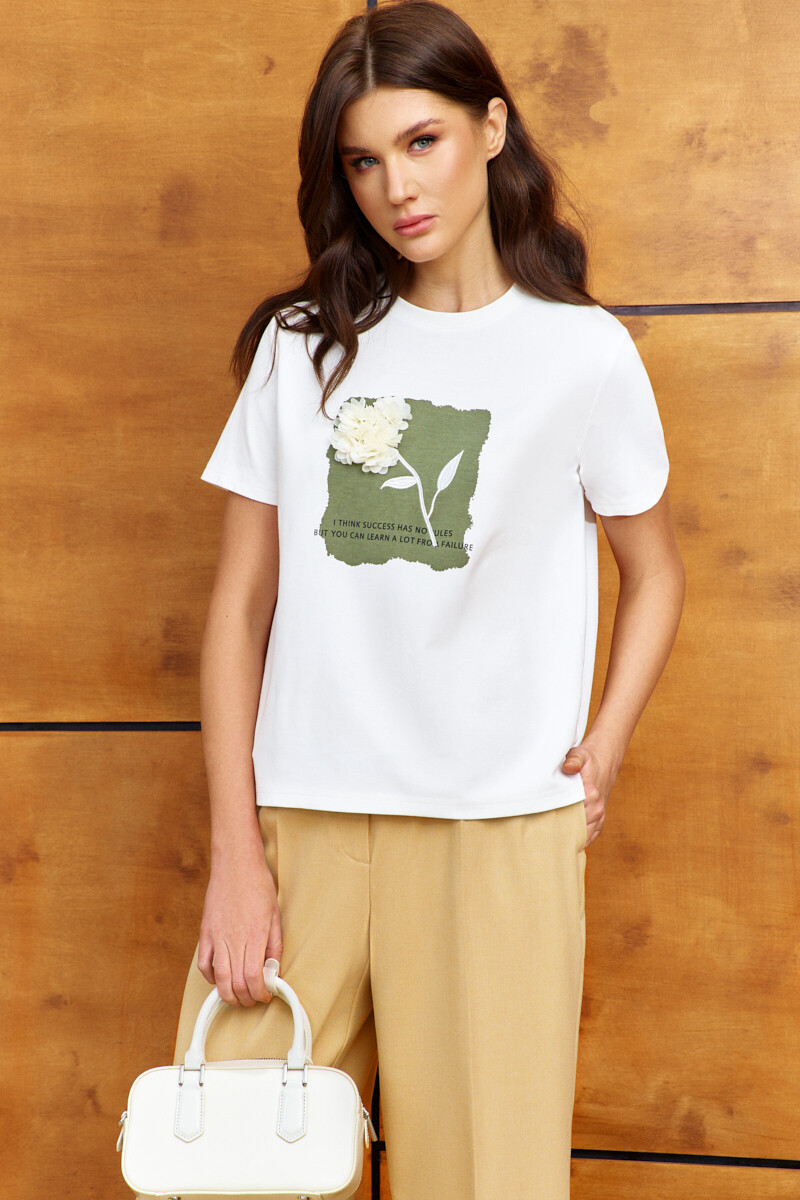 Джемпер выполнен из хлопкового трикотажного полотна высокого качества, обладающего рядом положительных свойств: мягкость, эластичность и устойчивость к деформации. Модель свободного кроя, со спущенной линией плеча и коротким рукавом. Горловина обработана узкой бейкой, а по спинке усилена тесьмой с целью предотвращения ее деформации. Деталь переда декорирована авторской дизайнерской печатью. Длина по спинке 66 см; длина рукава (от горловины) 39,5 см.