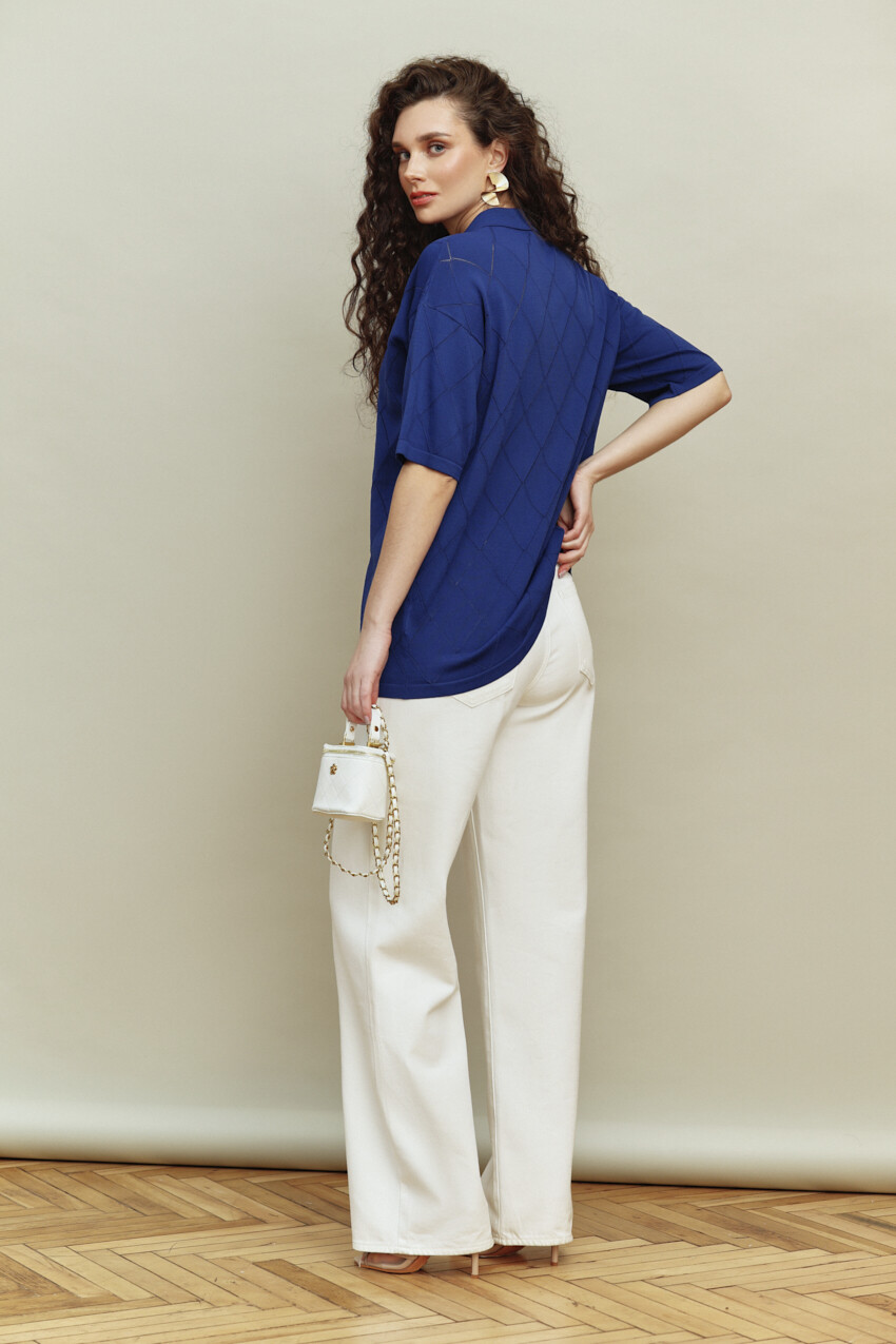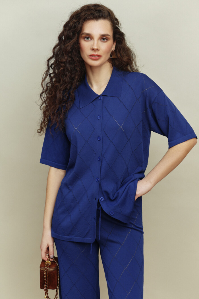 Трикотажный кардиган с актуальным дизайном "ромбы". Воротник отложной на стойке и планкой спереди на петли и декоративные пуговицы. Короткие рукава и низ изделия оформлен манжетой в виде узкой резинки. Длина изделия 72 см, длина рукава 22 см.