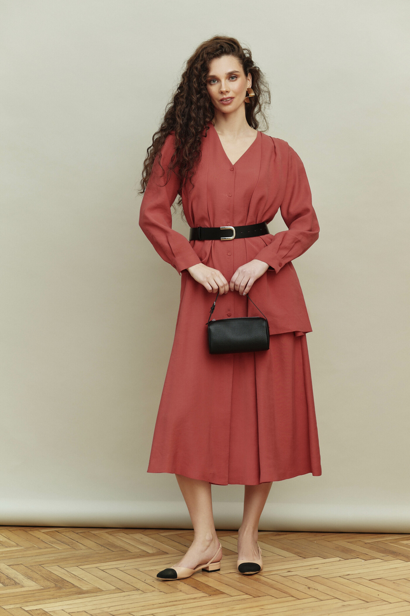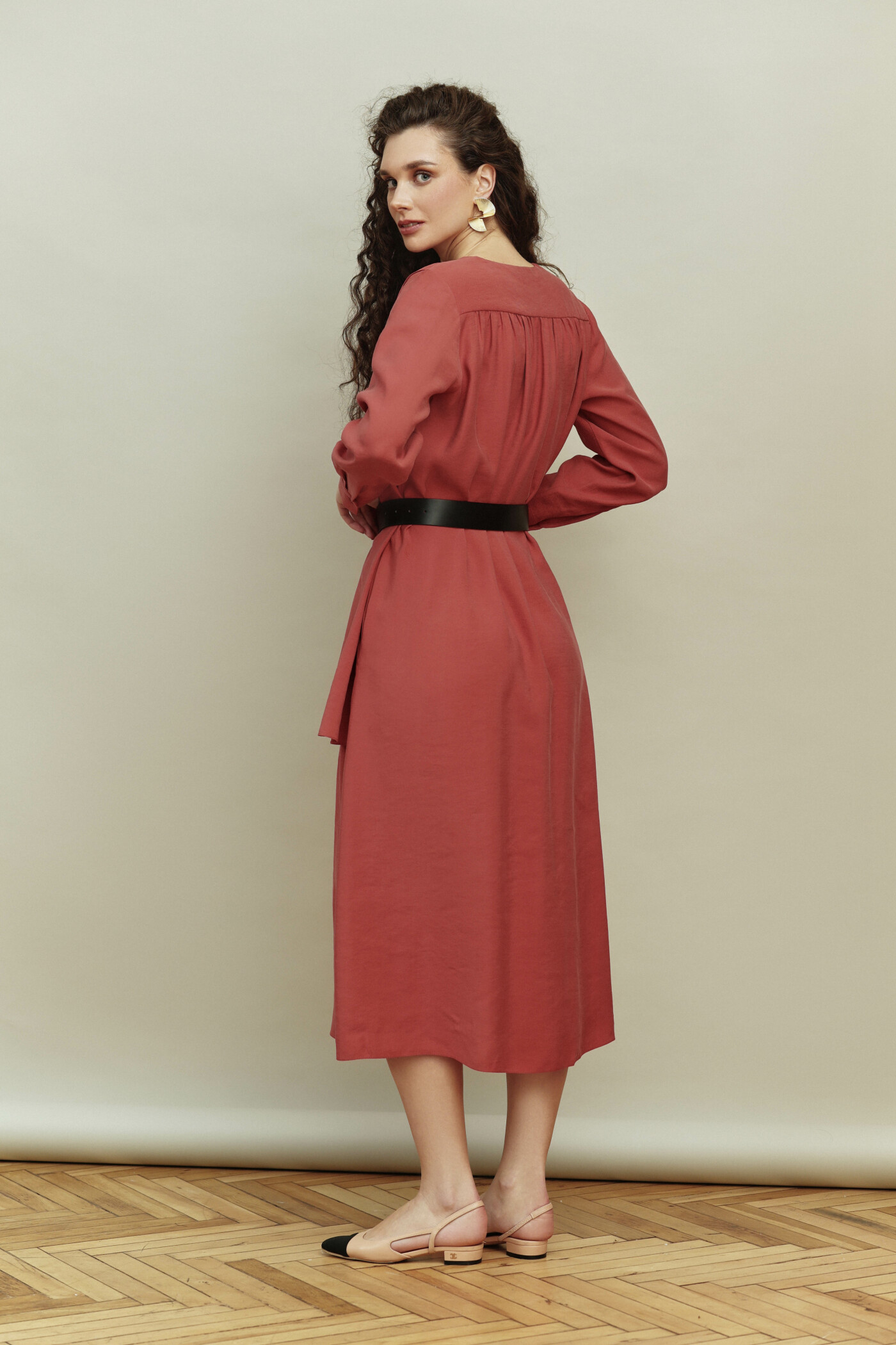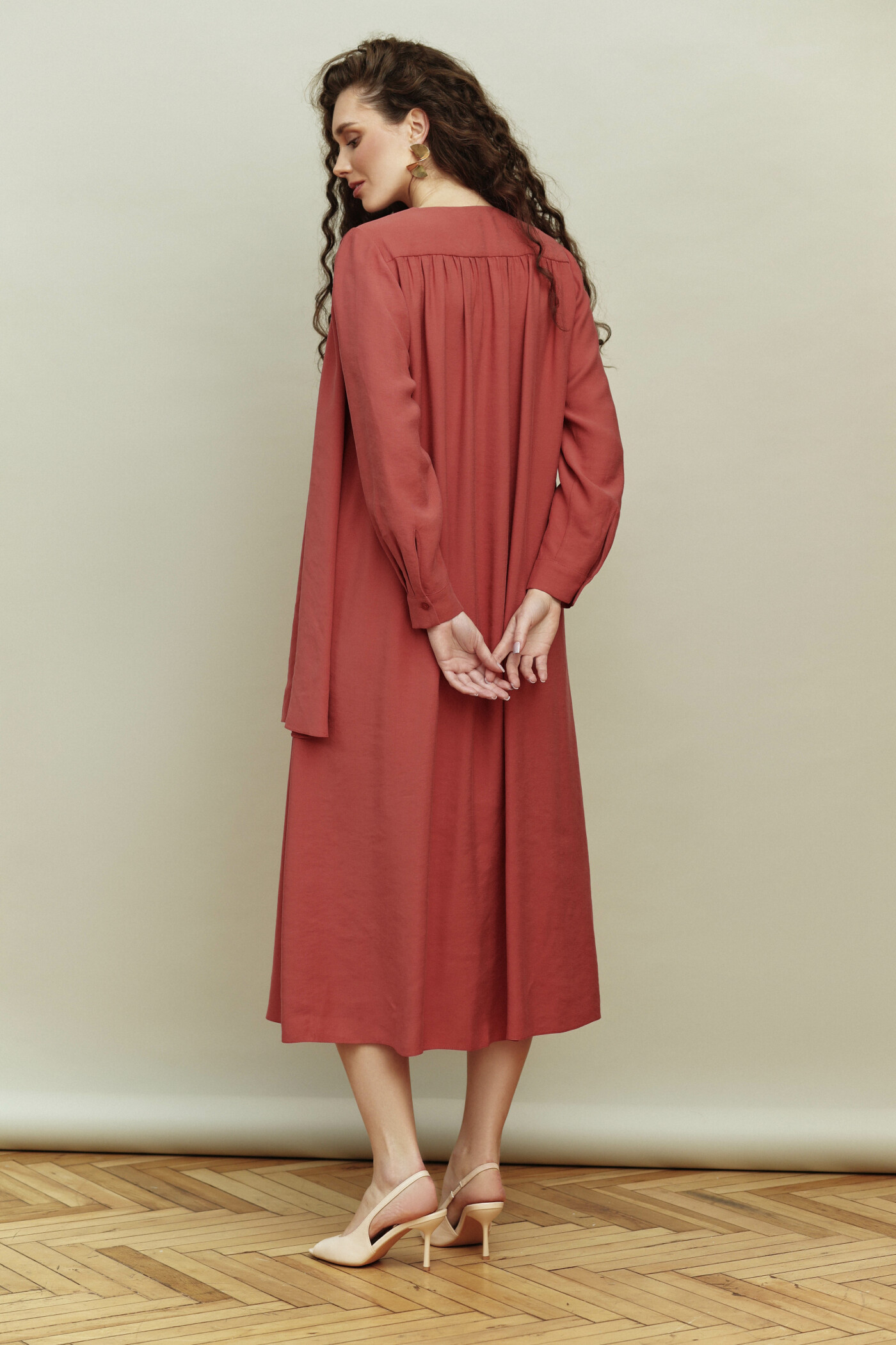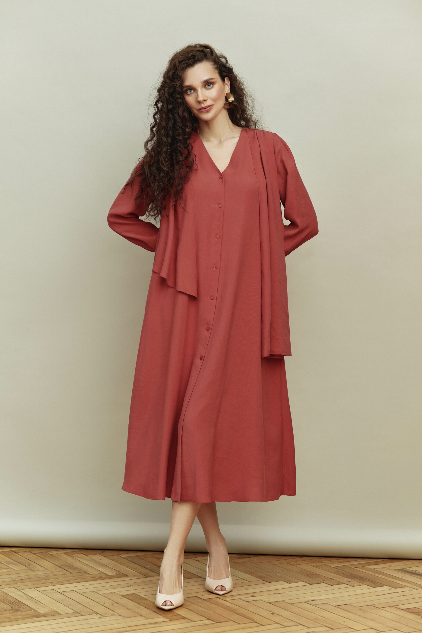 Платье выполнена из лёгкого вискозного полотна. Модель прямого силуэта. V-образная горловина с застёжкой на петли и декоративные пуговицы. Спинка со сборкой направлена от кокетки. Особым декоративным элементом является асимметричный шарф в плечевом шве переда. Рукава втачные, длинные внизу, со складками на застёгивающейся манжете. Модель комплектуется декоративным ремнем с пряжкой. Длина изделия 126 см; длина рукава 60 см.