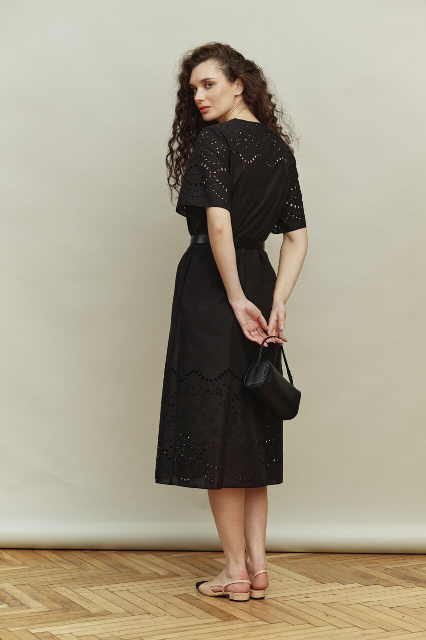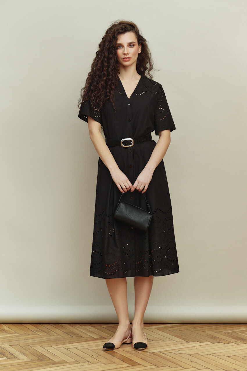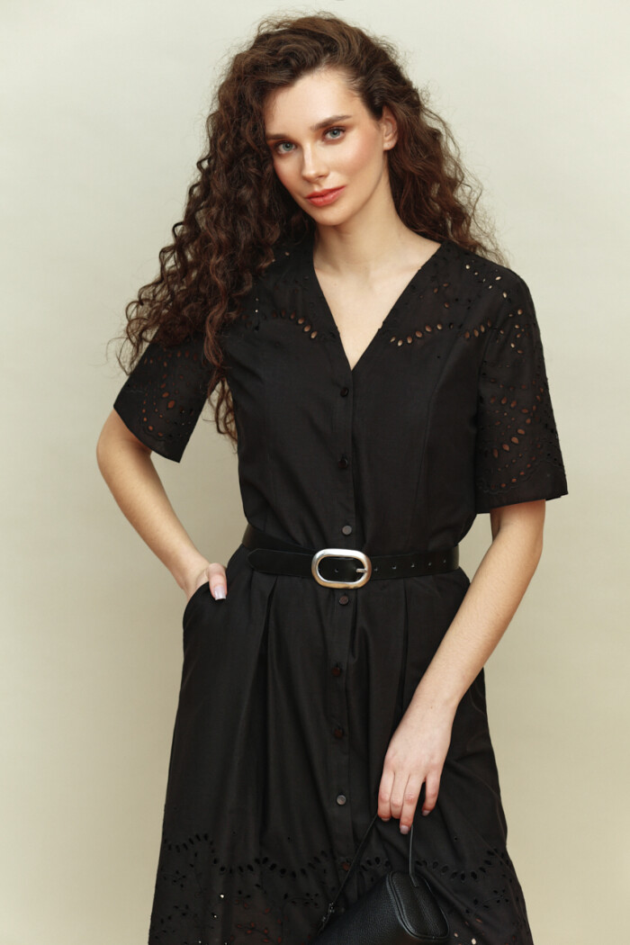 Платье в стиле smart casual выполнено из хлопкового полотна с кружевом. Модель полуприлегающего силуэта. V-образная горловина. По переду рельефы, переходящие в складку и с застёжкой на петли и декоративные пуговицы. Рукава втачные, короткие. Модель комплектуется комбинацией из вискозного полотна на регулируемых по длине бретелях. Длина изделия 125 см, длина рукава 28 см.