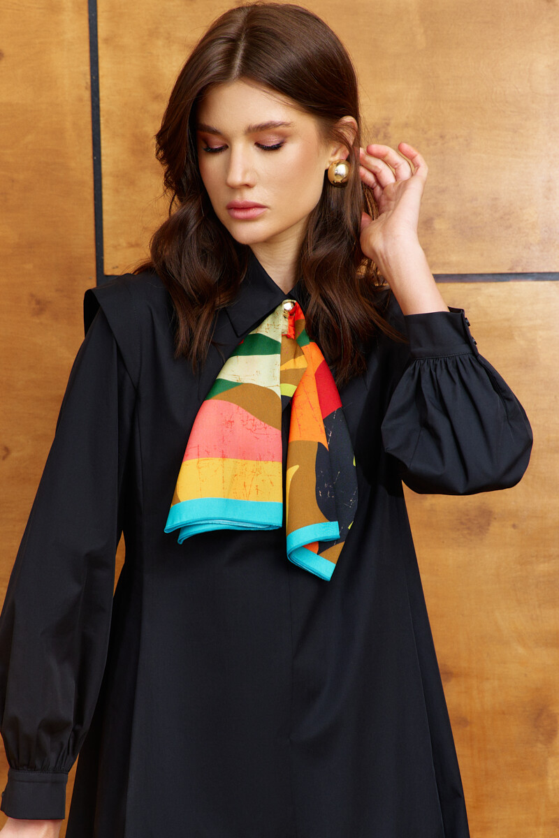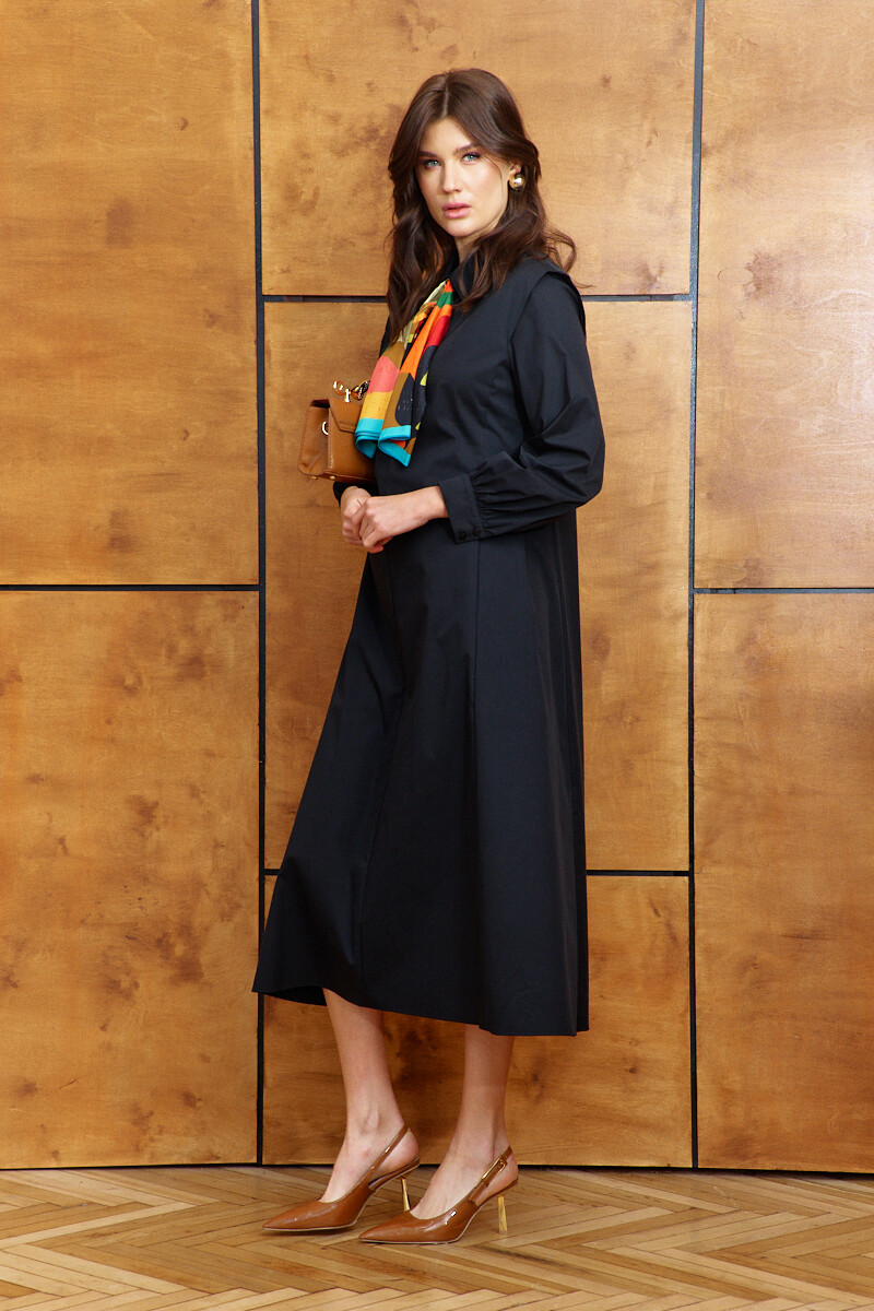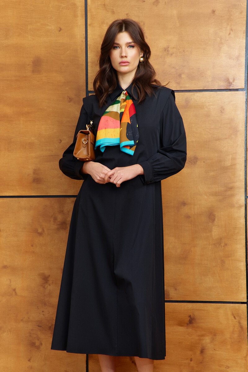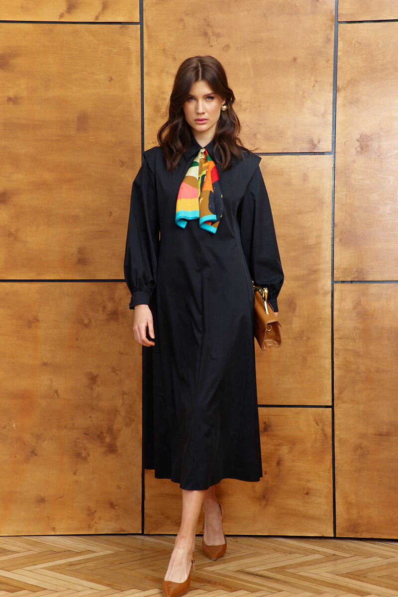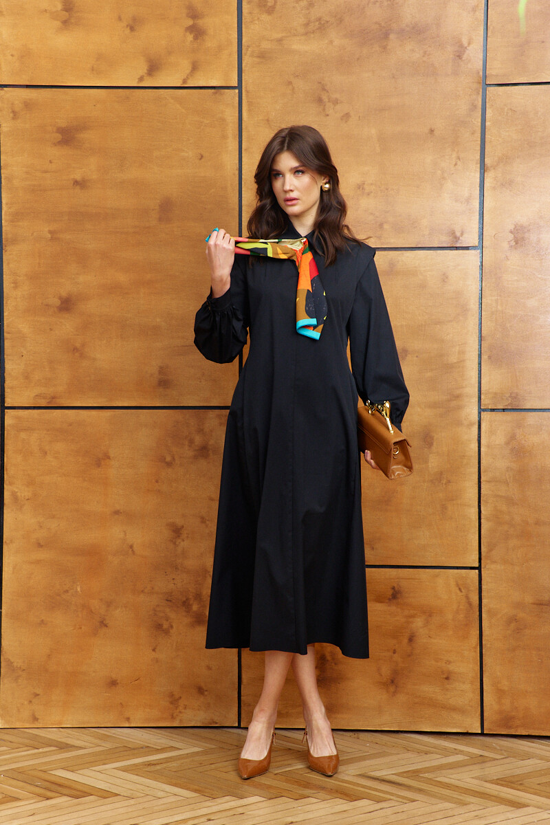 Платье в стиле smart casual выполнено из костюмно-плательного полотна. Модель полуприлегающего силуэта с расширенной линией плеча за счет складки. Воротник отложной на стойке с петлей и декоративной пуговицей. Спинка и перед со средним швом и рельефами. В рельефе переда выполнены функциональные карманы «в швах». Рукава втачные, длинные, со сборкой вдоль застегивающейся манжеты. В качестве декора к платью прилагается съемный платок из отделочной ткани в виде банта с прорезной петлёй, фиксирующийся на пуговицу, пришитую на отрезной стойке. Длина изделия 126 см; длина рукава 60,4 см.