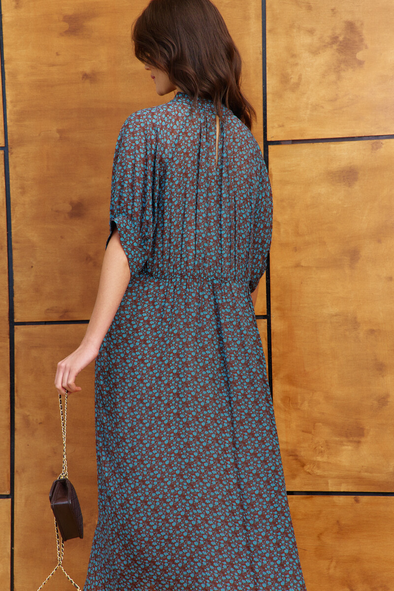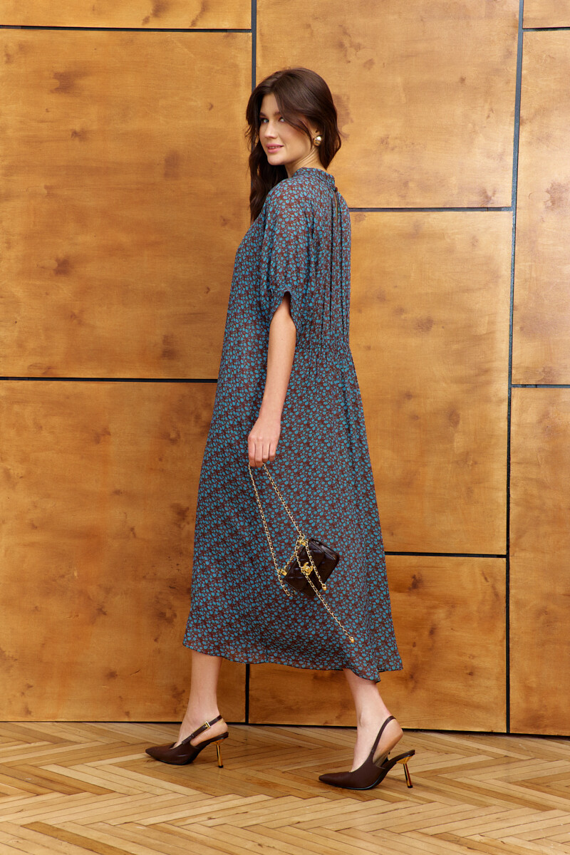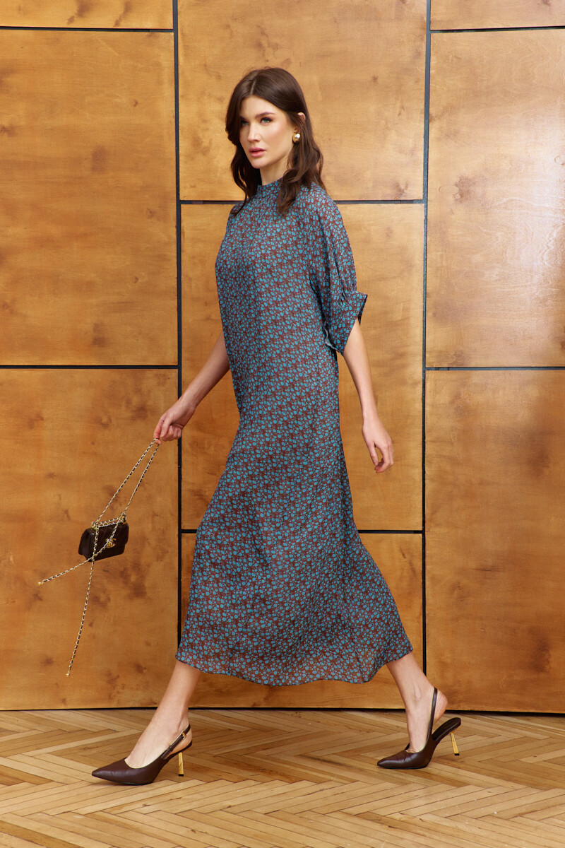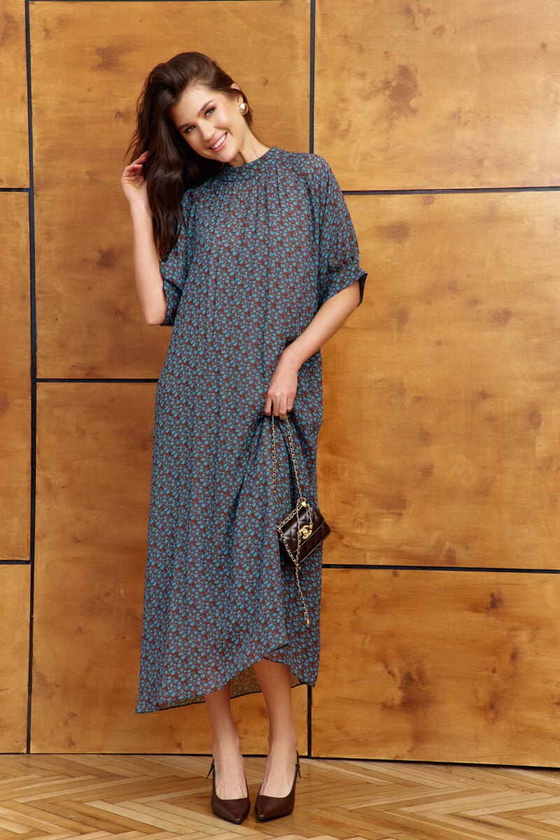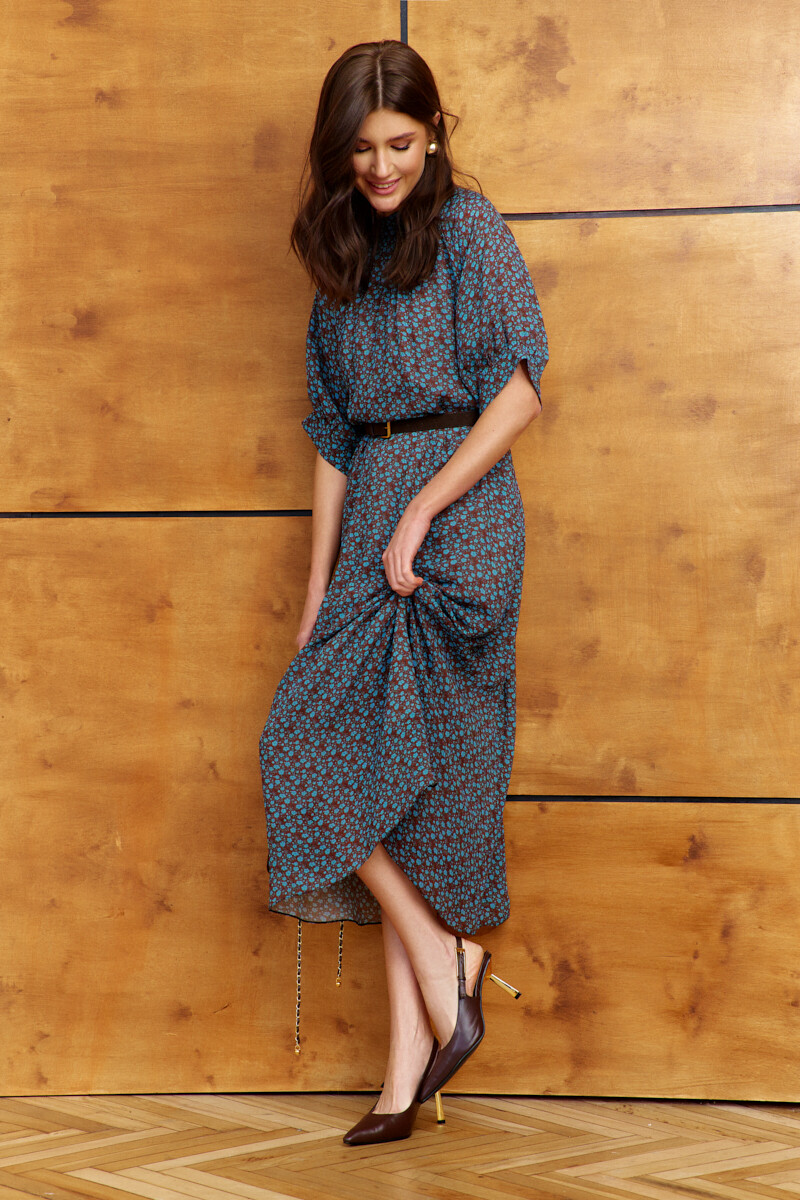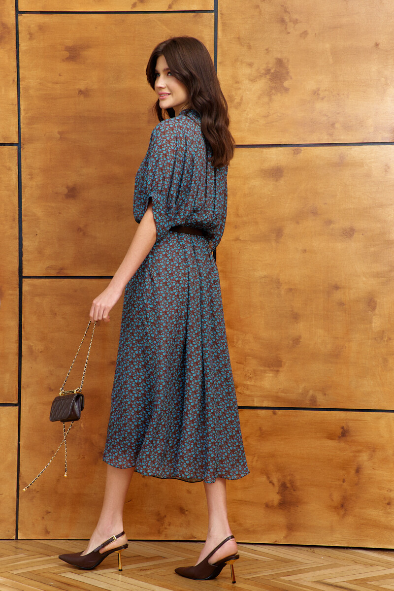 Платье в стиле smart casual выполнено из струящегося вискозного полотна с актуальным дизайнерским принтом. Модель свободного силуэта с ремнём на металлическую пряжку. Воротник-стойка застёгивается по спинке на декоративные пуговицы и навесные петельки. Спинка отрезная по линии талии, в шве соединения лифа и юбки эластичная тесьма. Рукава короткие реглан со сборкой вдоль застёгивающейся манжеты. Модель комплектуется комбинацией из вискозного полотна на регулируемых по длине бретелях. Длина по спинке 125 см; длина рукава (от горловины) 39 см.
