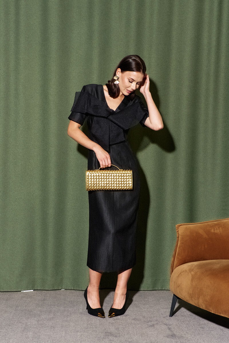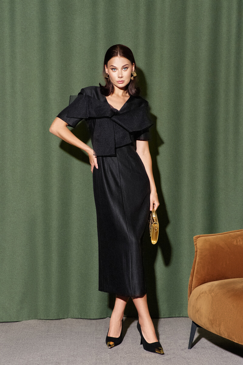Платье в стиле city chic выполнено из костюмно-плательного полотна с благородным блеском на подкладке. Модель полуприлегающего силуэта. V-образный вырез горловины переда и спинки с перемычкой на уровне плечевого. В области груди имеется декоративный элемент в виде банта из отделочного полотна. По переду и спинке расположены рельефы и талиевые выточки, которые подчеркивают фигуру. Для удобства в носке в среднем шве спинки потайная тесьма «молния» и шлица. Рукава втачные короткие. Длина изделия 128 см, длина рукава 24 см.