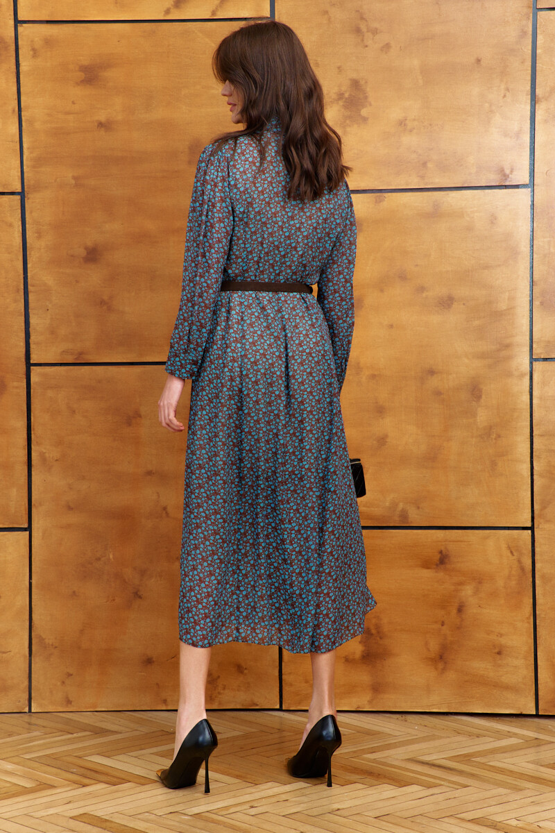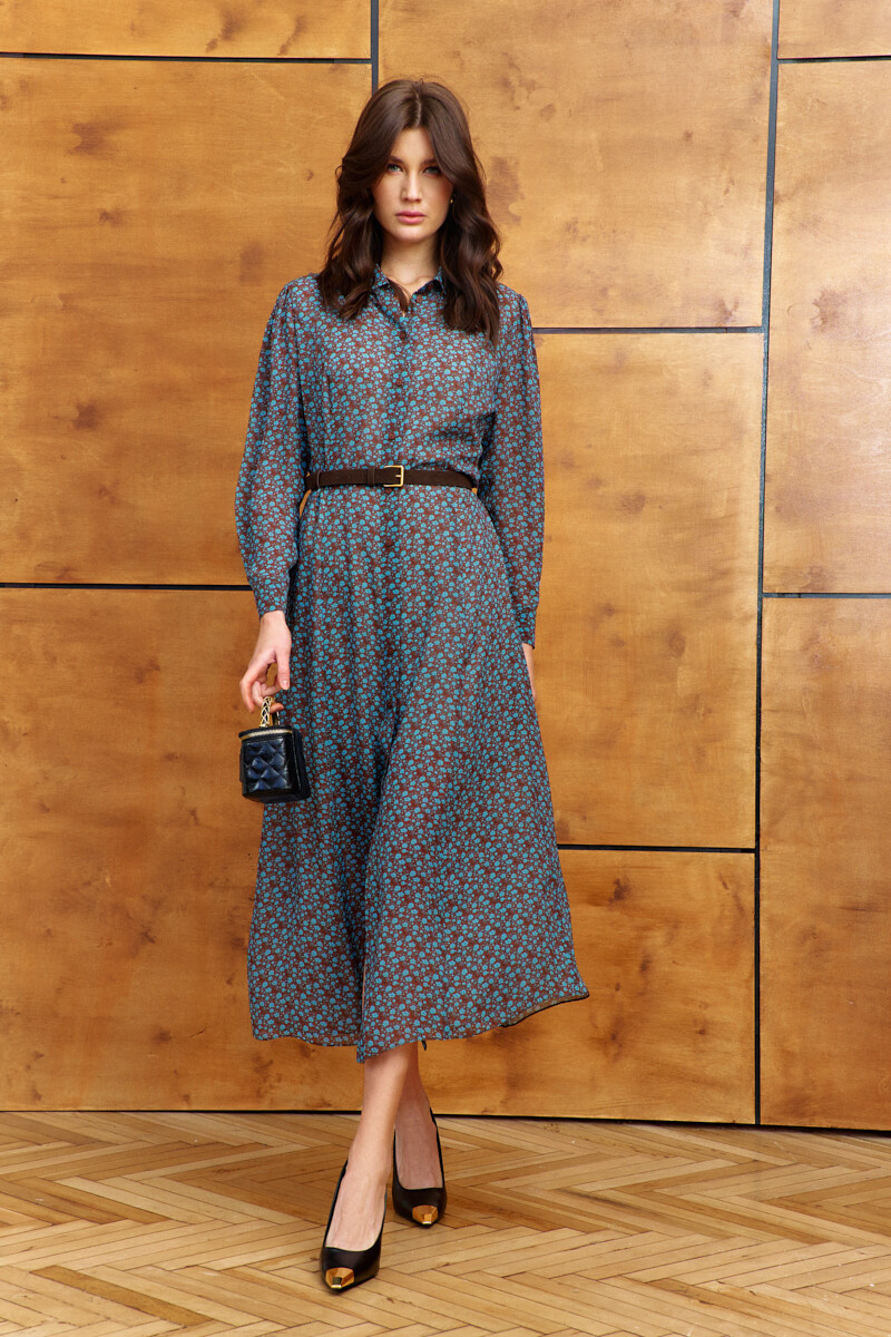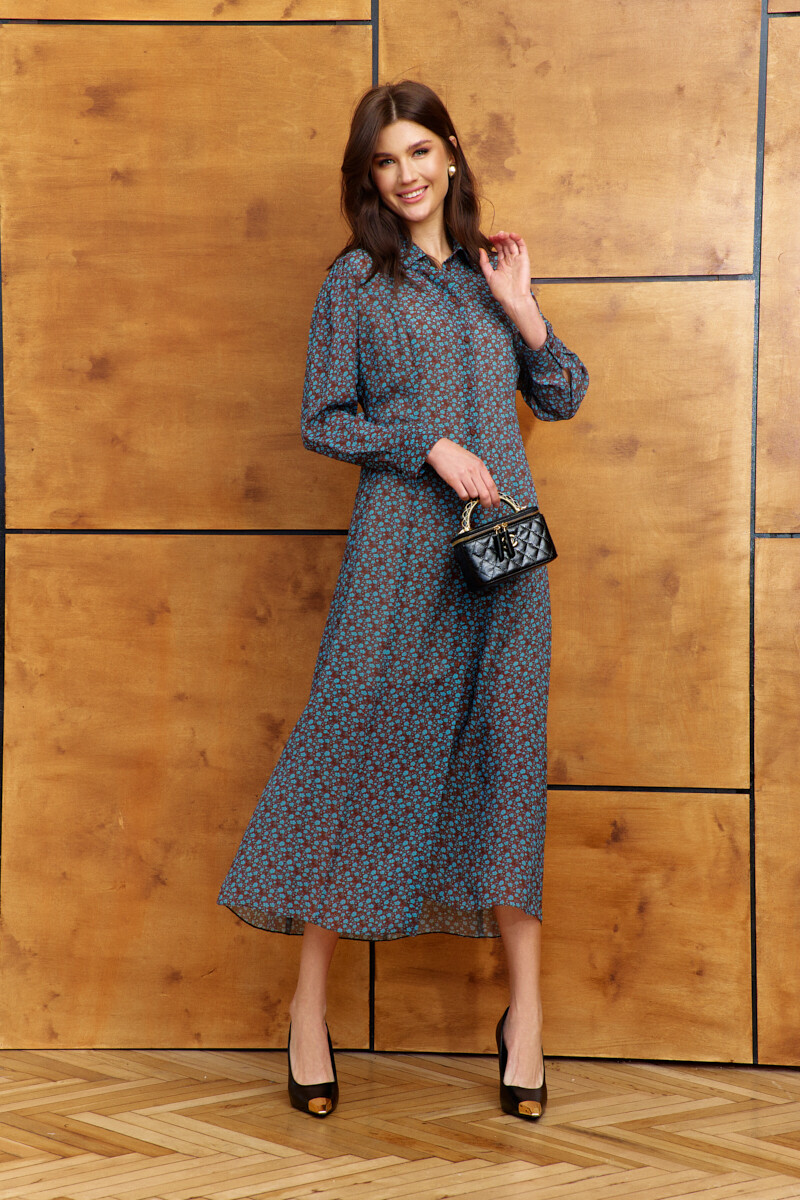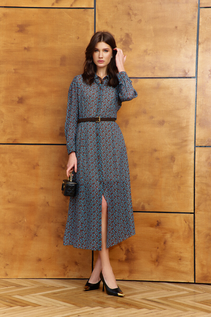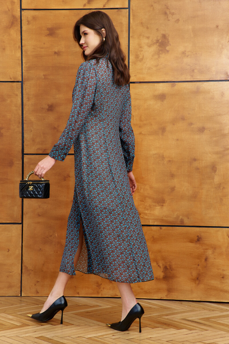 Платье в стиле smart casual выполнено из струящегося вискозного полотна с дизайнерским принтом. Модель полуприлегающего силуэта слегка расширяется к низу. Воротник отложной на стойке. Спереди предусмотрена цельнокроеная планка на петлях и декоративные пуговицы. По спинке и переду выполнены рельефы. Рукава втачные, длинные, со сборкой по окату и складками вдоль застегивающейся манжеты. Модель комплектуется комбинацией из вискозного полотна на регулируемых по длине бретелях. Длина по спинке 132 см; длина рукава 60 см.