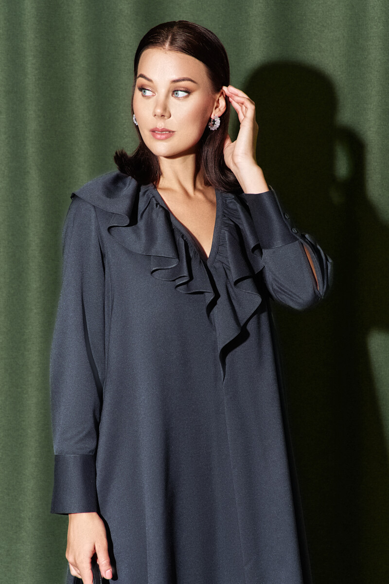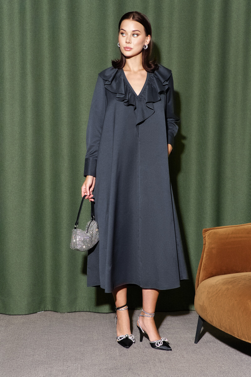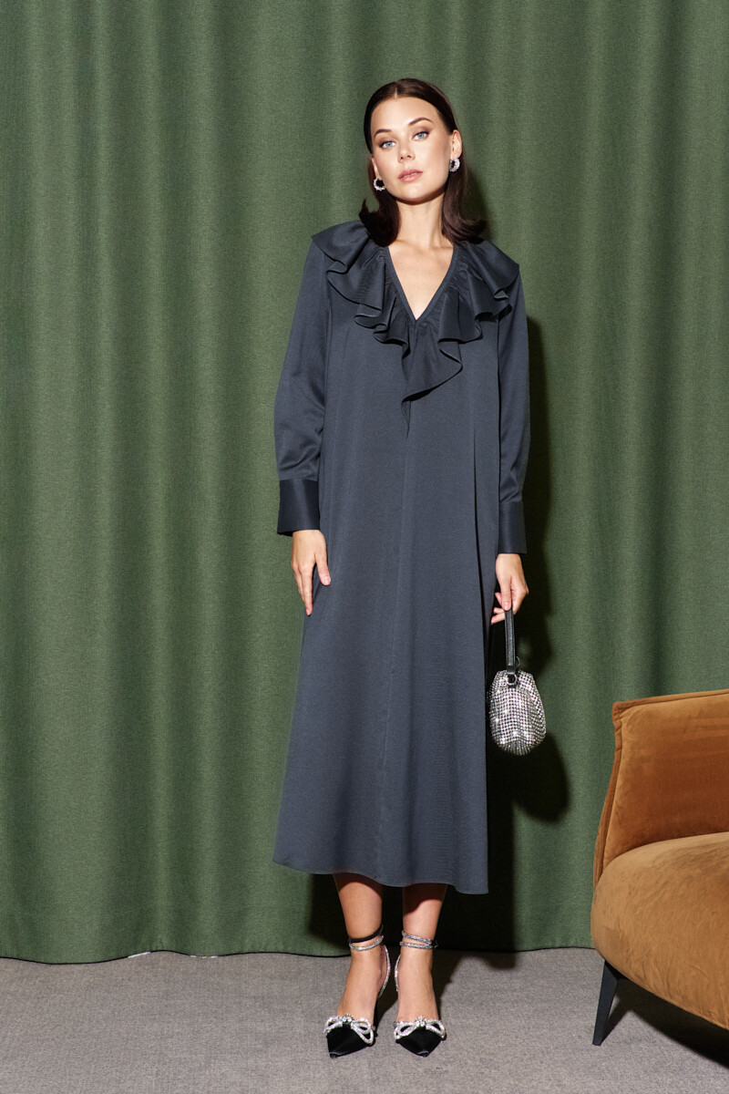 Оригинальное платье в стиле smart casual выполнено из плательного полотна. Модель А-образного силуэта, длины мидакси, в боковых швах карманы. Рукава втачные, длинные со складками на широкой застёгивающейся манжете. V-образный вырез горловины с асимметричным призборенным воланом и оформлен косой бейкой. Длина изделия по спинке 122 см.; длина рукава 59 см.