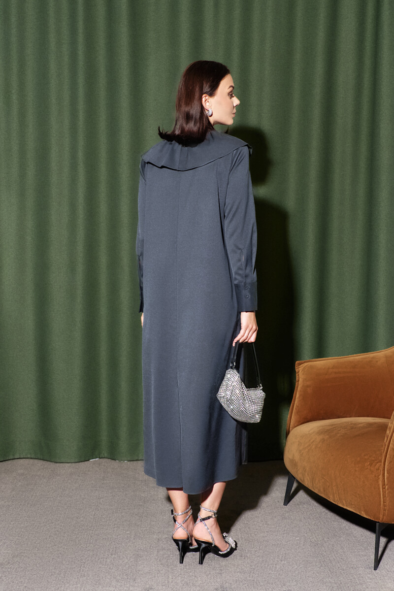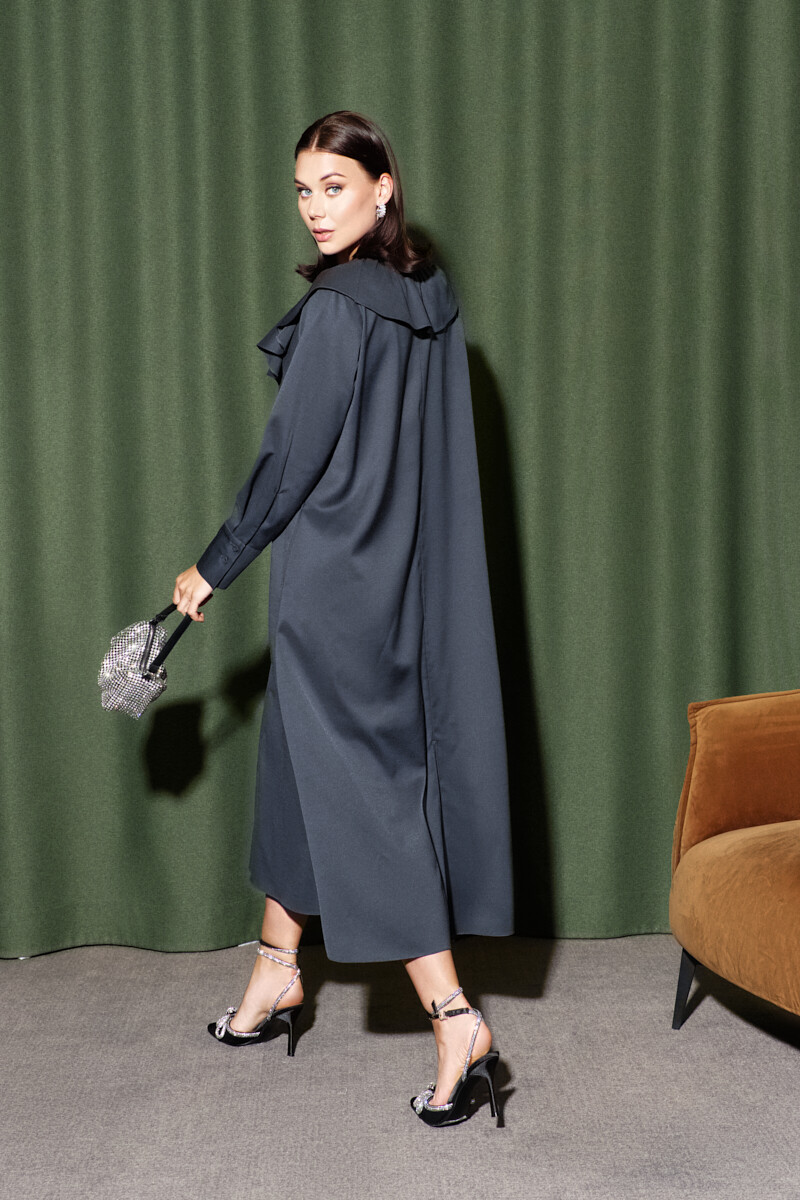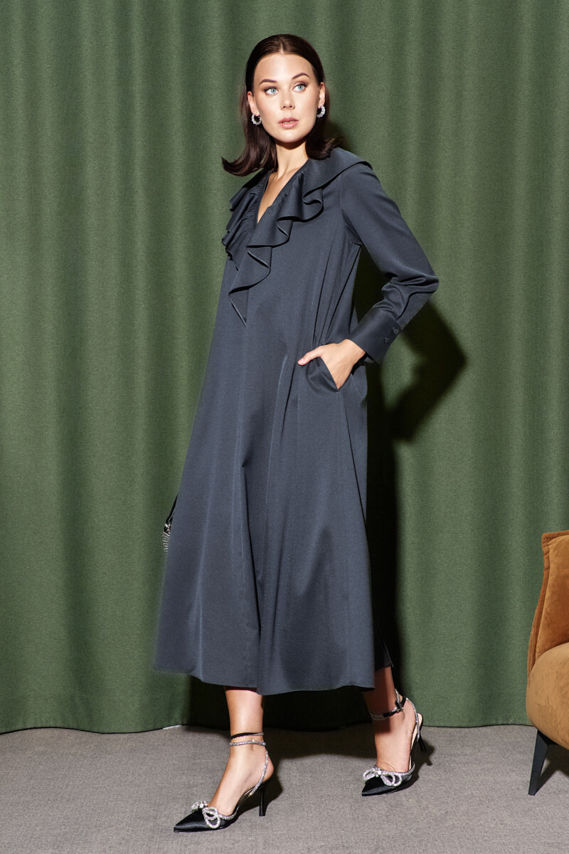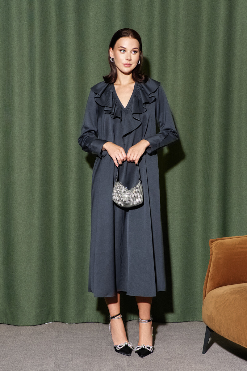 Оригинальное платье в стиле smart casual выполнено из плательного полотна. Модель А-образного силуэта, длины мидакси, в боковых швах карманы. Рукава втачные, длинные со складками на широкой застёгивающейся манжете. V-образный вырез горловины с асимметричным призборенным воланом и оформлен косой бейкой. Длина изделия по спинке 122 см.; длина рукава 59 см.