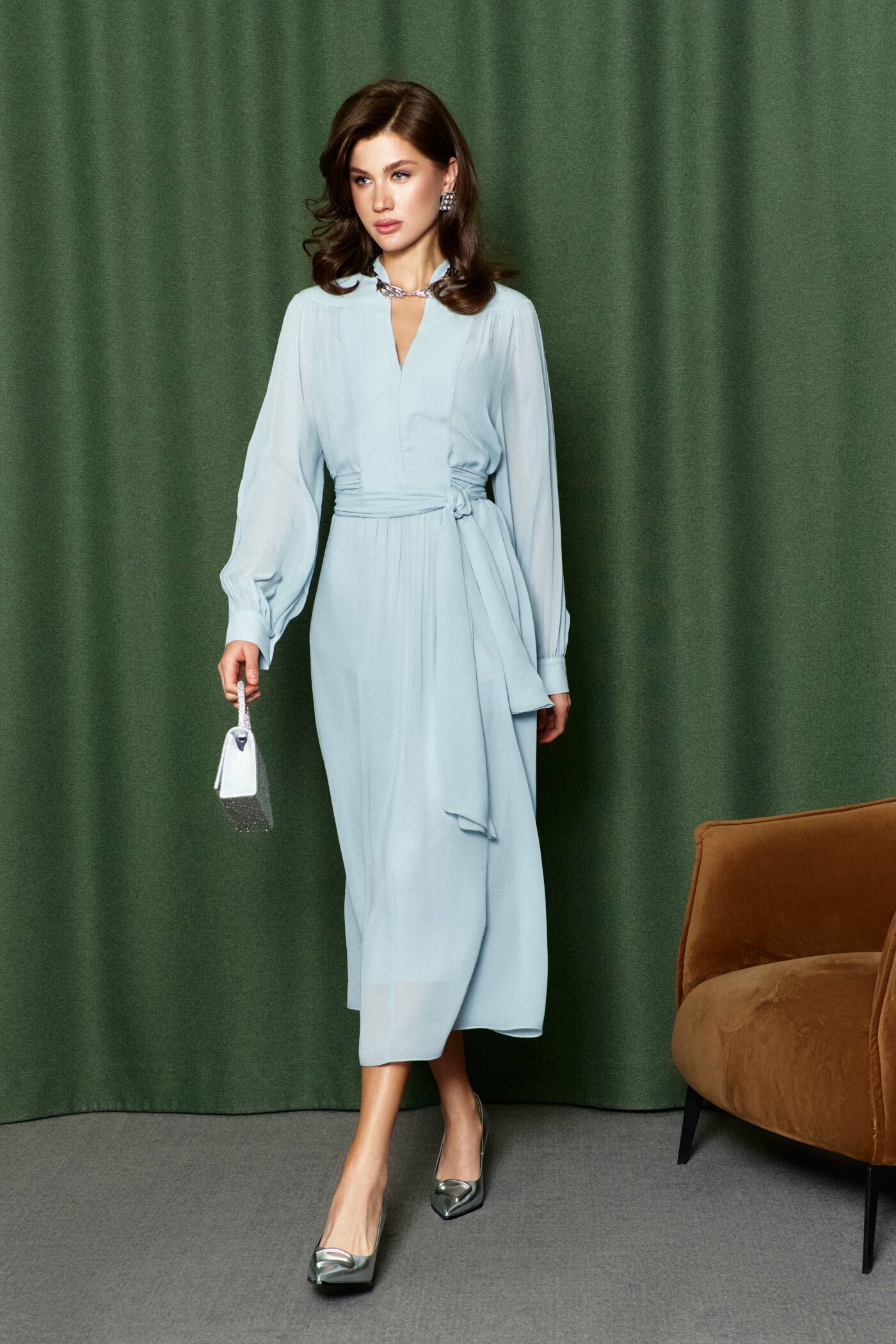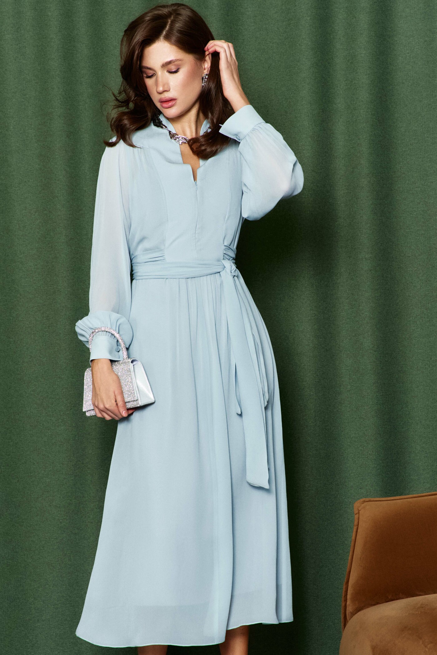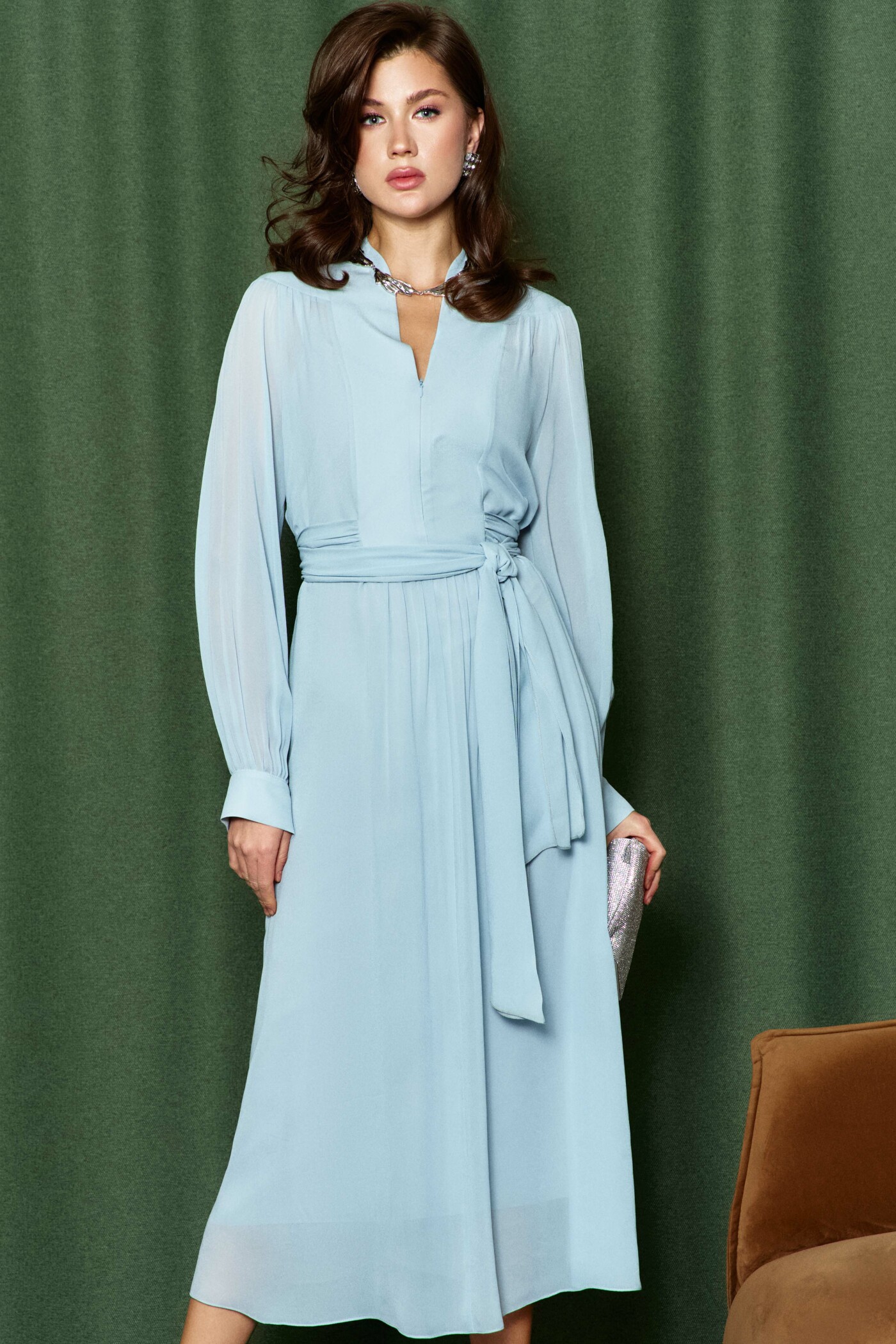 Платье в стиле City Chic выполнена из полупрозрачного вискозного полотна. Модель полуприлегающего силуэта. V-образная горловина, переходящая в стойку по спинке. По верхним срезам переда и рукава — сборка. Для удобства в носке в среднем шве переда потайная тесьма-молния. Спинка платья с фигурной кокеткой от плечевых швов. Рукава длинные реглан со сборкой вдоль застегивающейся манжеты. Особый вид изделию придают длинные втачные пояса, которые дважды опоясывают талию. Модель комплектуется комбинацией из вискозного полотна на регулируемых по длине бретелях. Длина изделия 128 см; длина рукава от горловины 70 см.