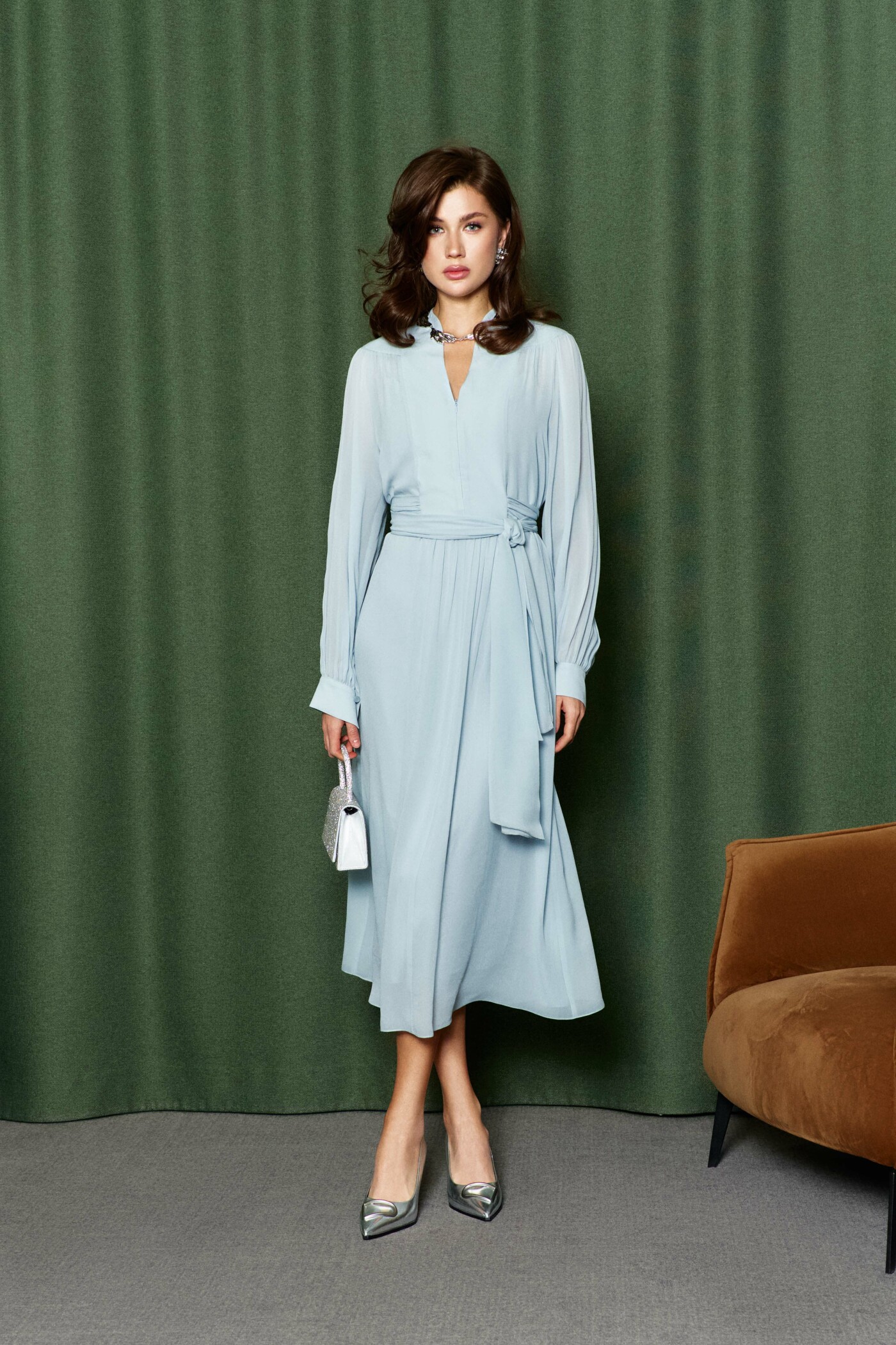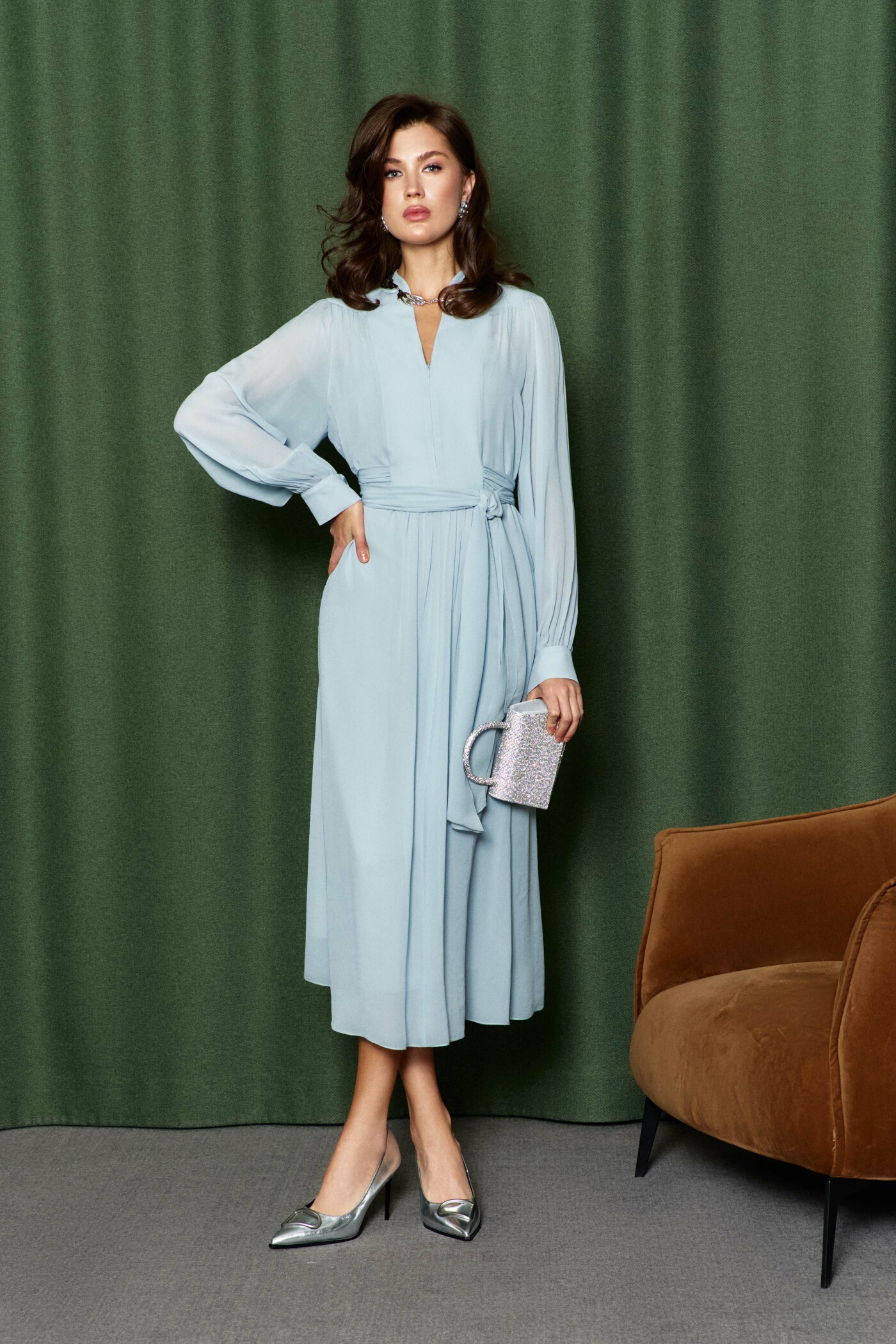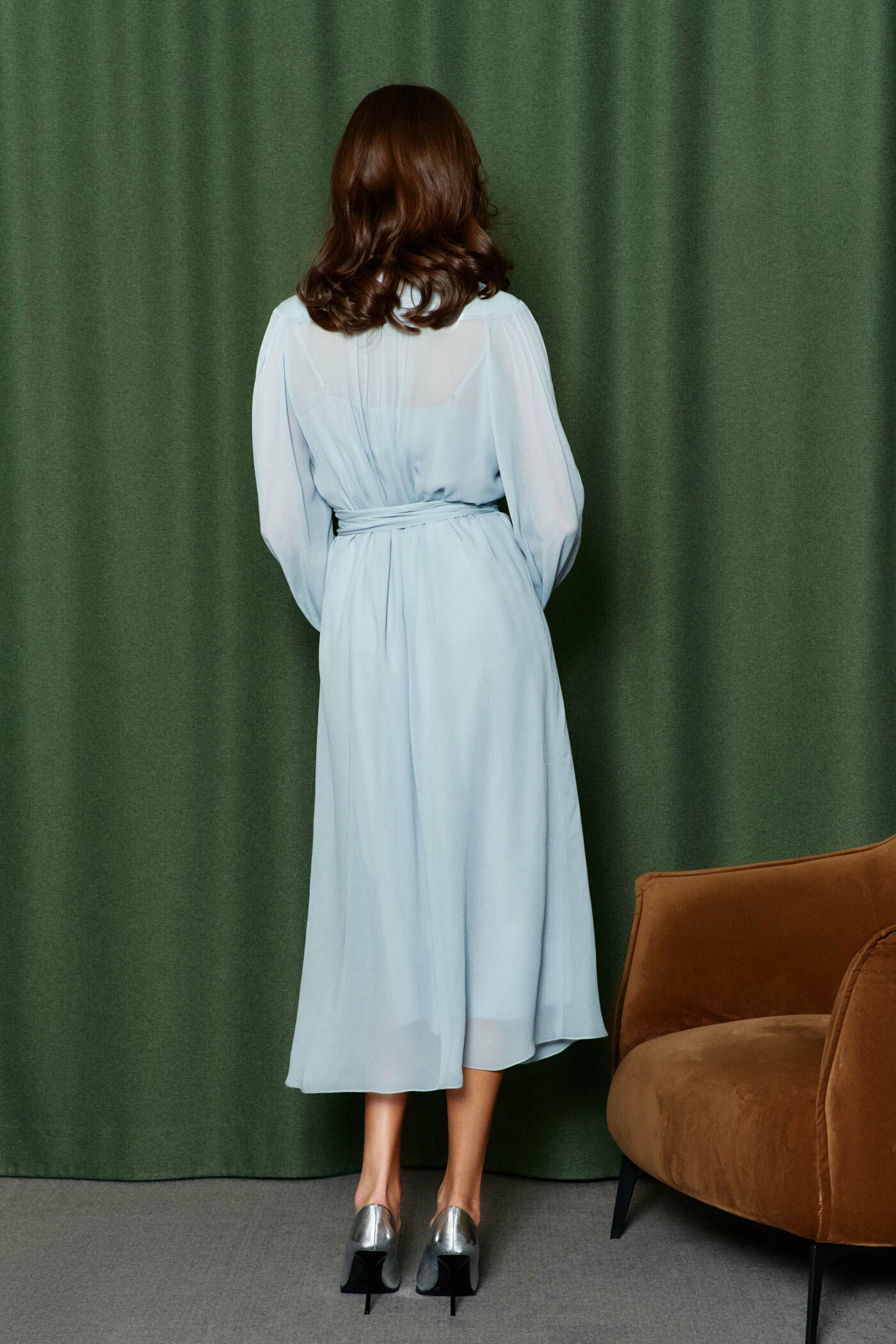 Платье в стиле City Chic выполнена из полупрозрачного вискозного полотна. Модель полуприлегающего силуэта. V-образная горловина, переходящая в стойку по спинке. По верхним срезам переда и рукава — сборка. Для удобства в носке в среднем шве переда потайная тесьма-молния. Спинка платья с фигурной кокеткой от плечевых швов. Рукава длинные реглан со сборкой вдоль застегивающейся манжеты. Особый вид изделию придают длинные втачные пояса, которые дважды опоясывают талию. Модель комплектуется комбинацией из вискозного полотна на регулируемых по длине бретелях. Длина изделия 128 см; длина рукава от горловины 70 см.
