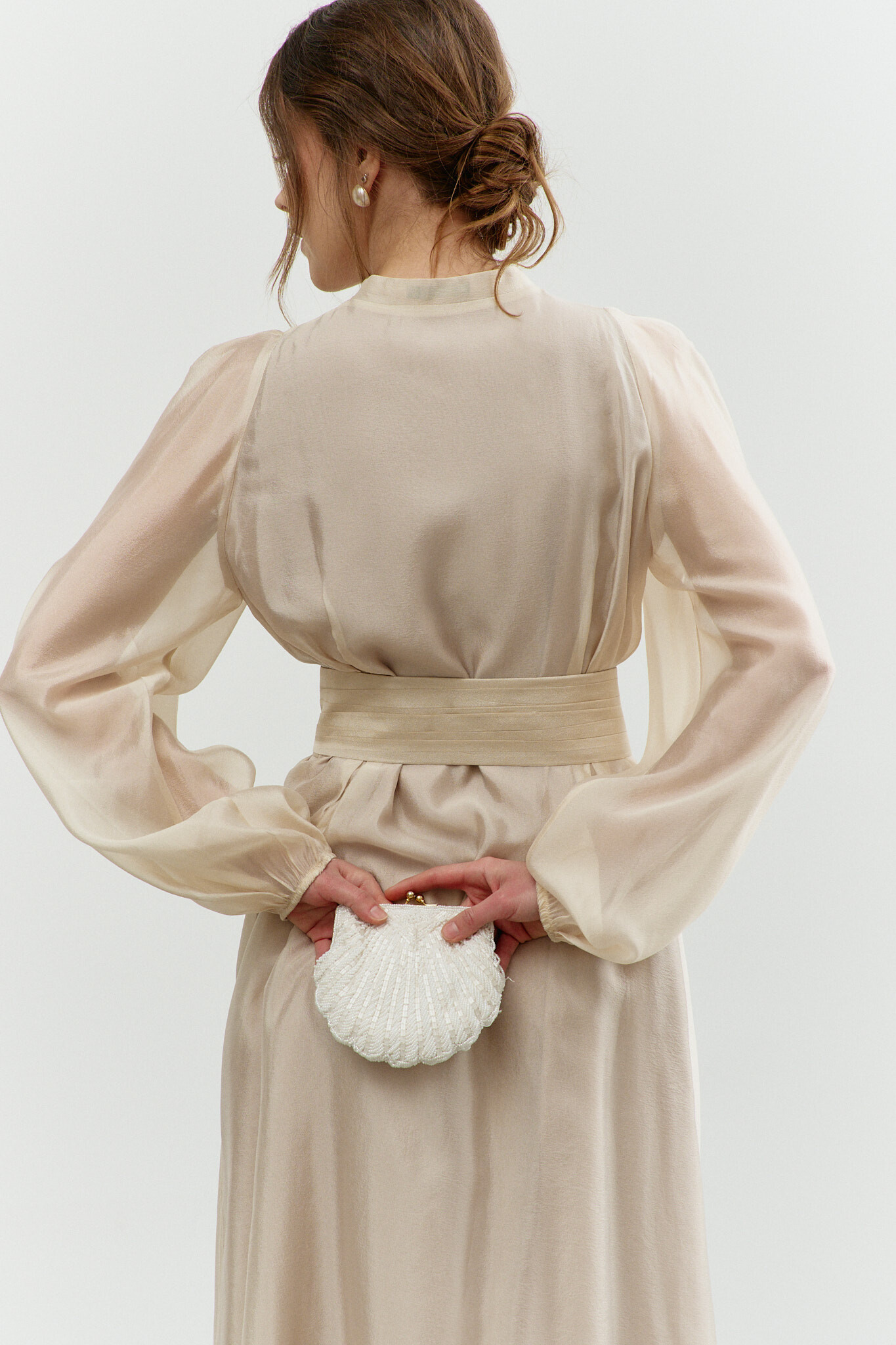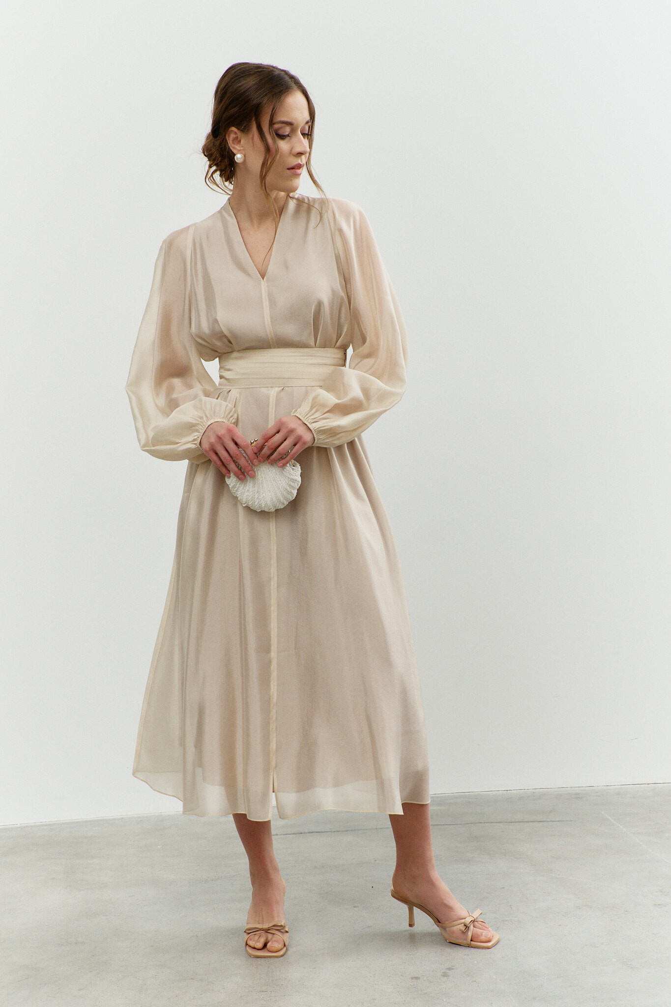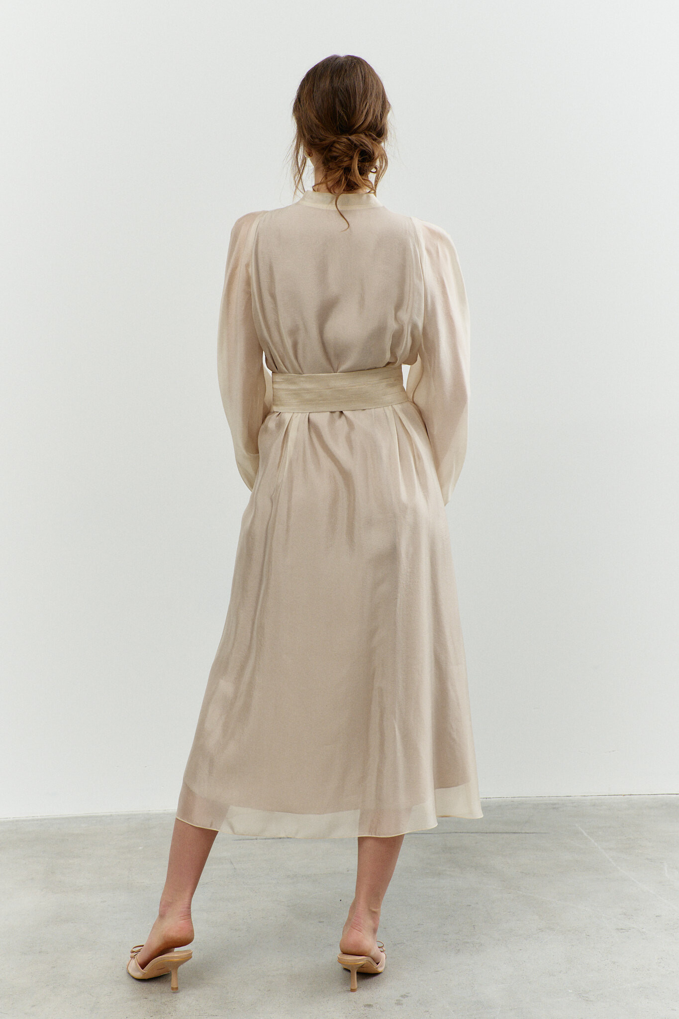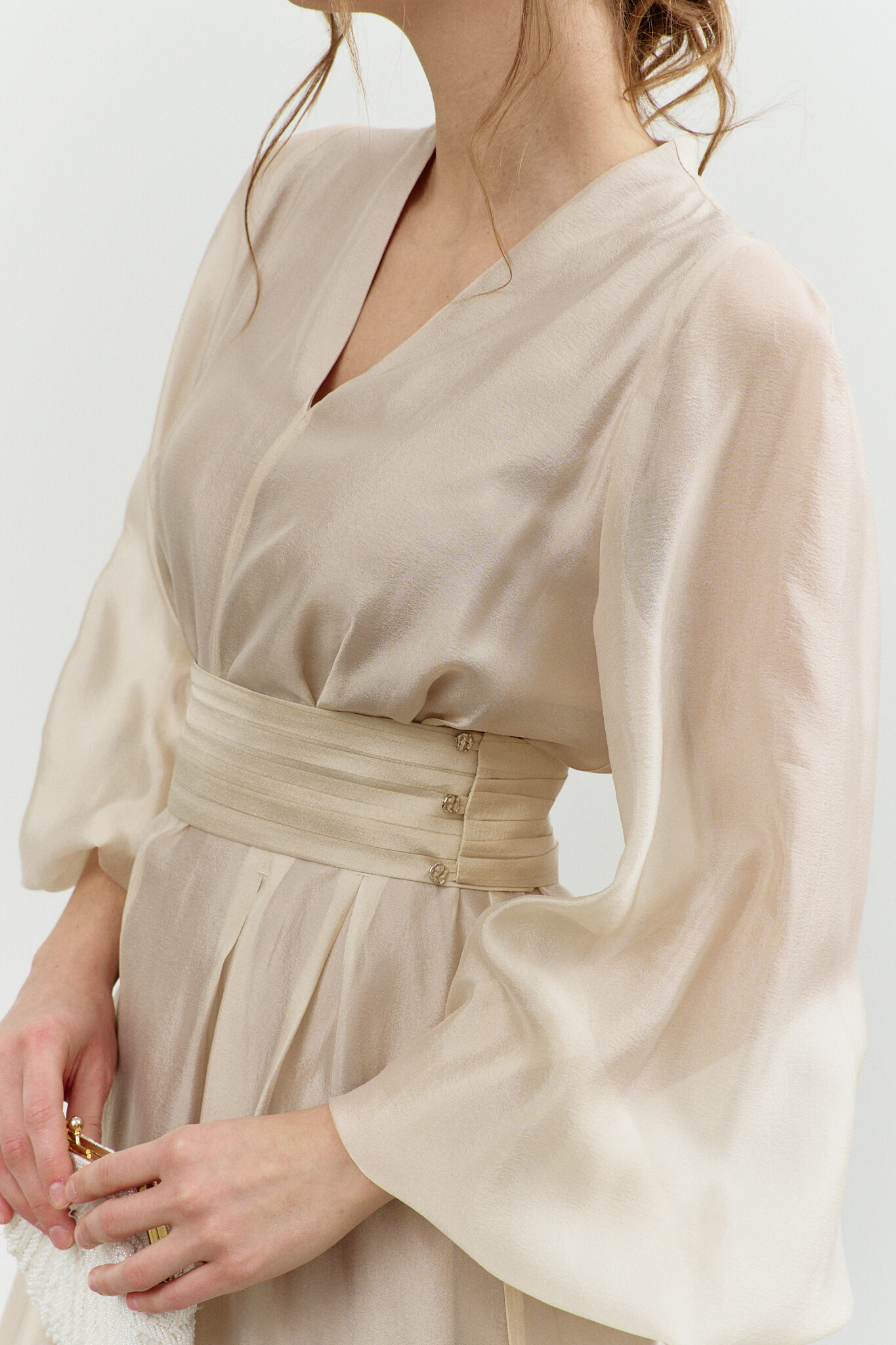 Элегантное платье в стиле City Chic выполнено из полупрозрачной вуали с лёгким блеском. Модель полуприлегающего силуэта, с V-образной горловиной, переходящей в стойку по спинке. Особым декоративным элементом являются встречные складки, заложенные по линии талии на переде и спинке. Рукава реглан длинные, расширенные со сборкой и эластичной тесьмой внизу. Модель комплектуется широким драпированным поясом из основного полотна на навесные петли и пуговицы. Изделие на подкладке из вискозного полотна. Длина изделия 130 см; длина рукава 83 см.