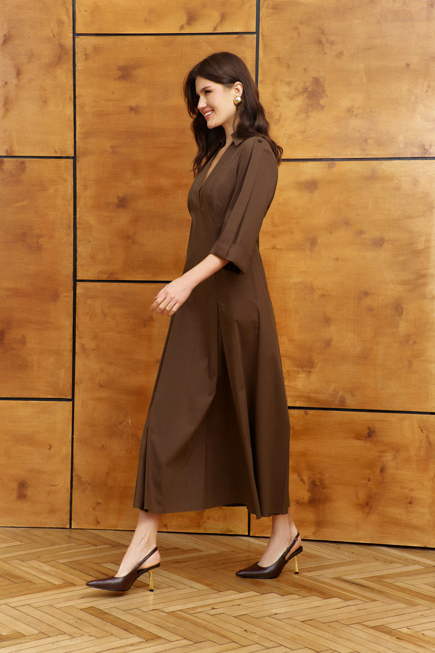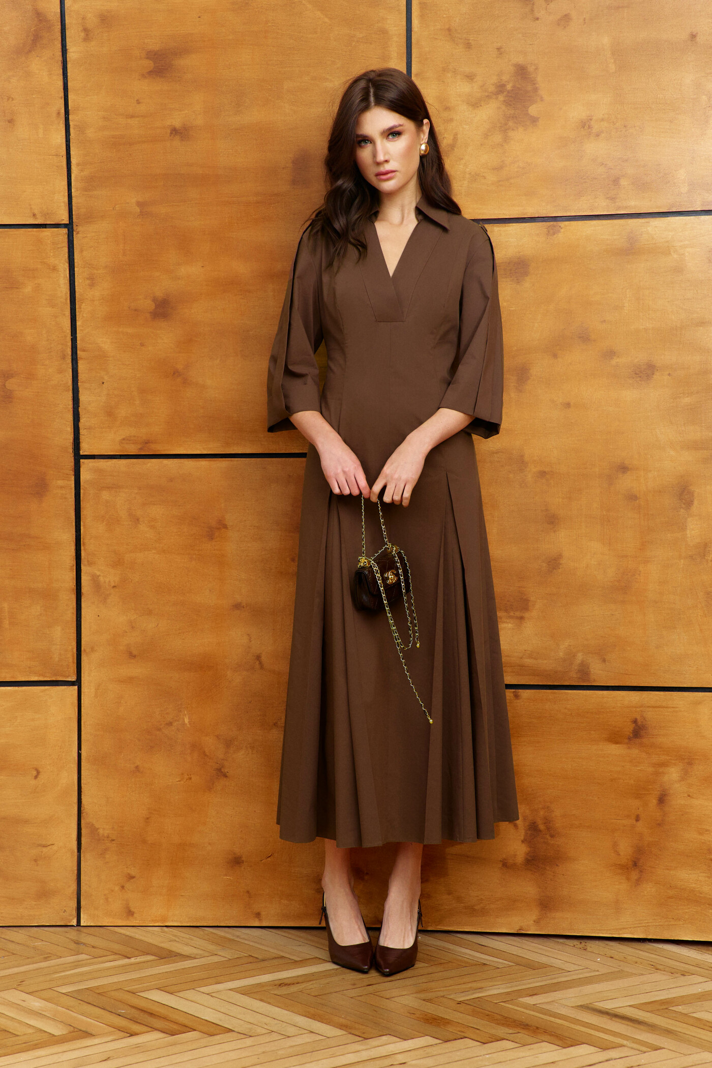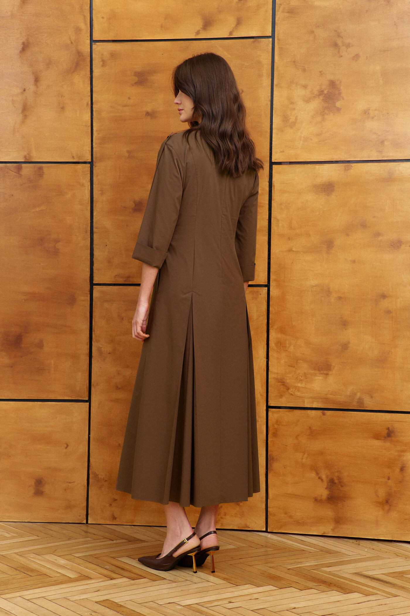 Платье в стиле smart casual выполнено из хлопкового полотна. Модель полуприлегающего силуэта, расширенного книзу. Воротник отложной на стойке, от которого идёт V-образный вырез горловины, обработанный притачными планками. На переде и спинке рельефы с заложенными и зафиксированными по верху фигурной отделочной строчкой встречными складками. В боковых швах платья расположены функциональные карманы. Для удобства в носке в среднем шве спинки застёжка на потайную "тесьму-молнию". Втачные рукава длиной ниже локтя с отворотом и с притачной патой с прорезной петлёй, застёгивающейся на пришивную пуговицу, пришитую на плечевом шве. Длина изделия 134 см; длина рукава (от горловины) 57 см.