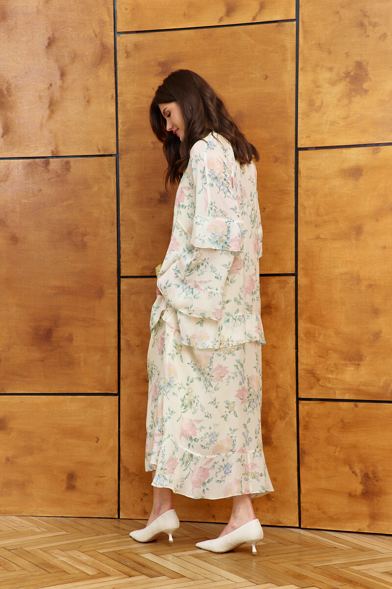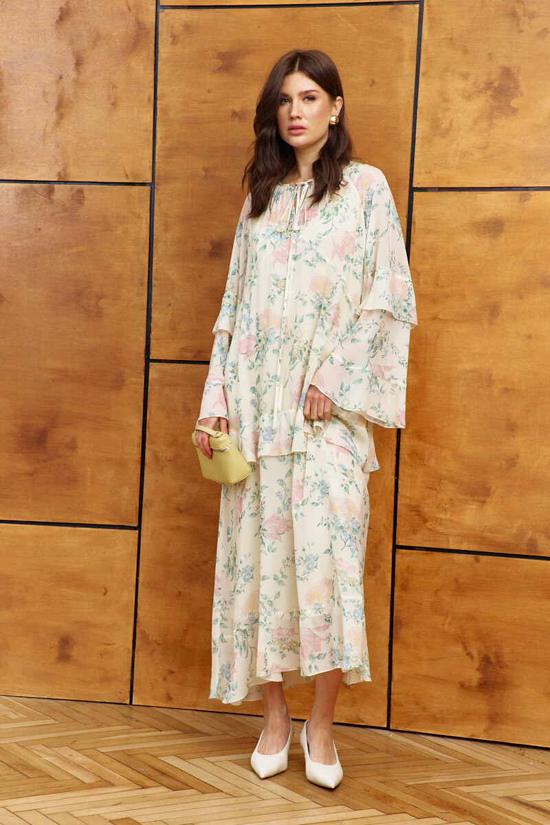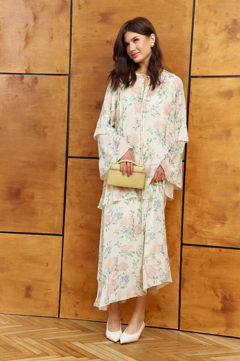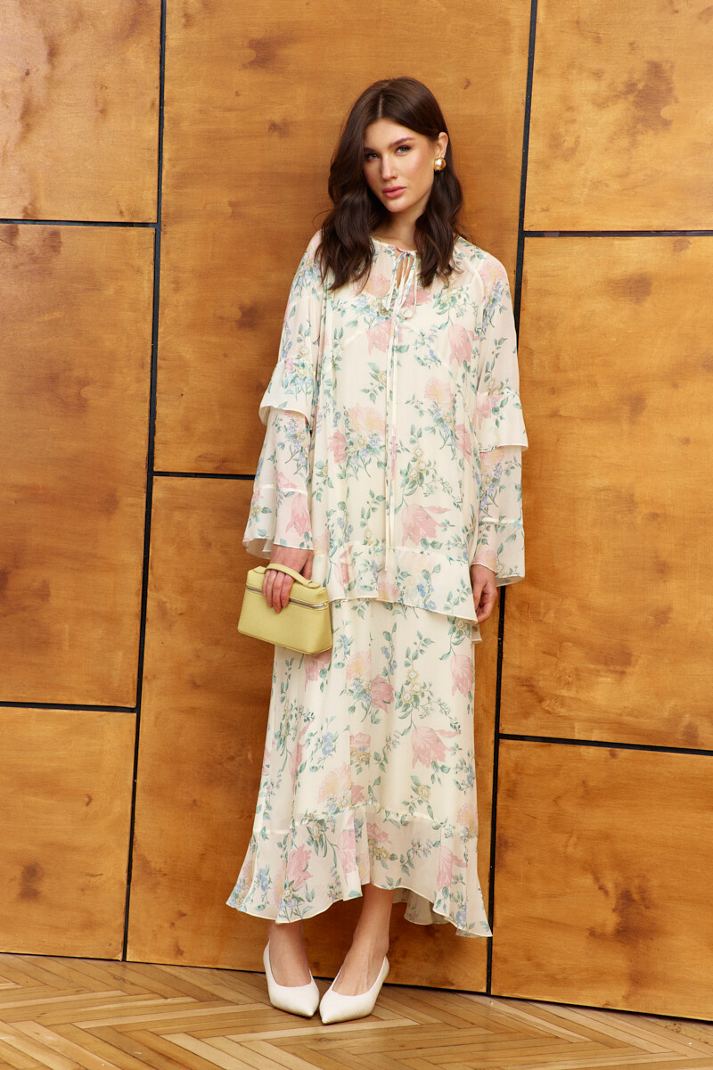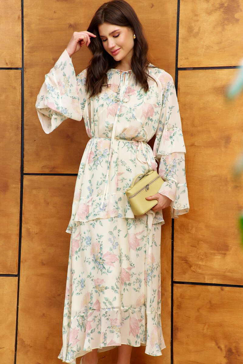 Платье в стиле city chic выполнено из струящегося вискозного полотна с актуальным дизайнерским принтом. Модель свободного силуэта. Горловина круглая со сборкой по переду и окантовкой, которая переходит в завязки. Перед платья с фигурным подрезом ниже уровня линии груди, от которого вверх обработан разрез. По переду и спинке подрез на уровне линии бёдер, в который вставлен волан и с притачным воланом по низу модели. Длинные расширенные рукавами покроя реглан с притачными воланами по низу и на уровне линии локтя. Модель комплектуется комбинацией из вискозного полотна на регулируемых по длине бретелях. Длина по спинке 132 см; длина рукава (от горловины) 74 см.