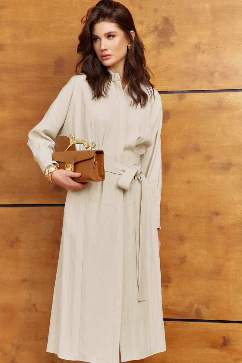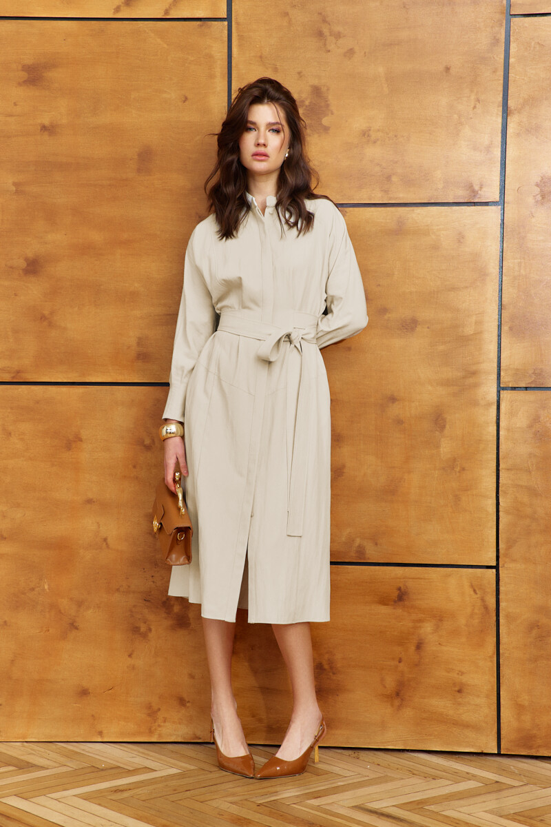 Платье в стиле Smart casual выполнено из костюмно-плательного полотна. Модель полуприлегающего силуэта, расширенного к низу силуэта. Воротником-стойкой, в шов притачивания которого вставлена отделочная тесьма. По центру переда - потайная планка на петли и декоративные пуговицы. Со стороны переда на уровне линии талии заложены и зафиксированы отделочной строчкой односторонние складки, в которые вставлены детали отлетного завязывающегося пояса из основного полотна и с фигурным подрезом на уровне линии бёдер, и с рельефами на переде и спинке. Длинные цельнокроеные рукавами по низу, с заложенными складками и с отделочной строчкой, и с функциональной застёжкой на потайную тесьму-молнию на каждом рукаве. Длина изделия - 119 см, длина рукава (от горловины) 73 см.