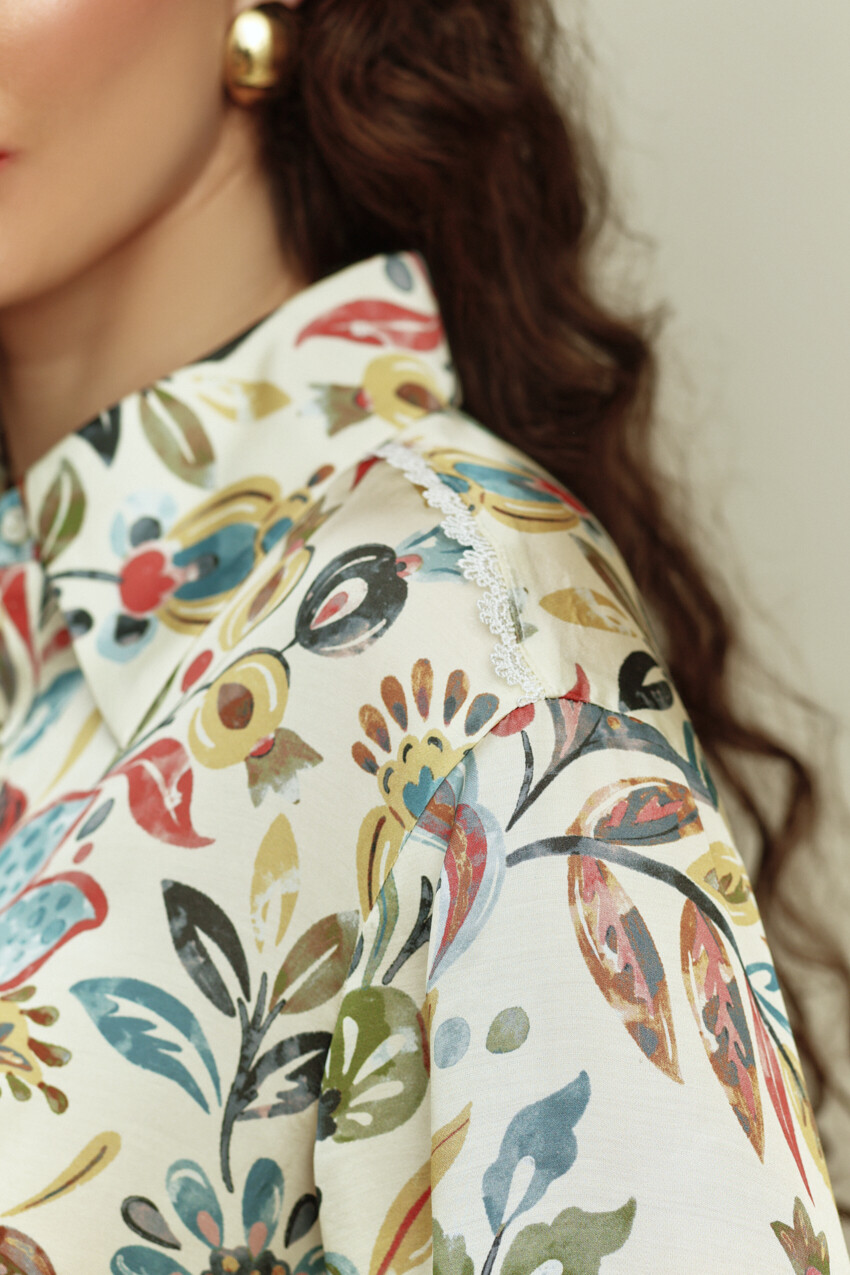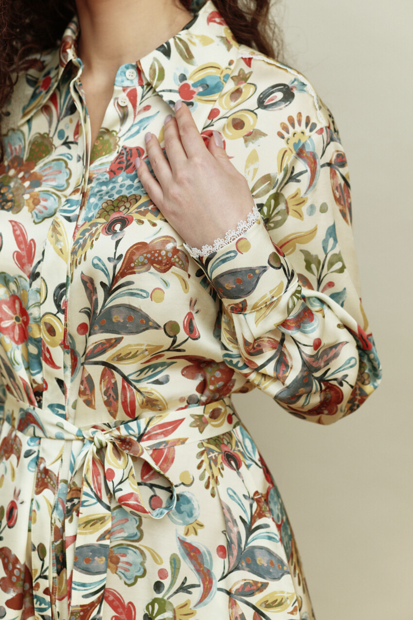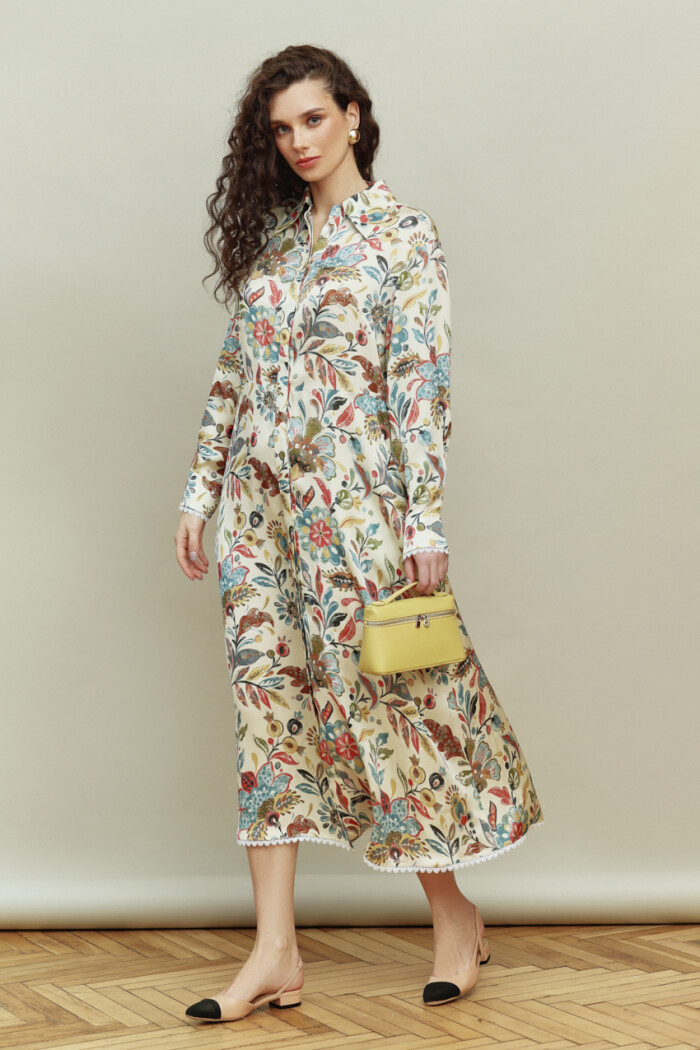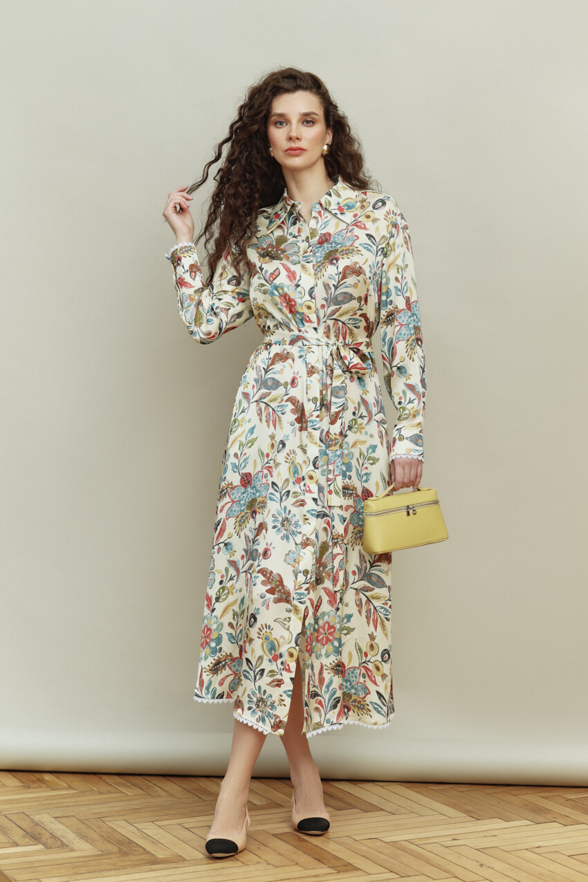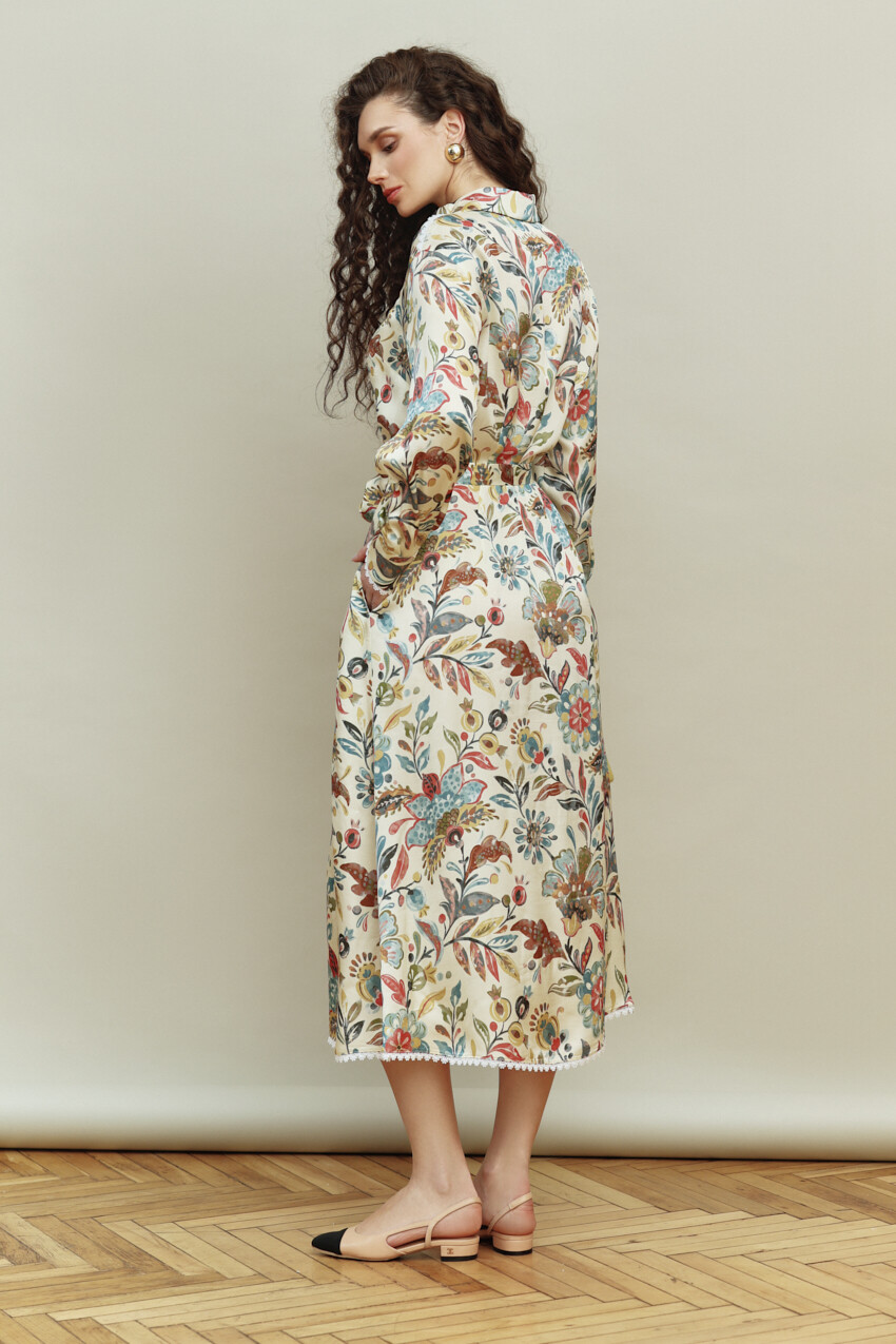 Платье в стиле smart casual выполнено из итальянского полотна с анималистическим принтом. Модель полуприлегающего силуэта, отрезная по линии талии с расширенной к низу юбкой. Воротник отложной на стойке. Для удобства в носке в боковых швах предусмотрены карманы. По центру переда потайная планка на петли и декоративные пуговицы. Рукава втачные, длинные со складками вдоль застёгивающейся манжеты. Особый вид изделию придает кружево по низу платья и манжеты. Модель комплектуется съемным плясом из основного полотна. Длина изделия 127 см; длина рукава 58 см.