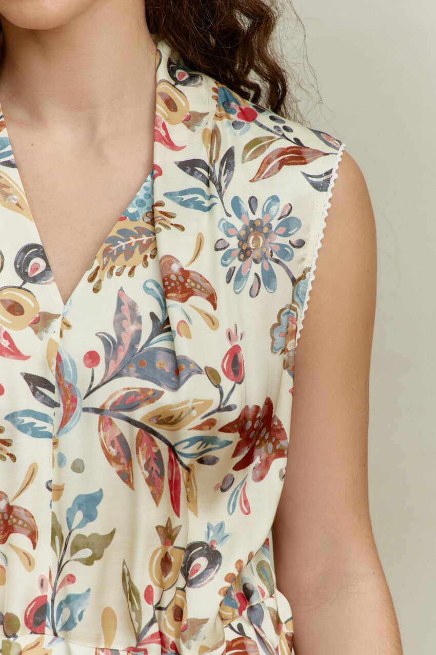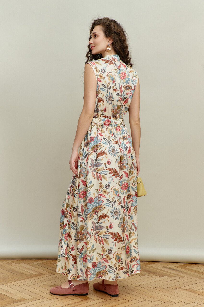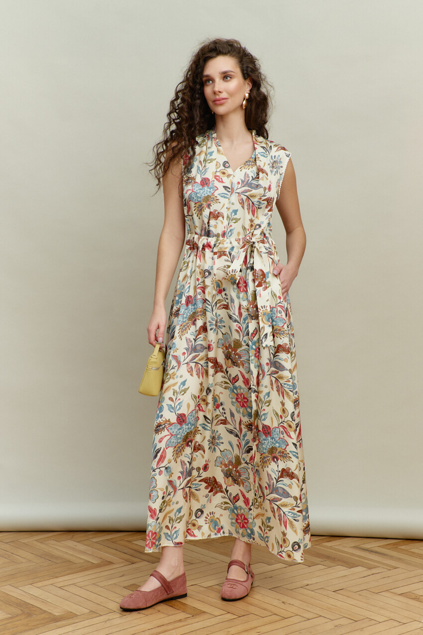 Платье в стиле smart casual выполнено из итальянского полотна с анималистическим принтом. Модель полуприлегающего силуэта, отрезная по линии талии с расширенной к низу юбкой. Цельнокроеный воротник-стойка, переходящий на перед в заложенные односторонние мягкие складки. Для удобства в носке в боковых швах предусмотрены карманы. Особый вид изделию придает кружево по пройме и низу платья. Модель комплектуется съемный завязывающийся пояс из основного полотна, протянутый в кулису на талии. Длина изделия 138 см.