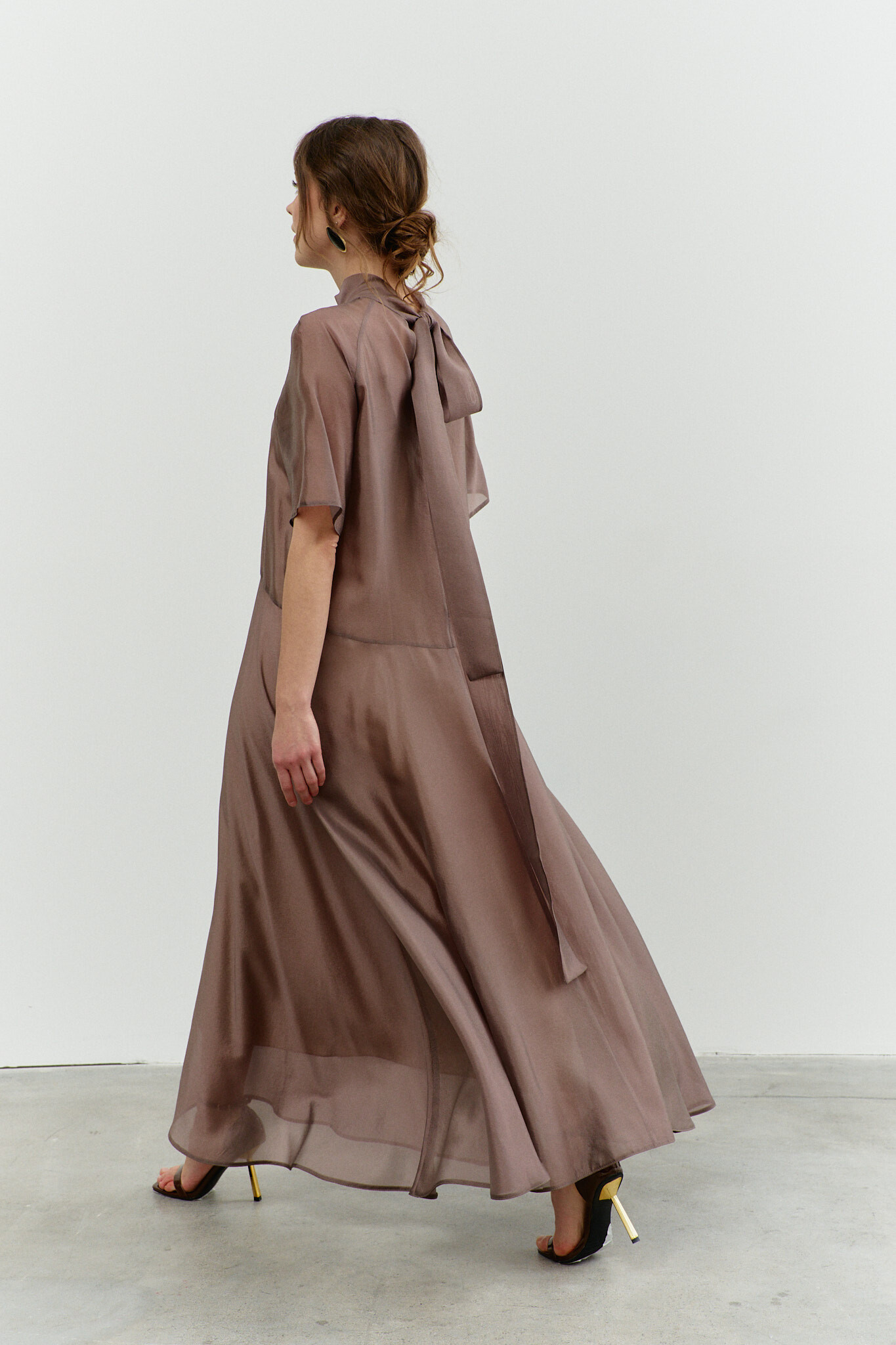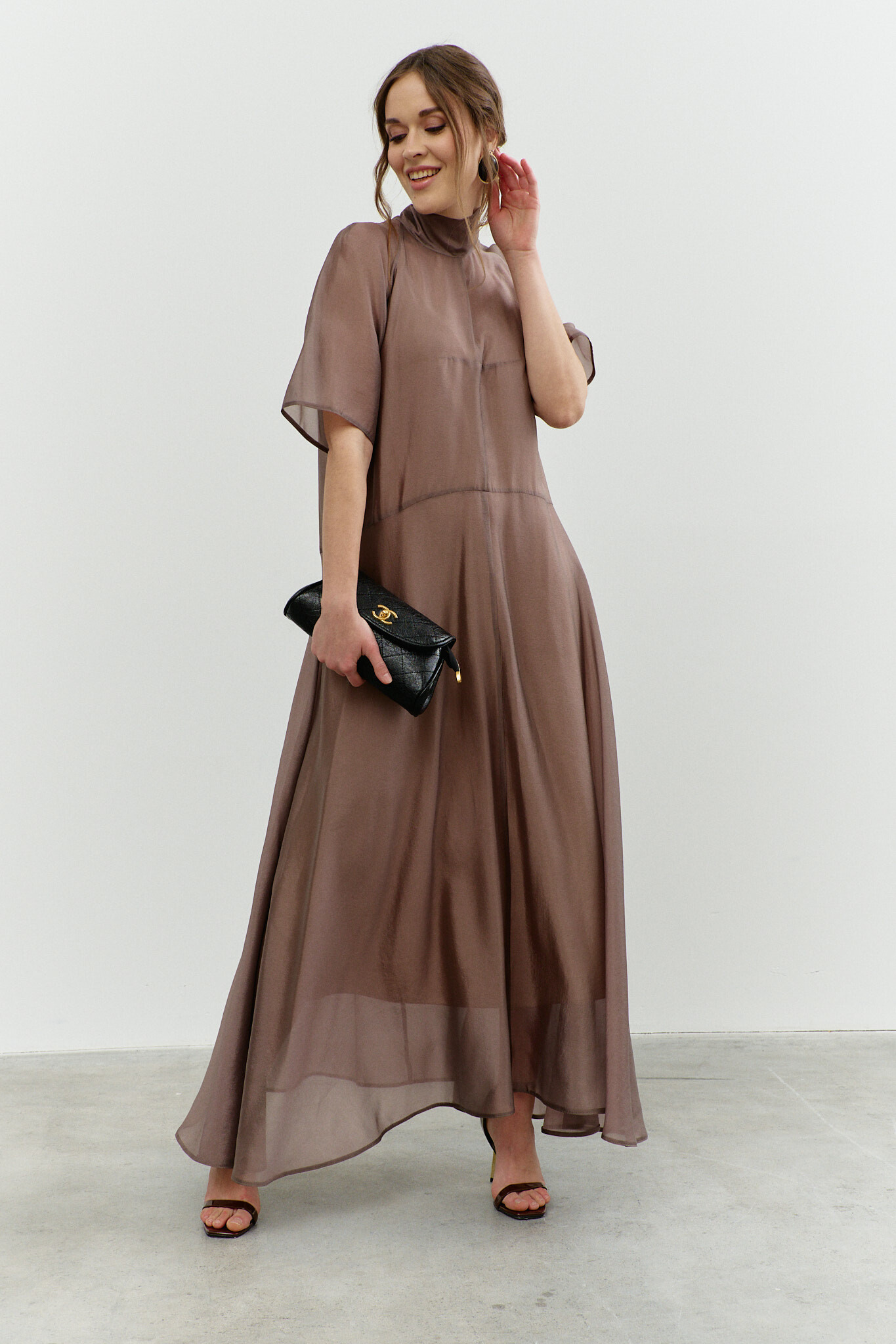 Элегантное платье в стиле City Chic выполнено из полупрозрачной вуали с лёгким блеском. Модель А-силуэта, который плавно расширяется от талии к подолу. Фигурный подрез ниже линии талии, разделяет платье на верхнюю и нижнюю часть. Воротник-стойка, переходящий на спинку в пояса-завязки. Перед верхней части платья со средним швом и стачанными горизонтальными нагрудными выточками от среднего шва к центру груди, спинка верхней части платья со средним швом, в котором от горловины вниз выполнен разрез. Рукава покроя реглан длиной выше линии локтя. Модель комплектуется комбинацией из вискозного полотна на регулируемых по длине бретелях. Длина изделия 139 см; длина рукава (от горловины) 43 см.