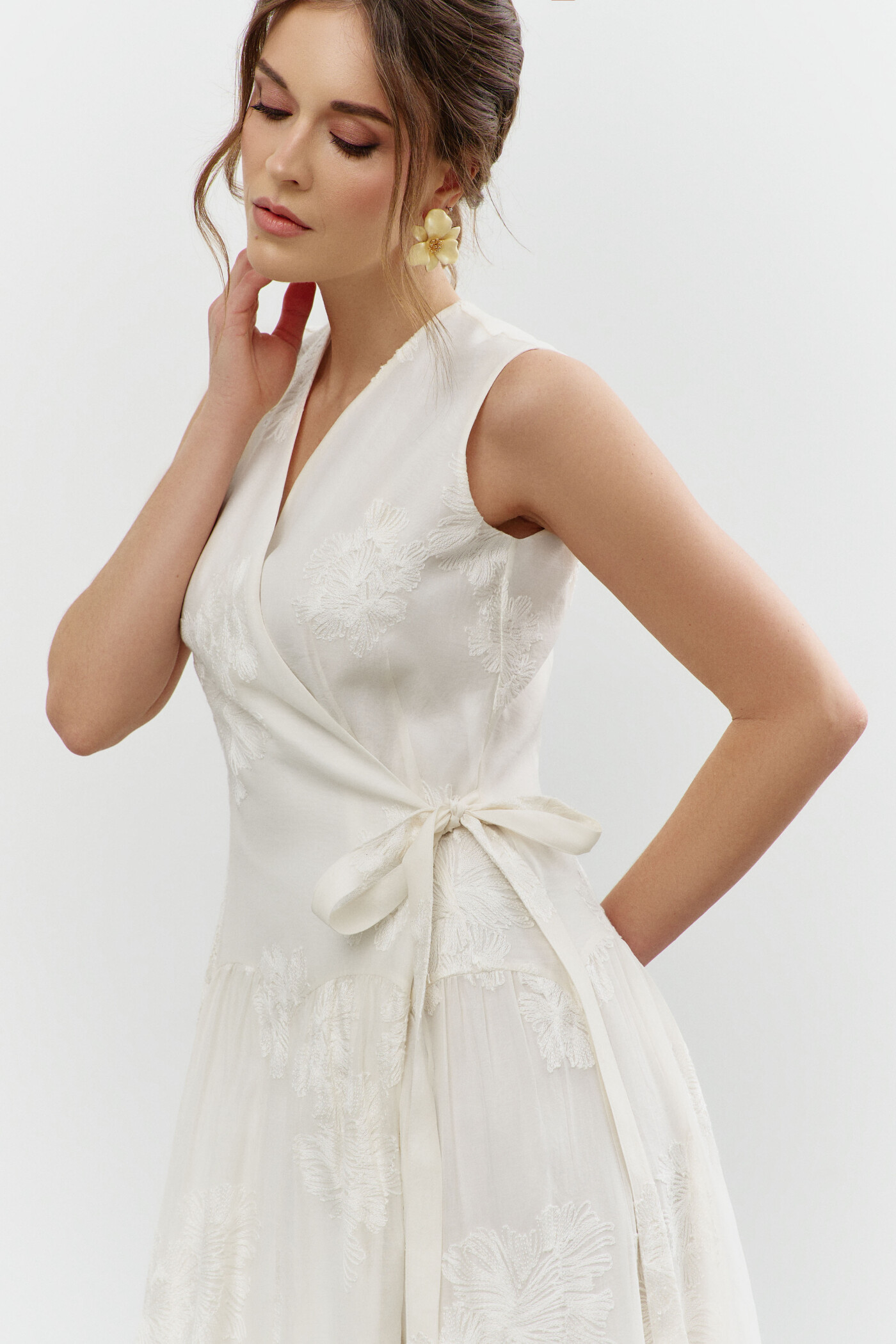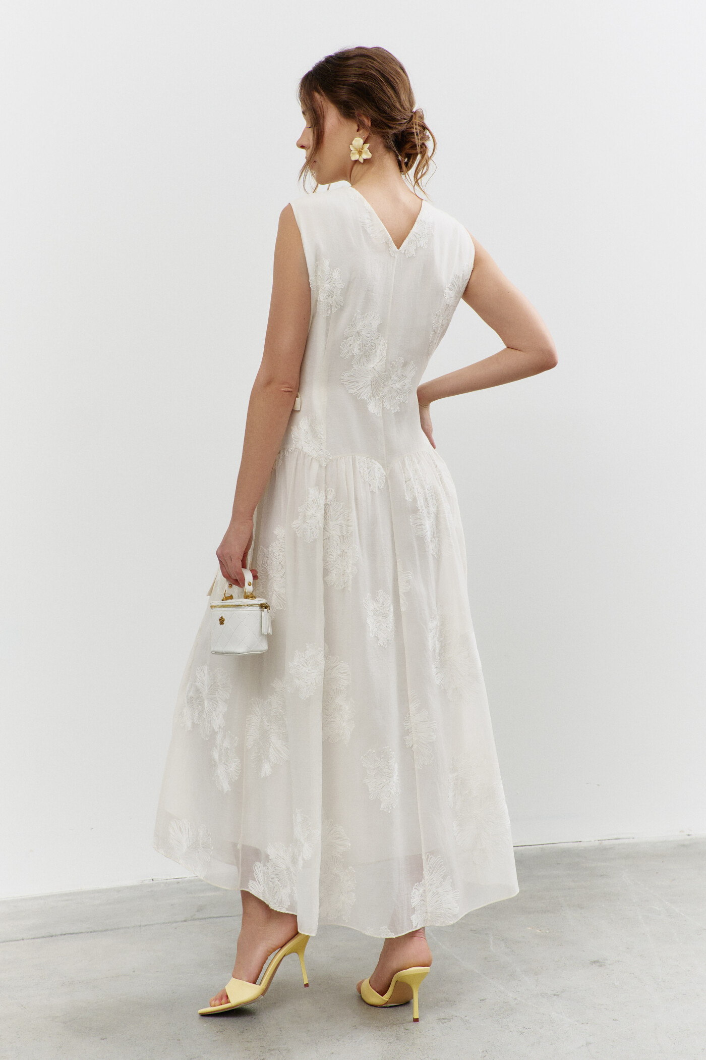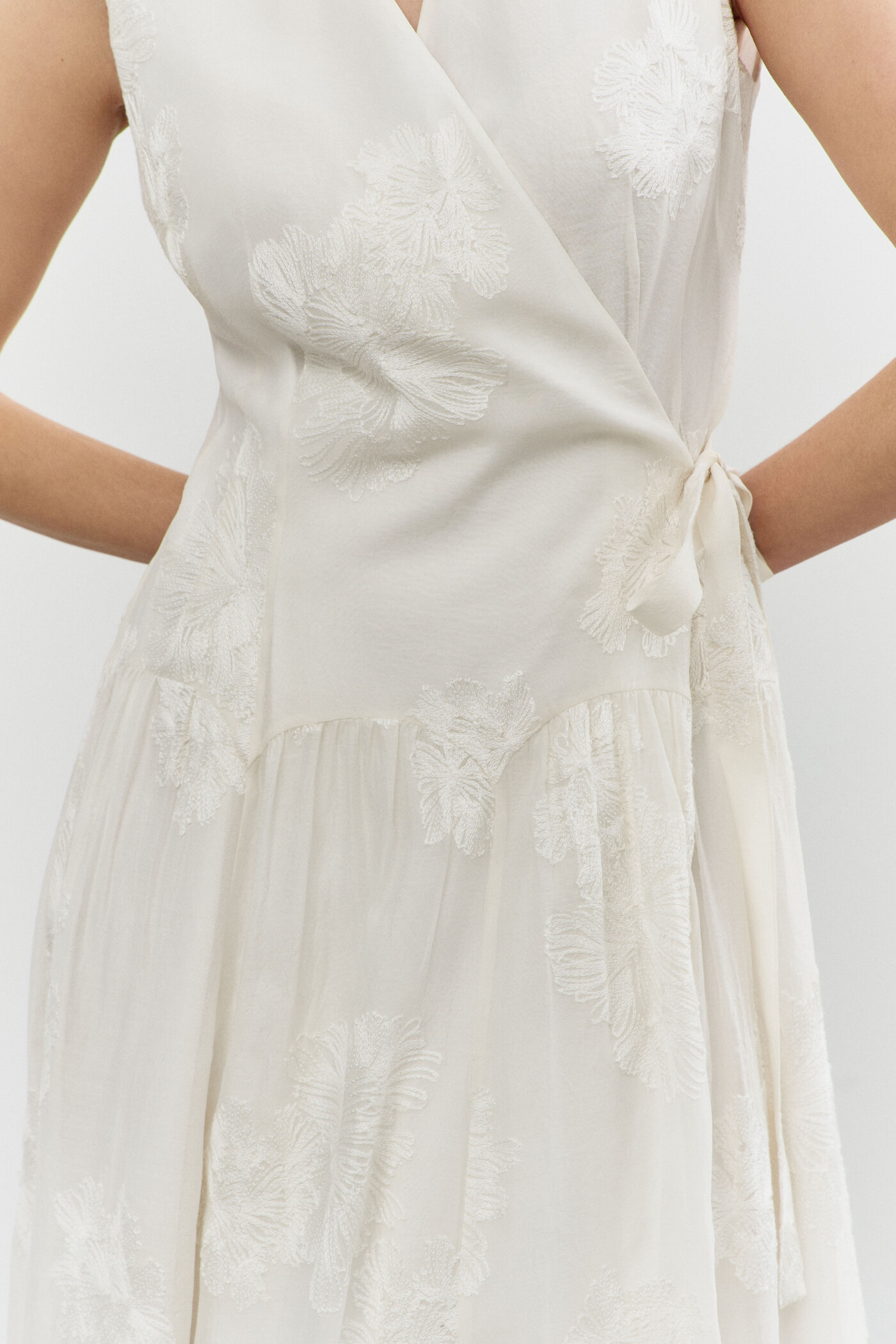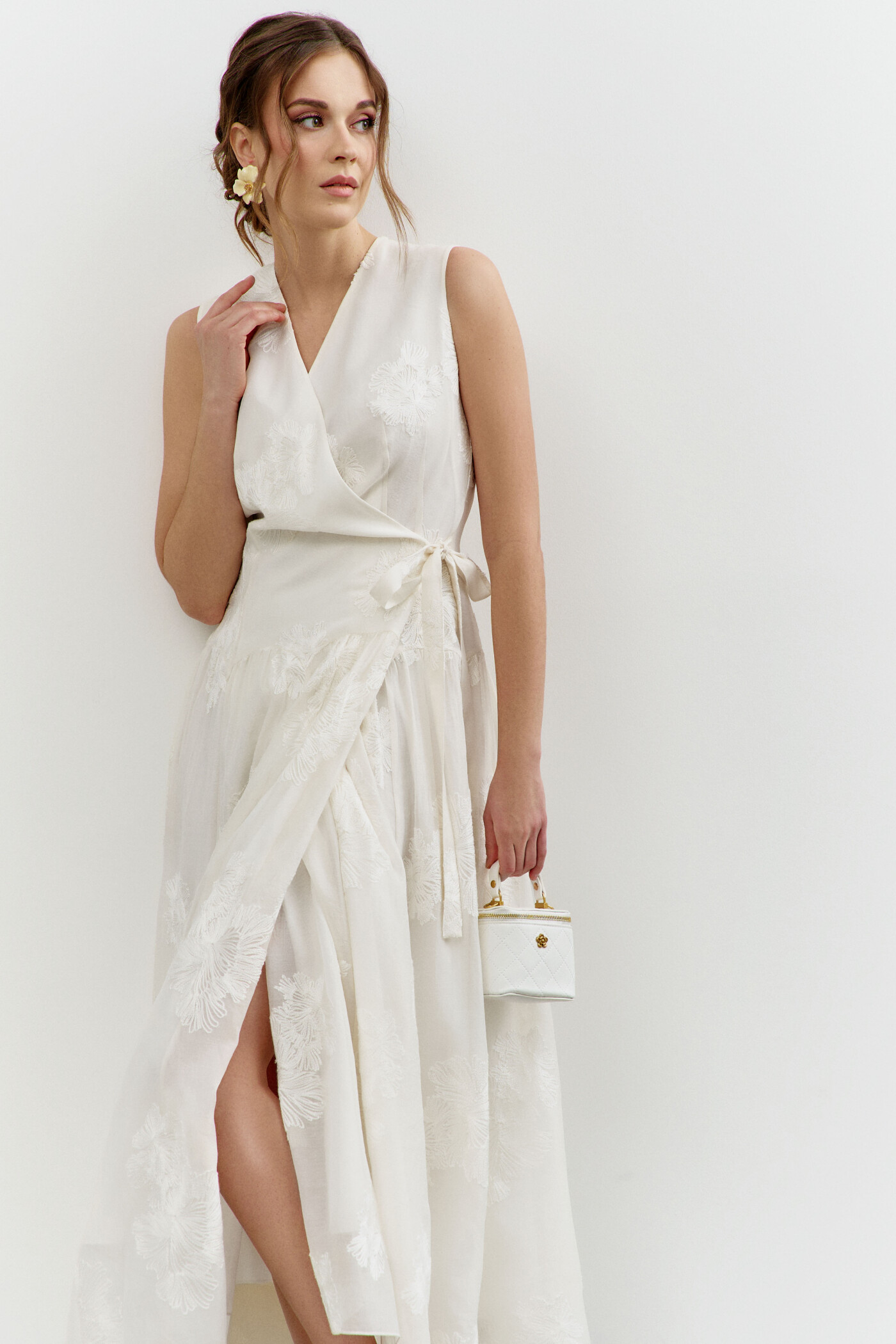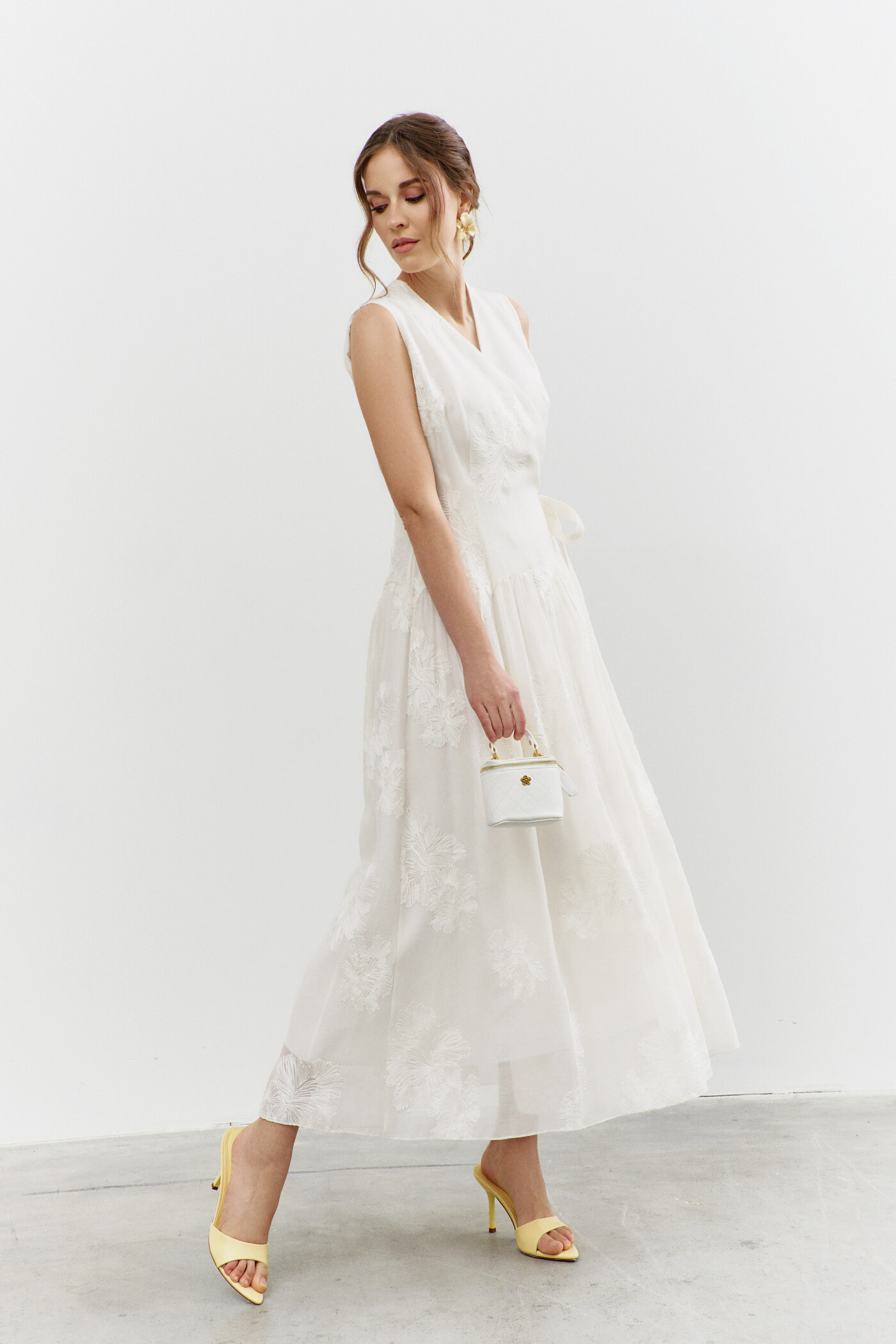 Платье в стиле smart casuaI выполнено из платьево-блузочной тафты. Модель полуприлегающего силуэта со спущенной линией плеча. На передней части застрочены глубокие складки из которых выходит пояс из основной ткани завязывающийся на бант. По спинке широкая эластичная лента. V-образная горловина. Рукава свободные, длины 7/8. Для удобства в носке в боковых швах предусмотрены карманы и разрезы. Длина изделия по спинке 130см; длина рукава (от горловины) 62см.