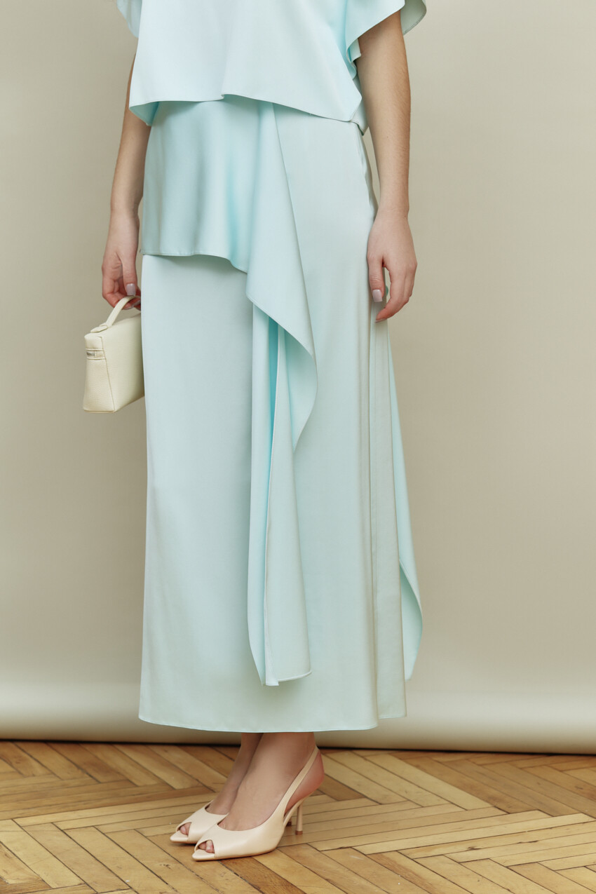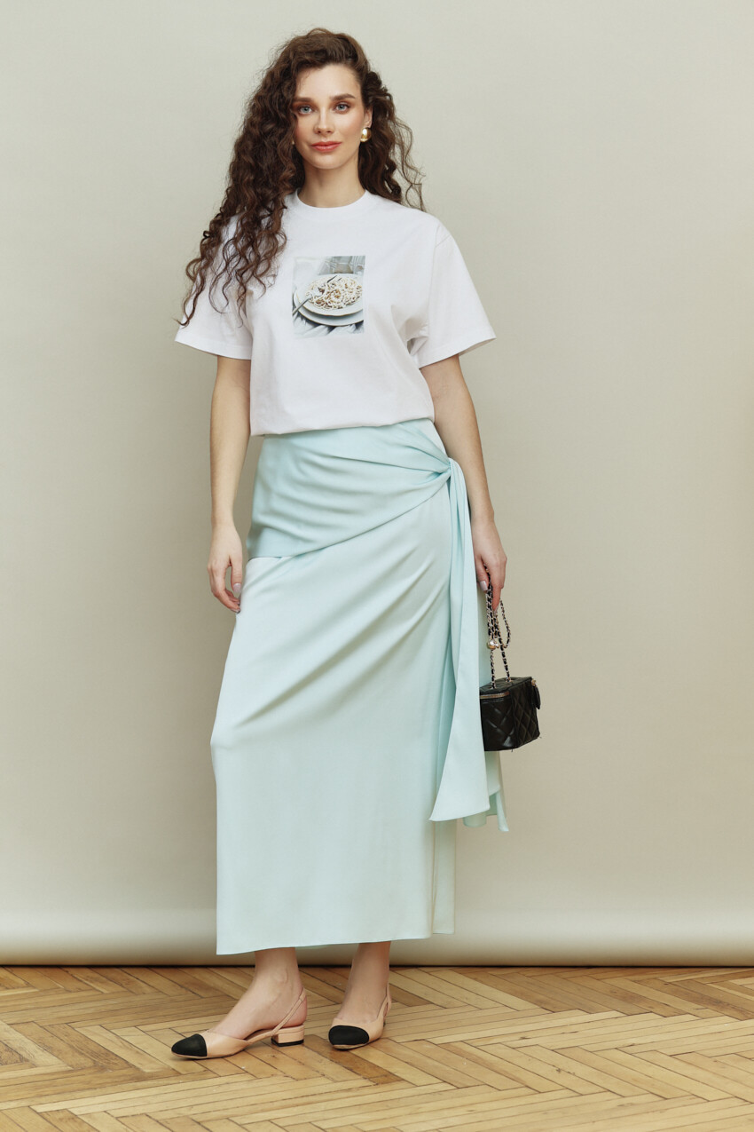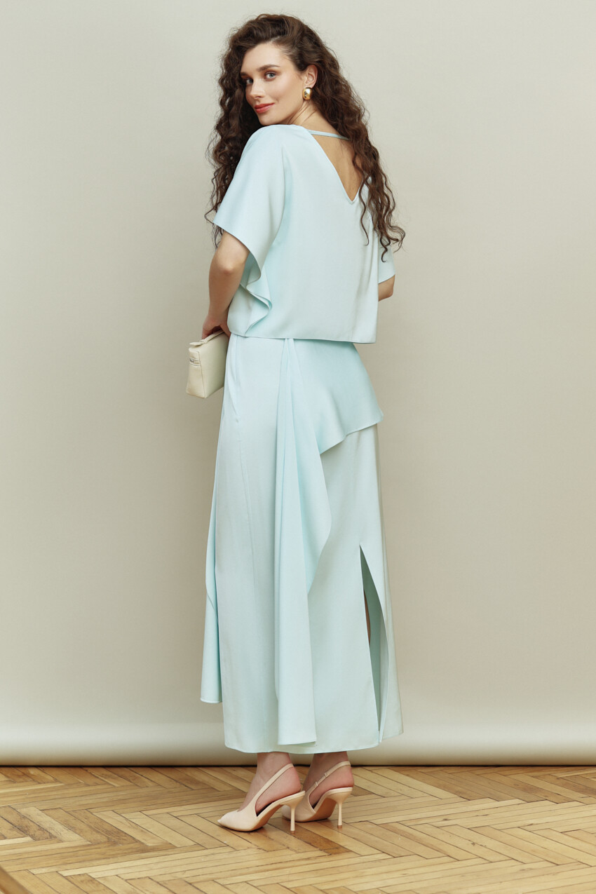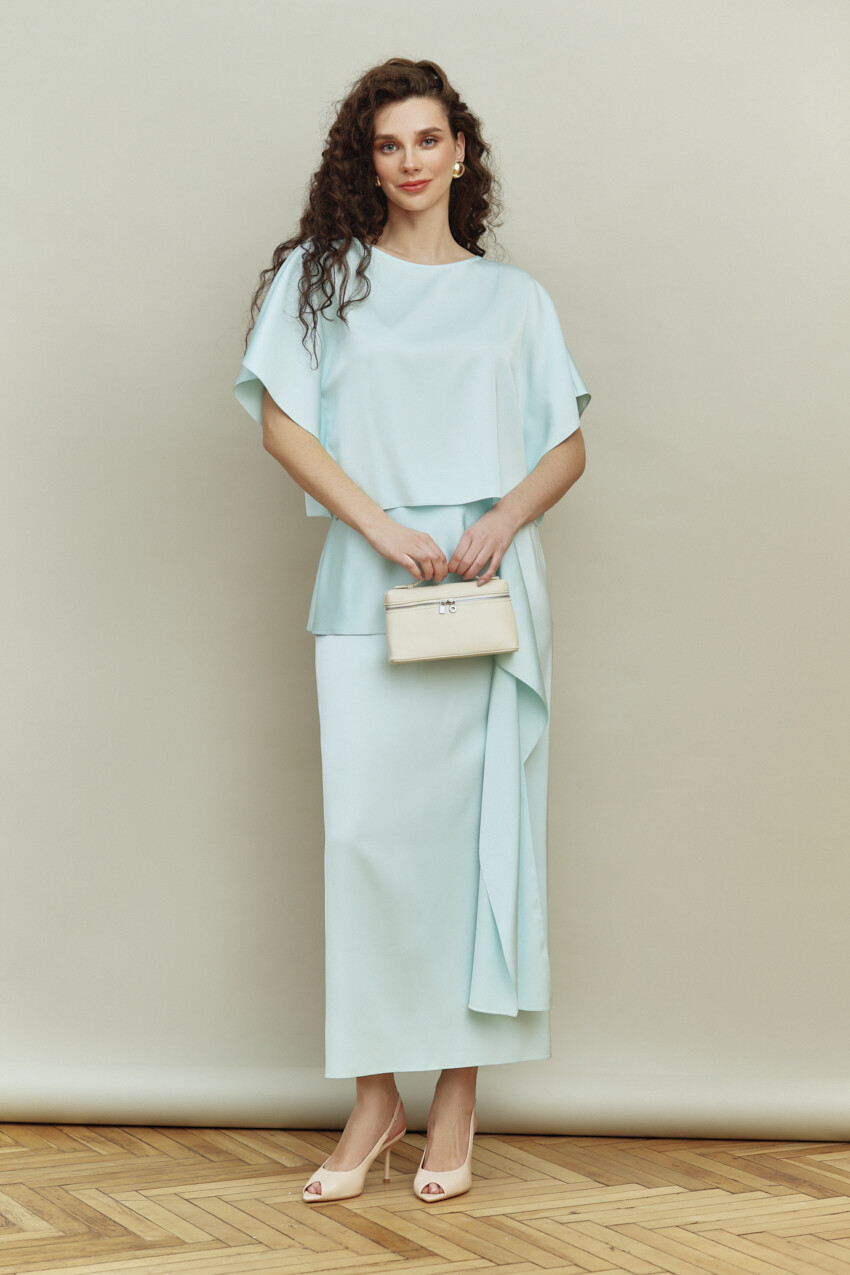Юбка в стиле в стиле city chic выполнена из струящегося сатинового полотна с благородным блеском. Модель прямого силуэта, немного зауженного к низу. Особый вид изделию придаёт отлетная баска от верха (не доходя до левого бокового шва) с асимметричным низом и длиной до уровня линии бёдер, а также длинный отлетный завязывающийся пояс в мягкую драпировку. Для удобства в носке в левом боковом шве предусмотрена потайная тесьма «молния». На заднем полотнище юбки расположен средний шов, в котором обработан разрез для свободы движения. Длина по боковому шву — 97 см.