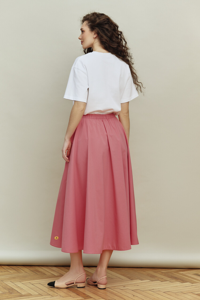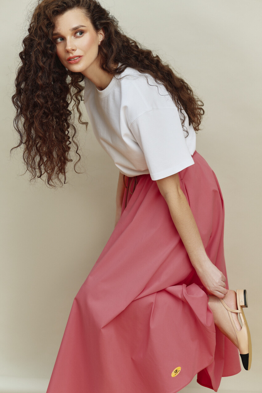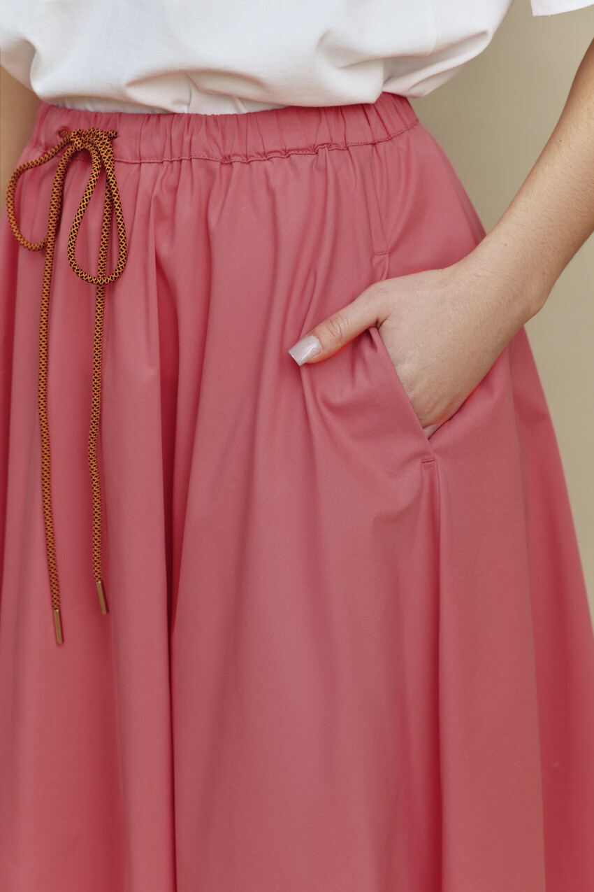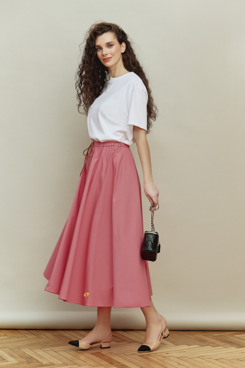 Юбка в стиле smart casual выполнена из хлопкового полотна. Модель А-образного силуэта, с комфортной высокой посадкой по линии талии, на притачном поясе с эластичной тесьмой между слоями и декоративным функциональным шнуром. Для удобства в носке в боковых швах карманы. Длина по боковому шву (с поясом) 87 см.