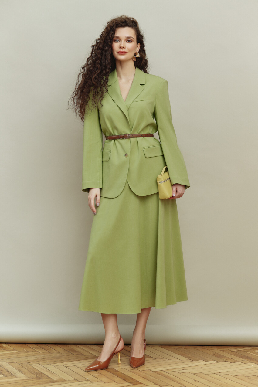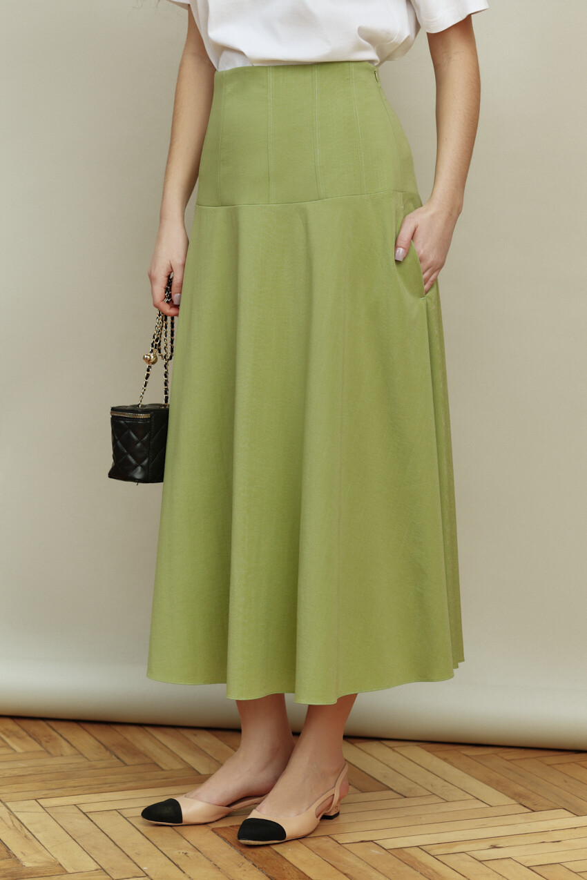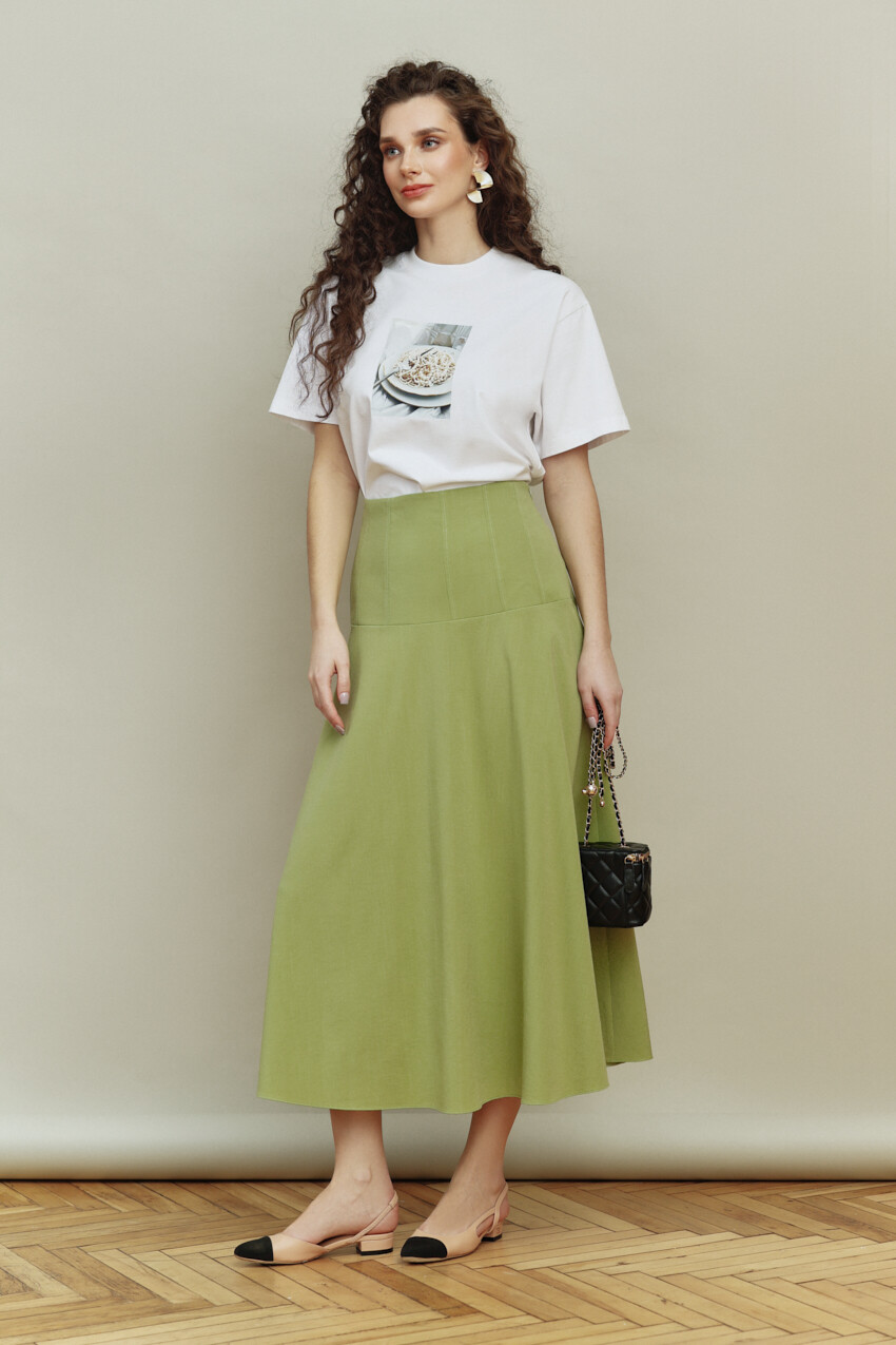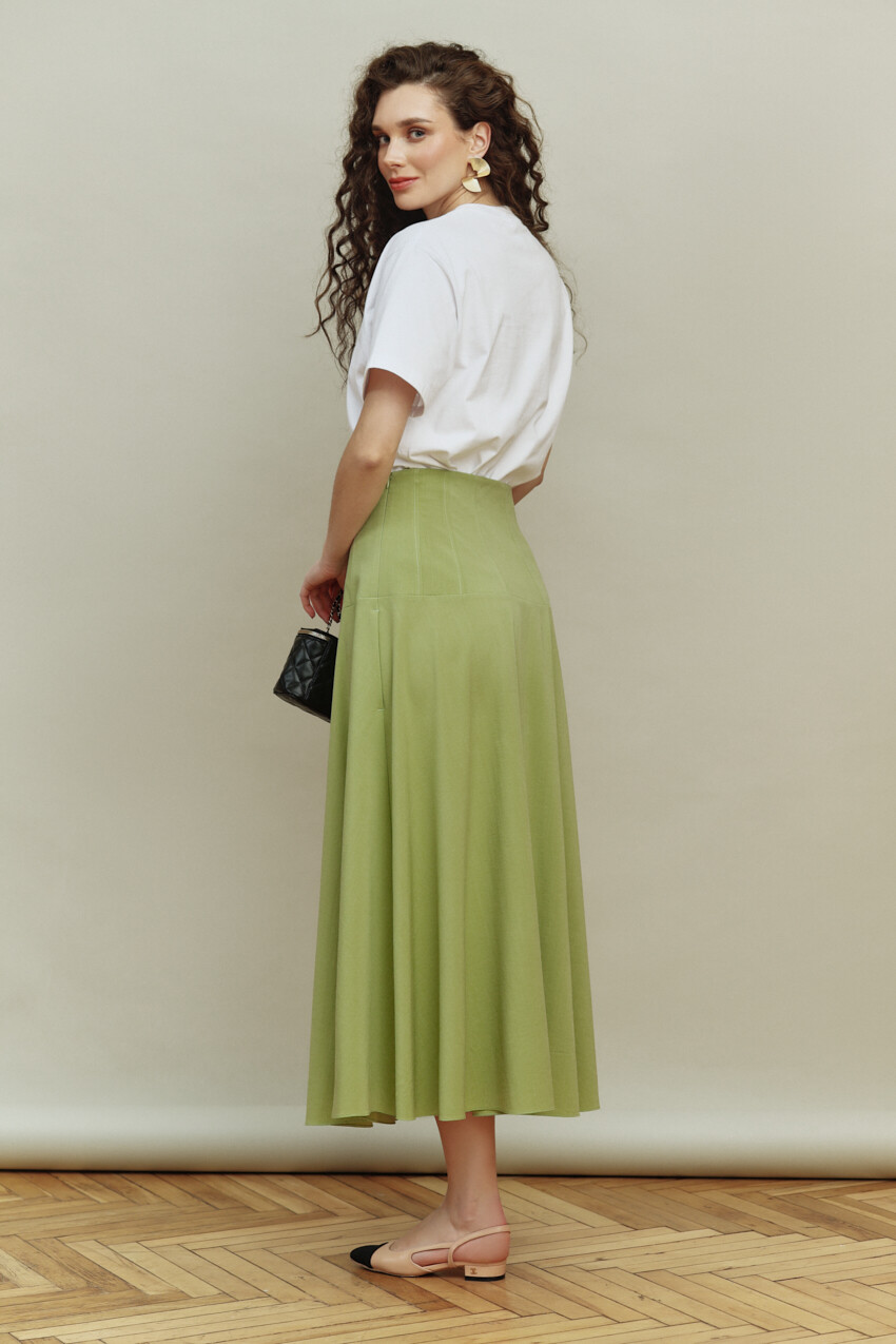 Элегантная юбка выполнена из костюмного полотна. Модель с посадкой выше линии талии с расширенным к низу силуэтом. Верх изделия на притачной кокетке с рельефами, которая декорирована отделочными строчками. В боковых швах юбки выполнены функциональные карманы «в швах», а в левом боковом шве — застёжка на потайную тесьму-молнию. Длина изделия — 90 см.