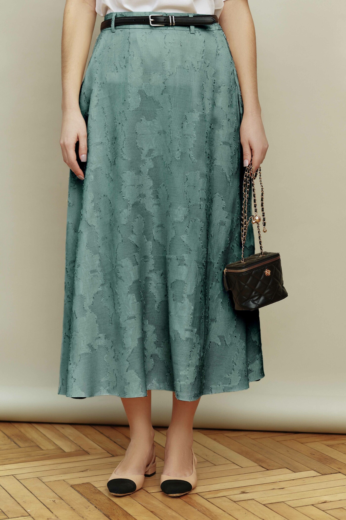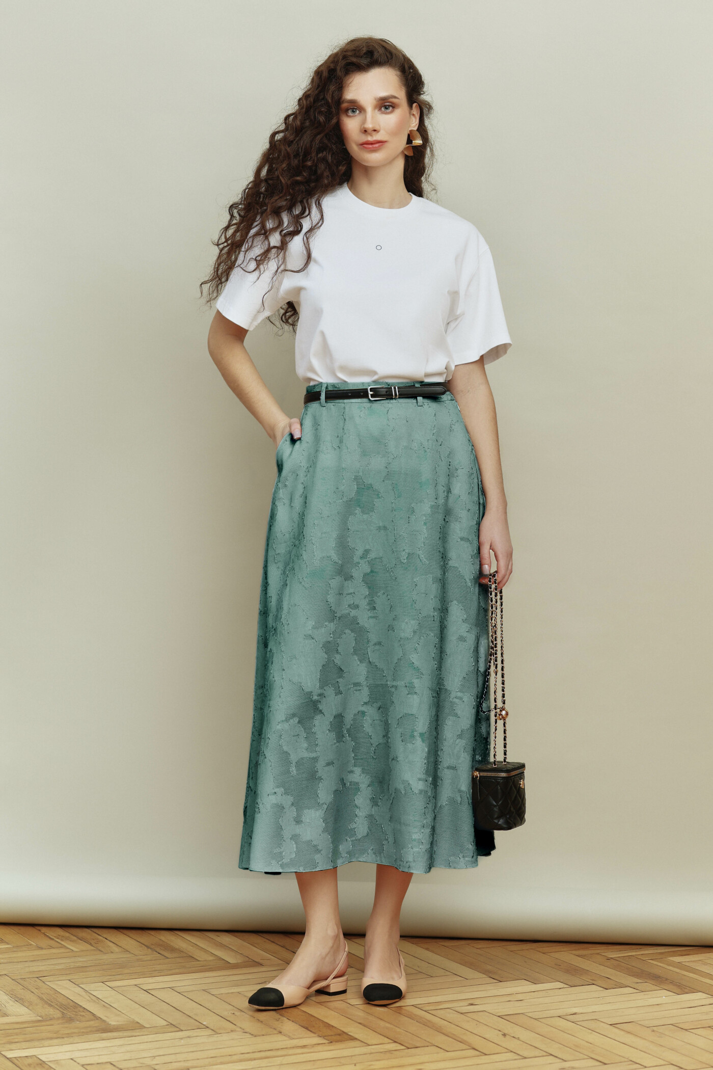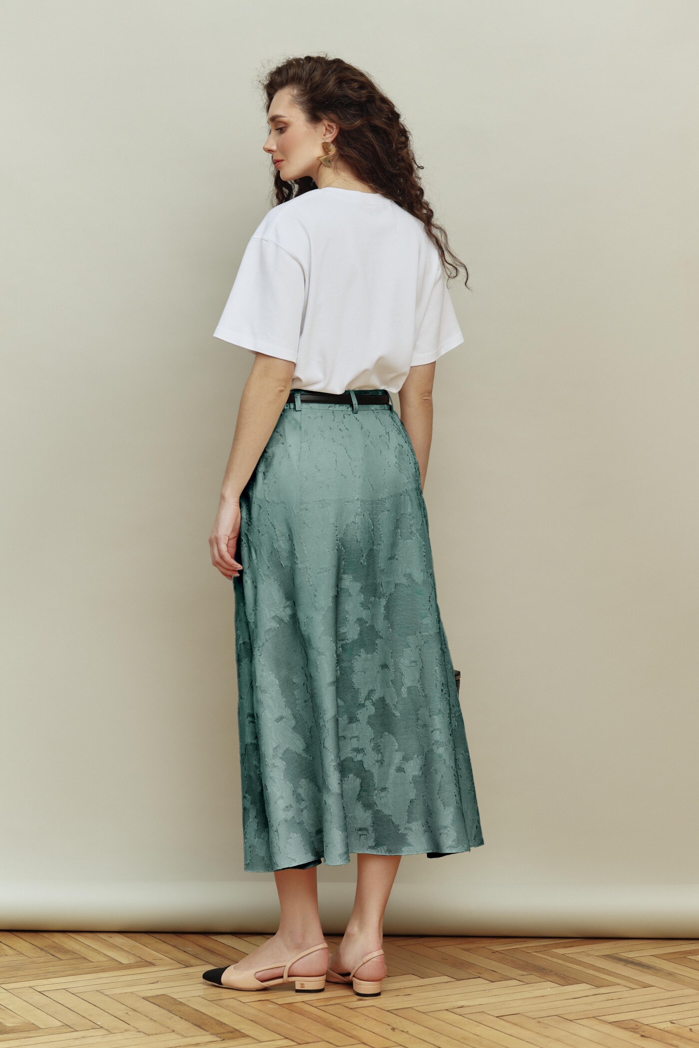 Юбка в стиле smart casual выполнена из жаккардового полотна. Модель А-образного силуэта, с комфортной высокой посадкой по линии талии, с притачным поясом со шлевками. В боковом шве спинки потайная тесьма "молния" и застёгивающейся на потайной брючный крючок. Модель на подкладке из вискозного полотна. Длина по боковому шву (с поясом) 90 см.