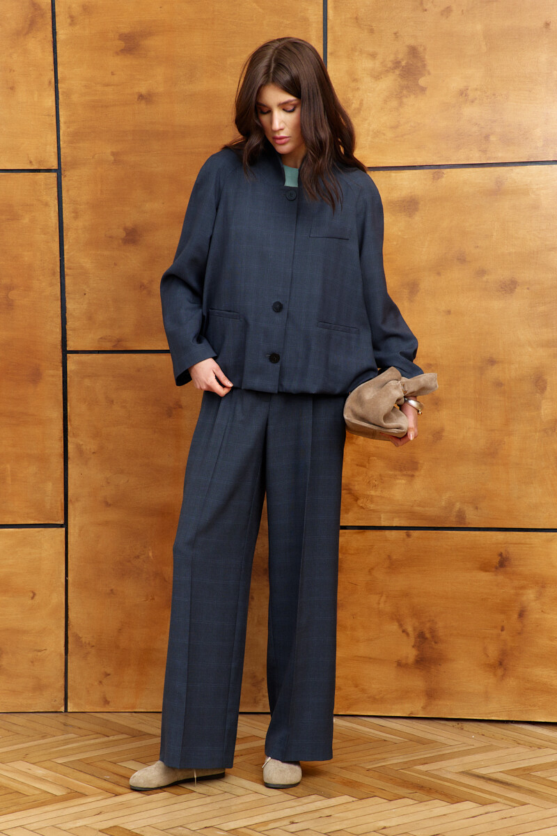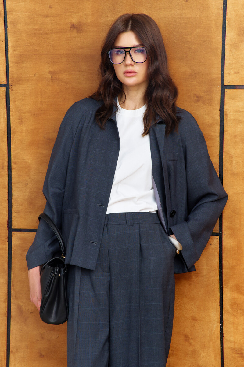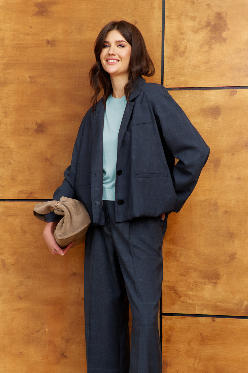 Стильный и практичный жакет на подкладке является отличным выбором для создания разнообразных модных образов. Изделие выполнено из костюмного полотна, в основе которого лежит клетка. Модель A-образного силуэта. Воротник отложной с отрезной стойкой, центральная застёжка на петли и декоративные пуговицы. Особенностью модели является присборенный низ, который создаёт эффект лёгкой драпировки. Для удобства в носке спереди предусмотрены прорезные карманы «с листочкой» и декоративная нагрудная листочка. Длинные двухшовные рукава реглан со шлицей на петлях и декоративными пуговицами. Длина изделия 60 см; длина рукава (от горловины) 75 см.