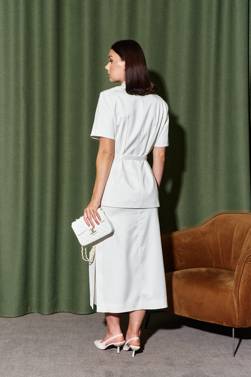 Оригинальный однобортный жакет на подкладке выполнен из костюмного полотна. Модель полуприлегающего силуэта с расширенной линией плеча. Воротник отложной с лацканами «ласточкино крыло». Особый вид изделию придаёт талиевые выточки, обработанные на лицо и по переду рельеф в виде складки переходящие в пройму спинке. Рукава втачные короткие. Длина изделия по спинке 71 см; длина рукава 26 см.