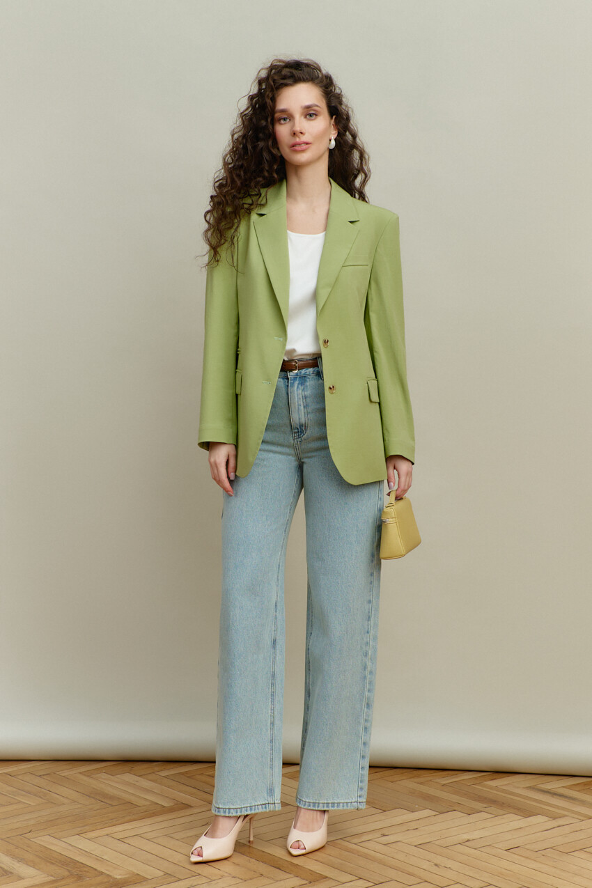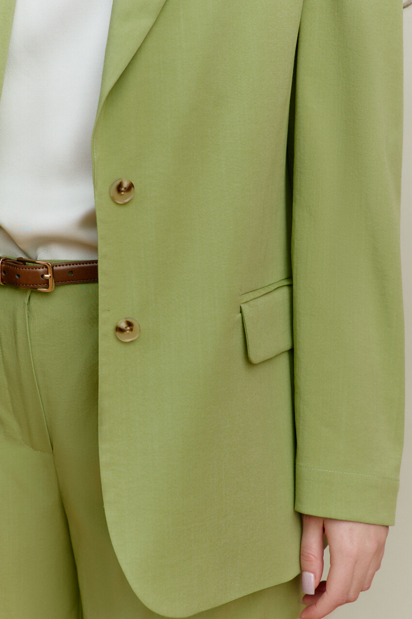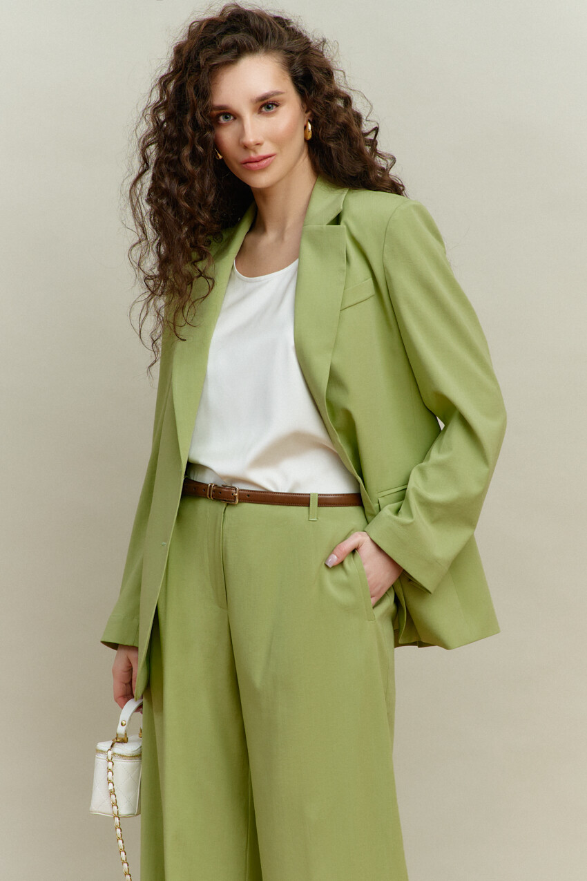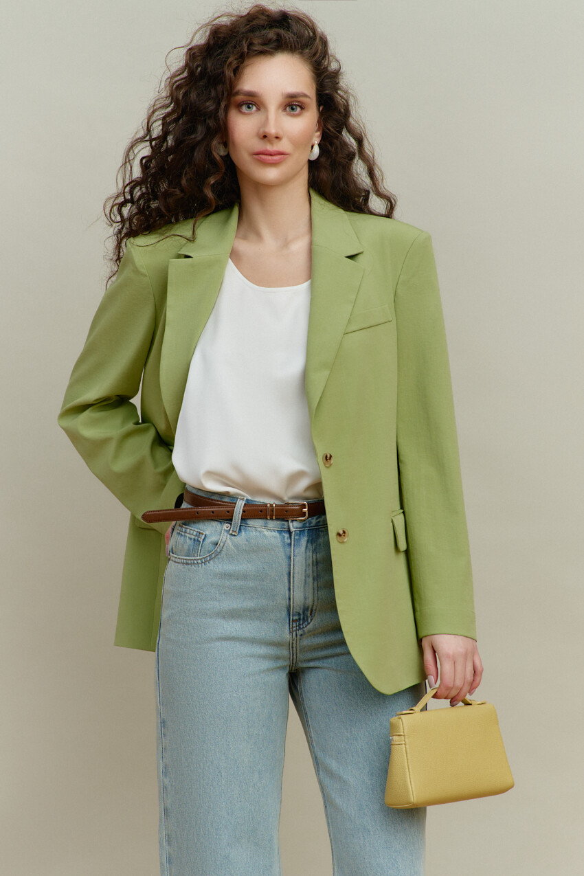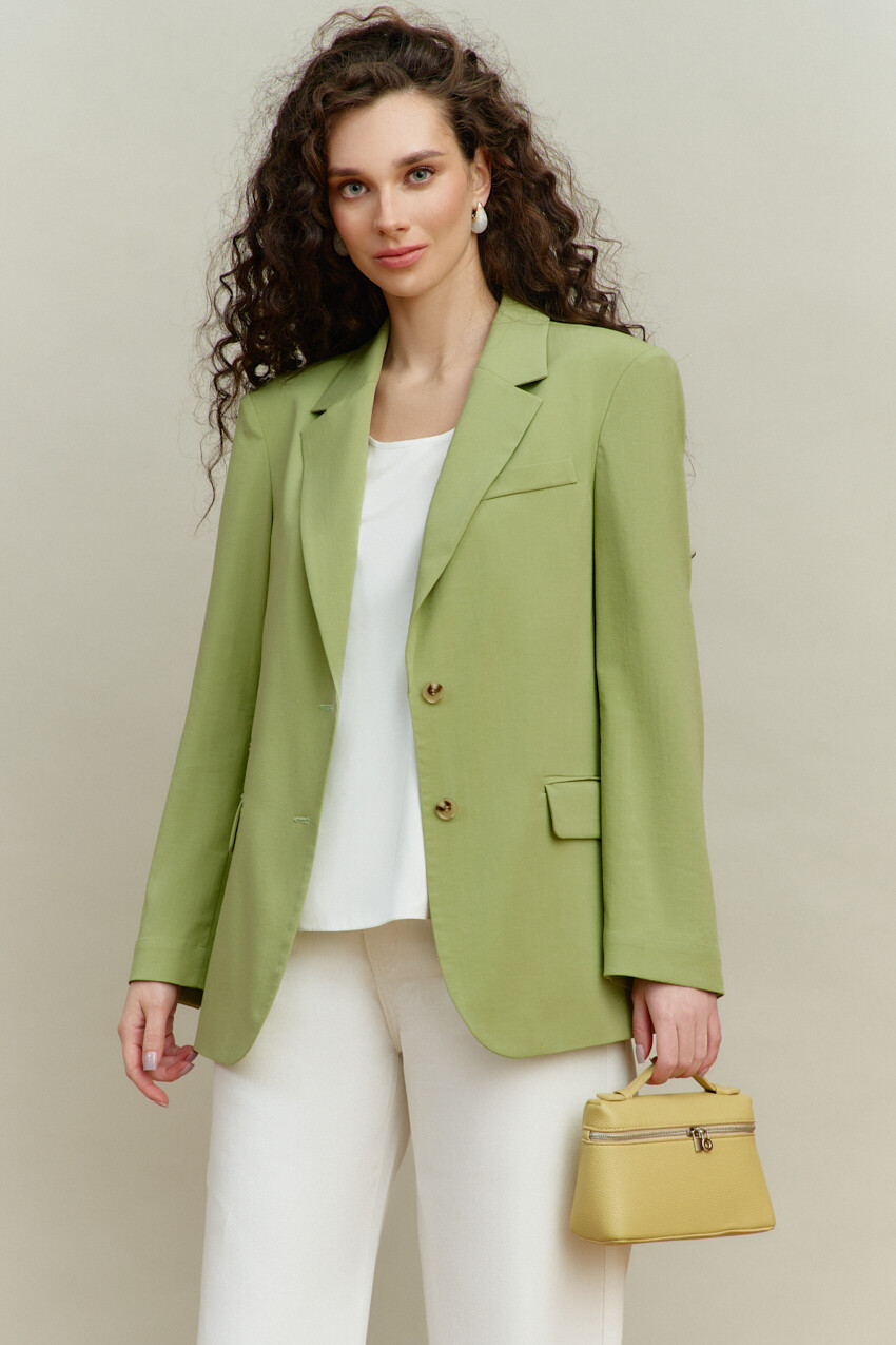 Элегантный однобортный жакет выполнен из костюмного полотна. Модель свободного силуэта с закругленными бортами. Воротник отложной с лацканами классической формы. Для удобства в носке спереди предусмотрены прорезные карманы "в рамку" с клапаном. Внутренние швы окантованы, детали переда и плечевой пояс спинки на подкладке. Рукава втачные, длинные. Особый вид изделию придает высокая шлица по спинке с петлей и декоративной пуговицей. Длина изделия 71 см; длина рукава 60 см.