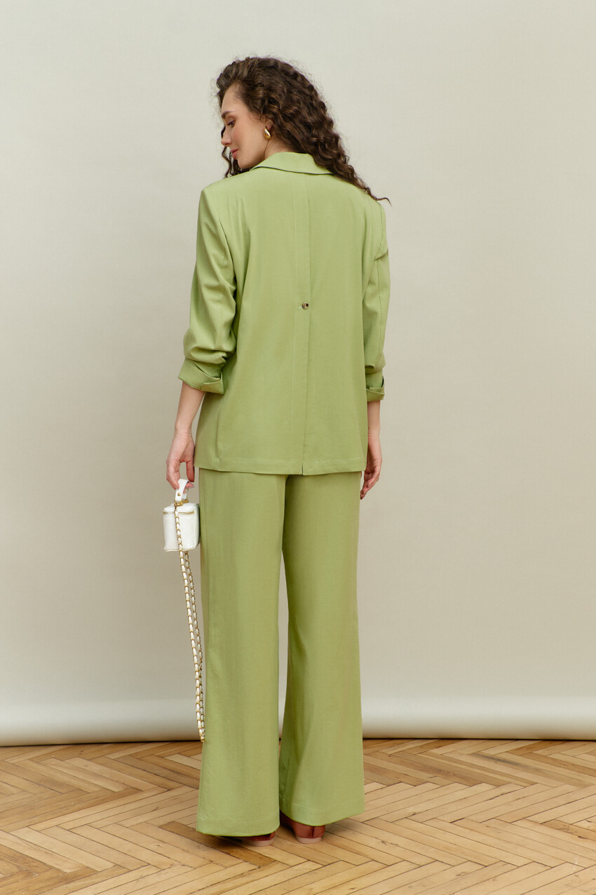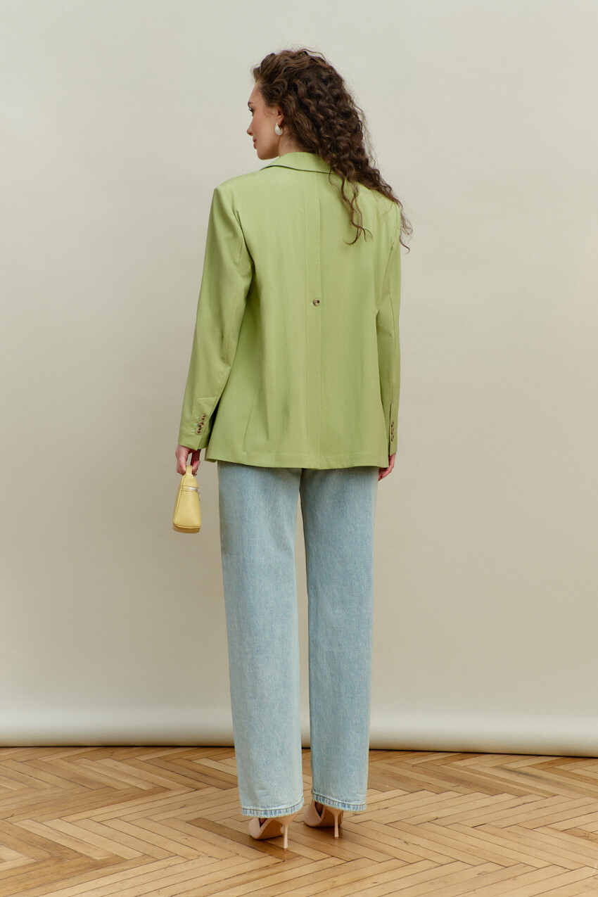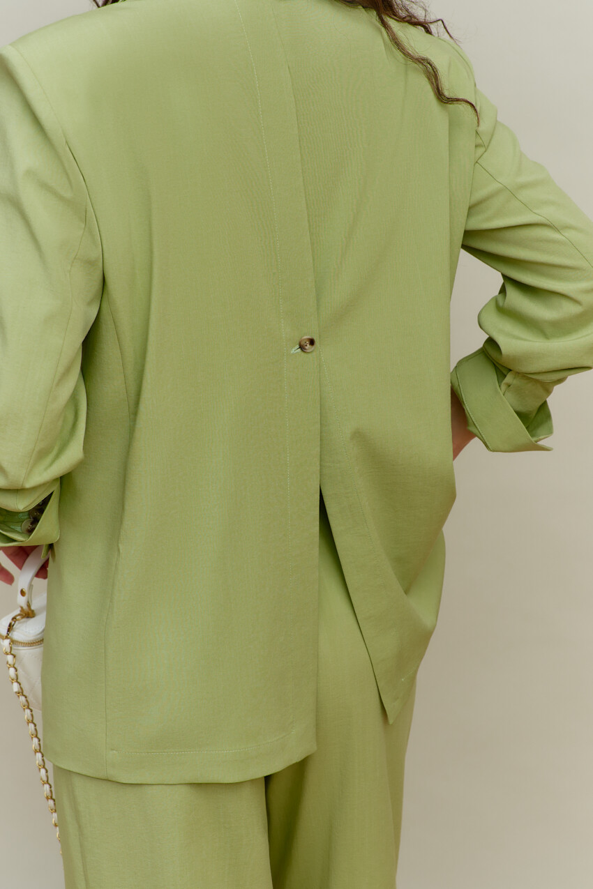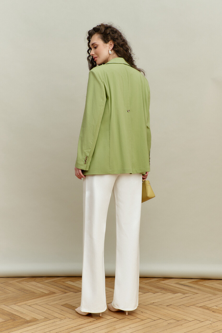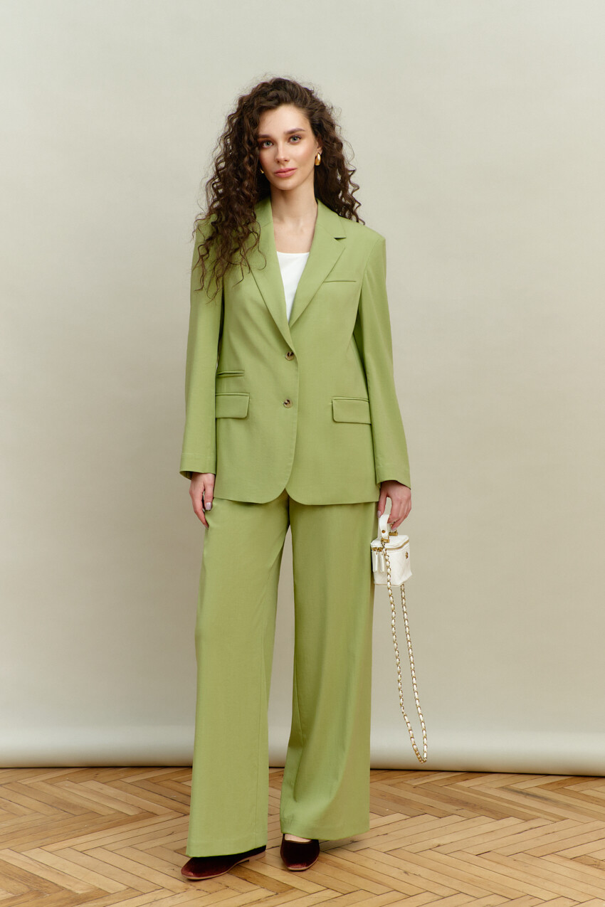 Элегантный однобортный жакет выполнен из костюмного полотна. Модель свободного силуэта с закругленными бортами. Воротник отложной с лацканами классической формы. Для удобства в носке спереди предусмотрены прорезные карманы "в рамку" с клапаном. Внутренние швы окантованы, детали переда и плечевой пояс спинки на подкладке. Рукава втачные, длинные. Особый вид изделию придает высокая шлица по спинке с петлей и декоративной пуговицей. Длина изделия 71 см; длина рукава 60 см.