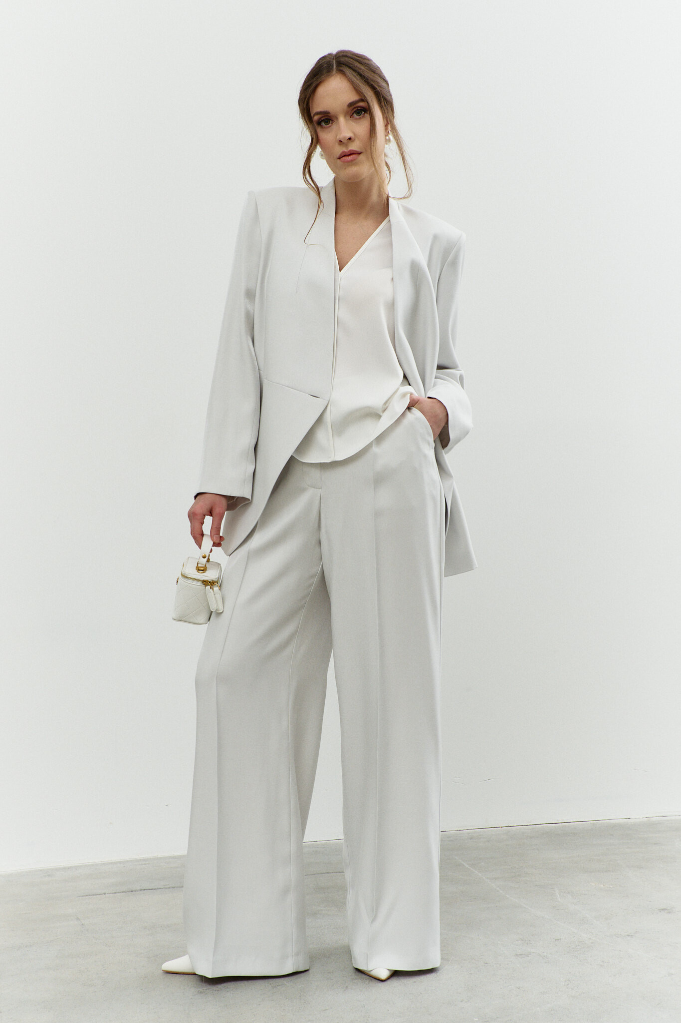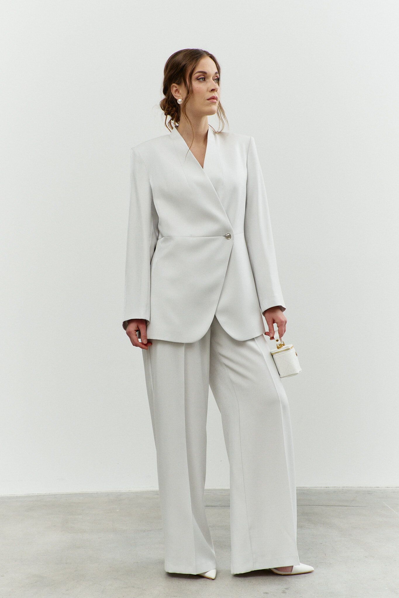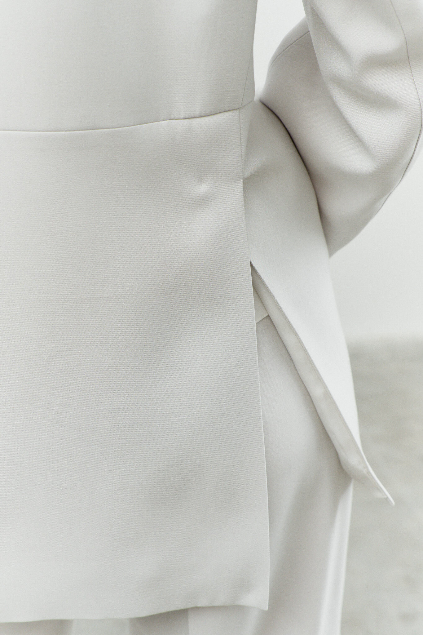 Элегантный двубортный жакет в стиле city chiс выполнен из костюмного полотна. Модель прямого силуэта, на подкладке. Горловина V-образной формы, с воротником-стойкой со стороны спинки. По переду и спинке подрез на линии талии. Спинка жакета с отлетными высокими шлицами от подреза до низа жакета. Рукава втачные, длинные со шлицей. Длина изделия 72 см, длина рукава 62 см.